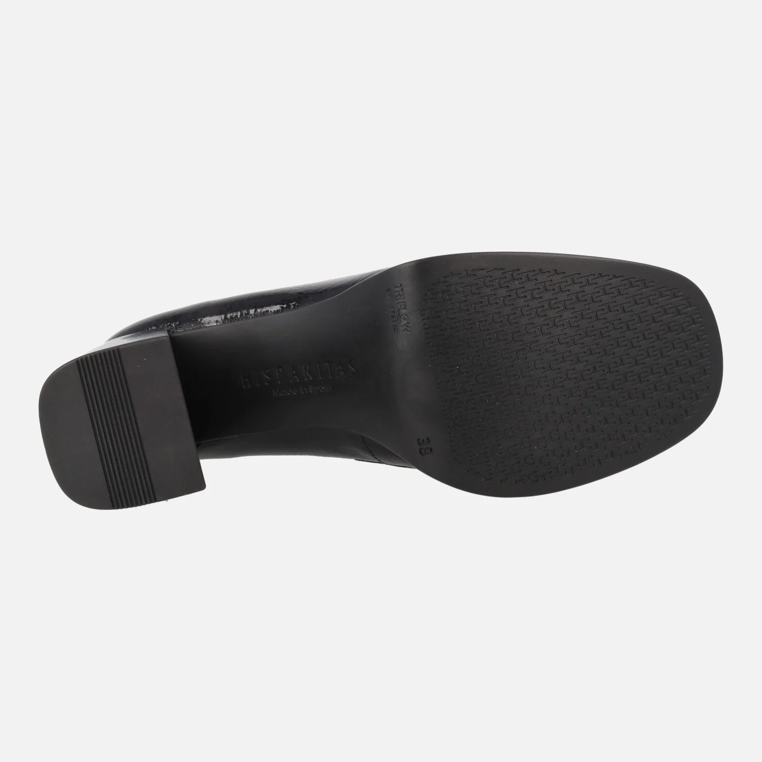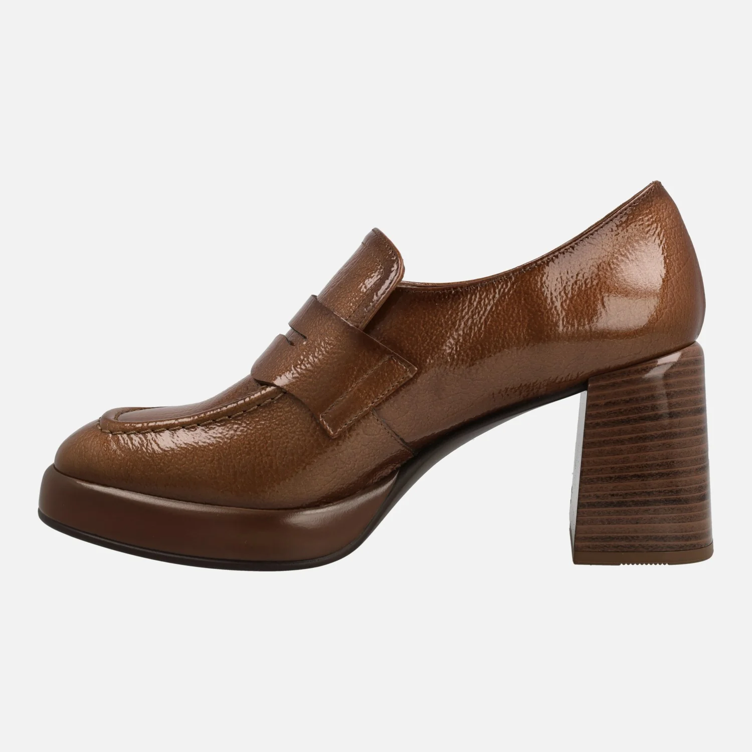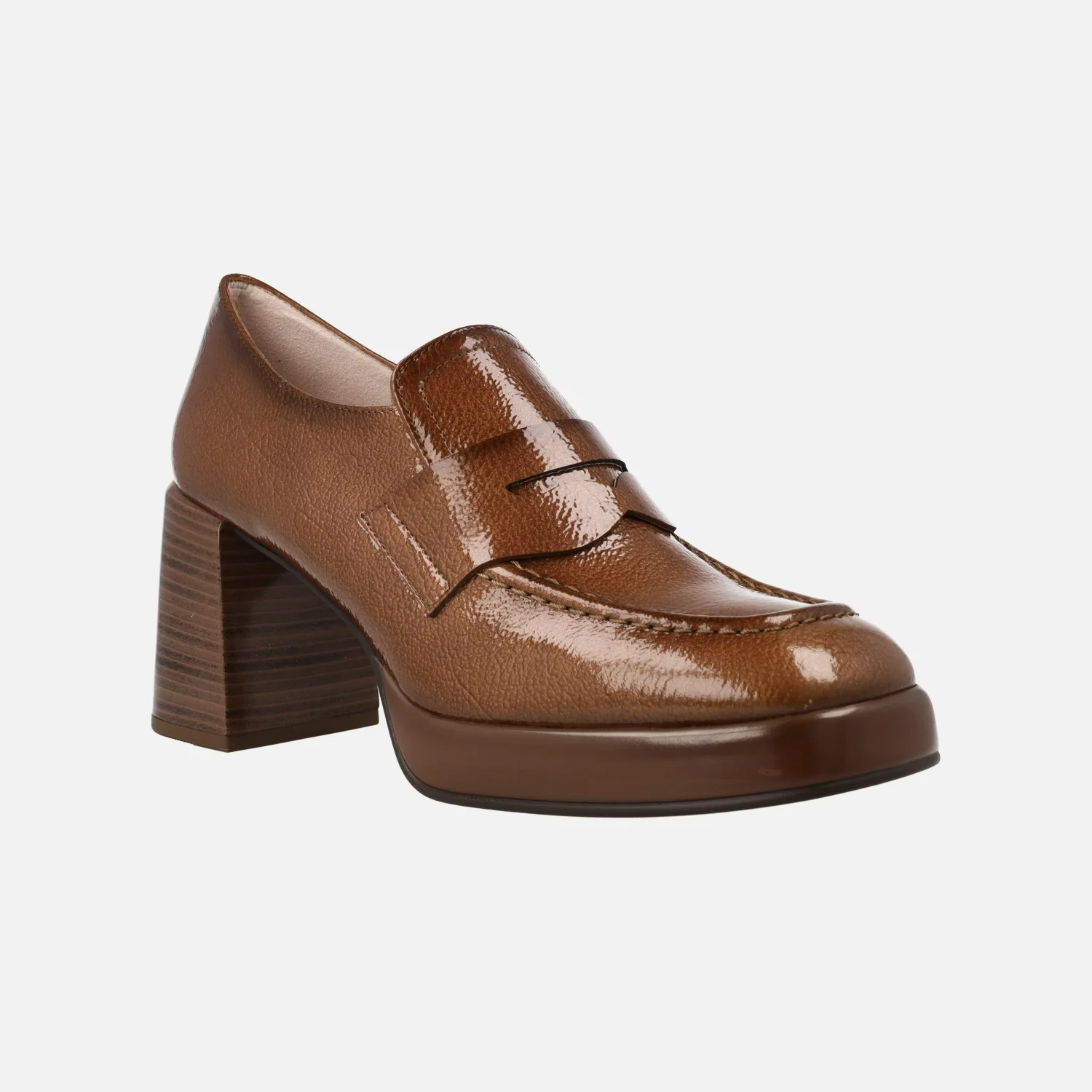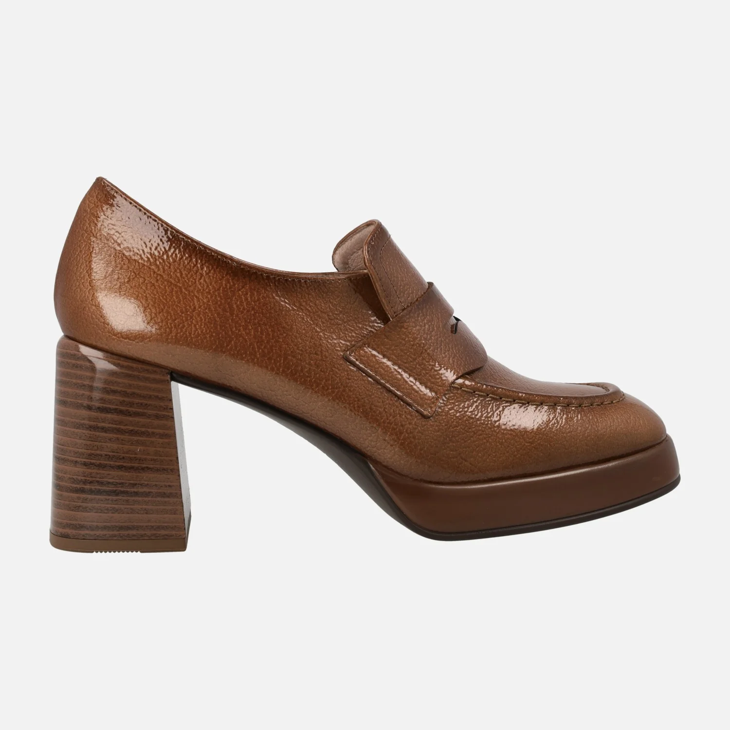 Zapatos mocasines para mujer de la marca Hispanitas modelo HI243696, disponibles en cuero y en negro. Mocasines de tacón alto y plataforma, elaborados en piel charol con adorno de antifaz. Interiores en microfibra. Tacones de 7,5 cms de altura (2 cms plataforma delantera). Sistema TRIFLOW de triple almohadillado, para un gran confort a la hora de caminar. Made in Spain.