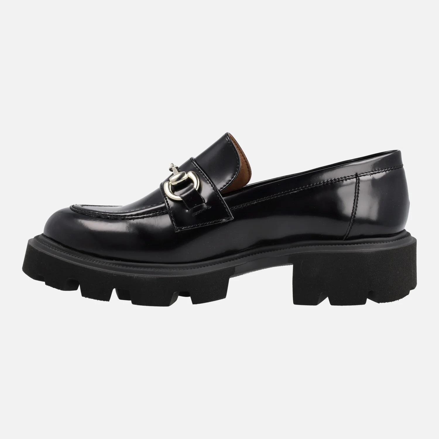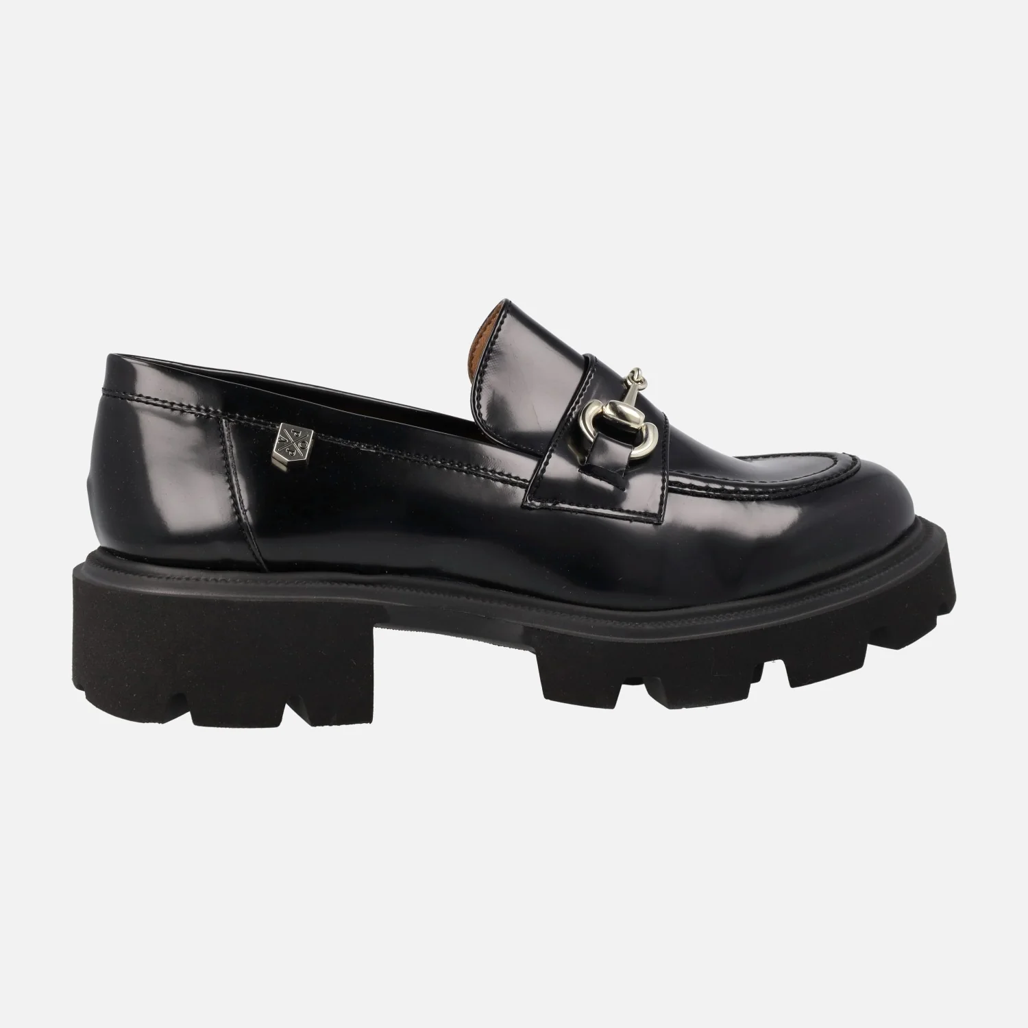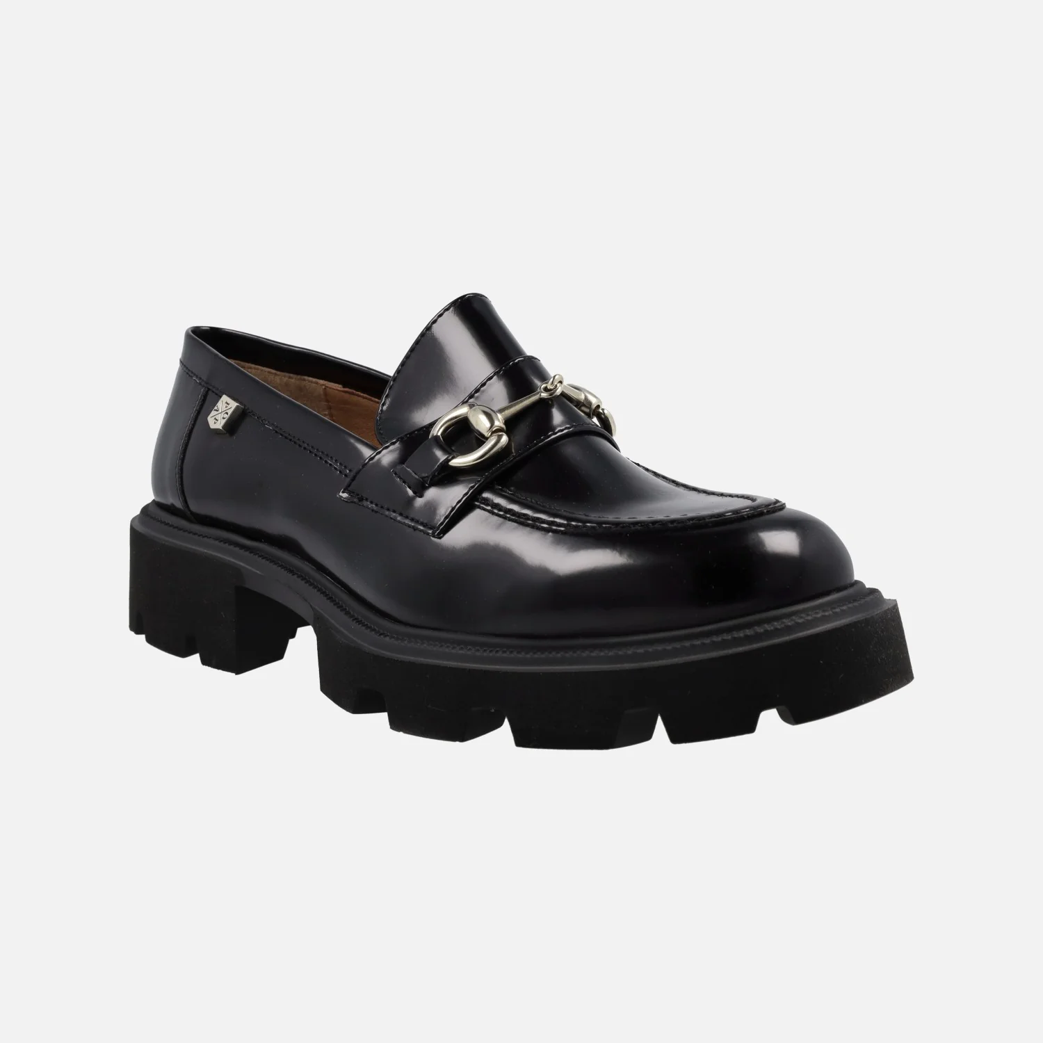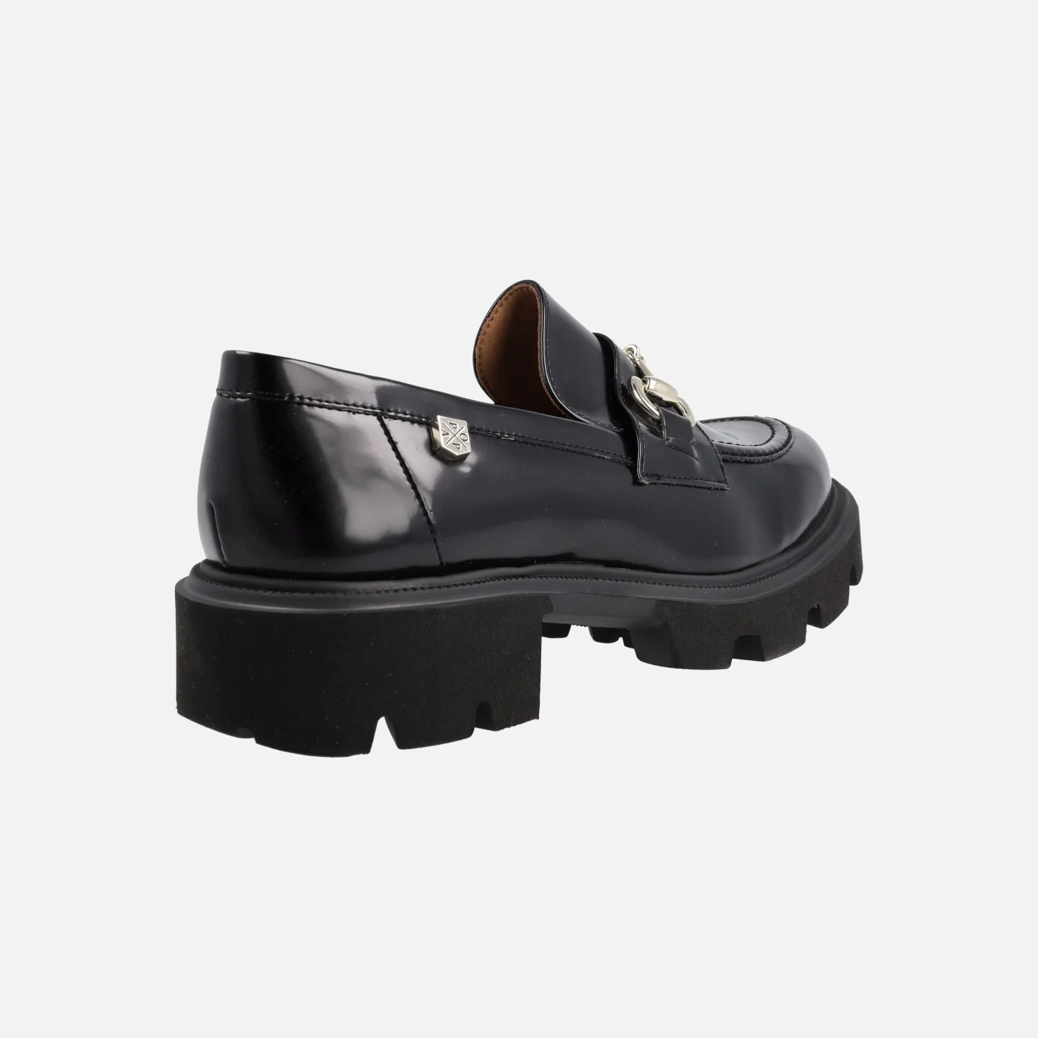 Elegantes mocasines para mujer de la marca Popa modelo Zintia negro. Mocasines elaborados en antik negro, brillo, con adorno metálico en el empeine. Piso de goma estilo Track, con 4 cms de altura en la parte trasera (3 cms plataforma delantera).