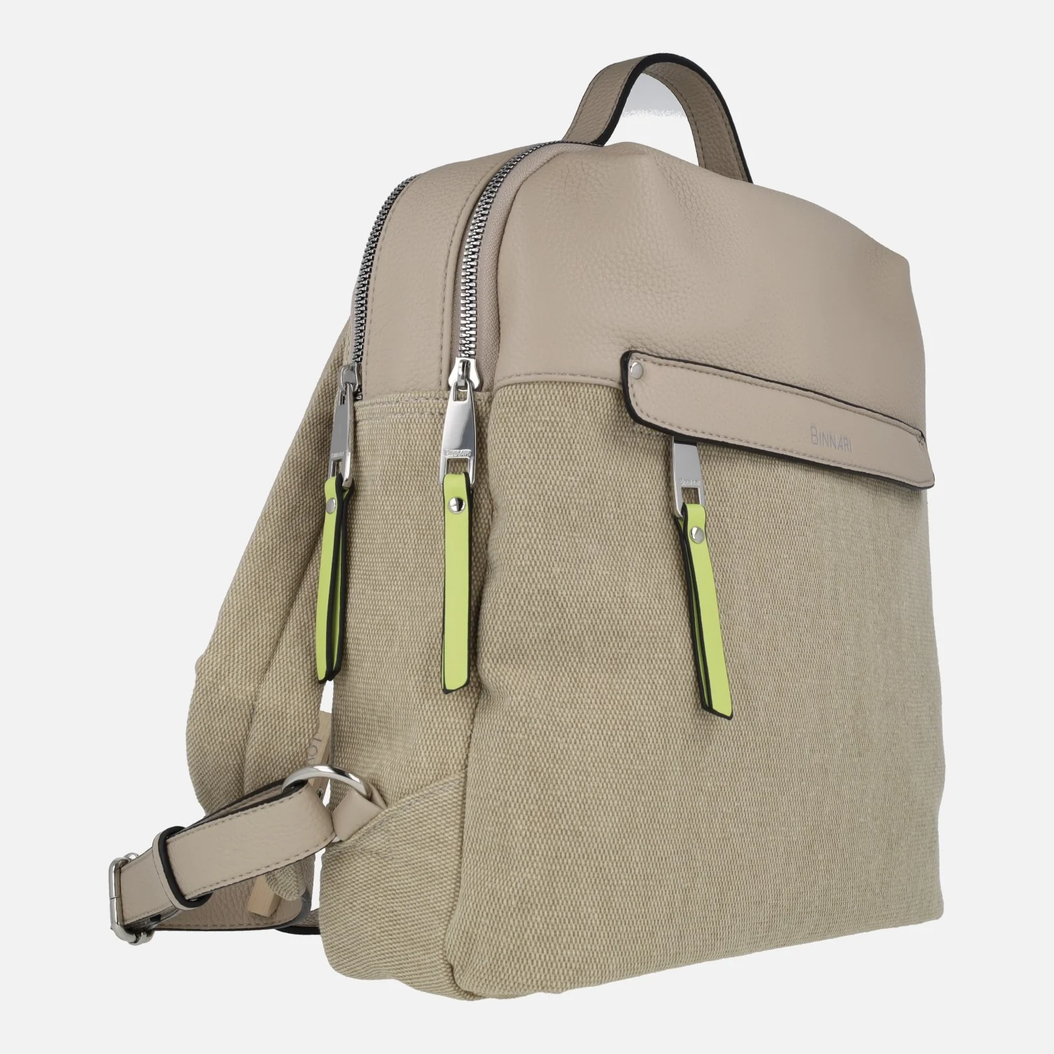 Mochilas multimaterial de la marca Binnari modelo Cloe 19981 Piedra. Mochilas elaboradas en combinado de tejido y PU, con asas ajustables traseras. Doble compartimento con cierre de cremallera. Bolsillos delanteros y traseros, ambos con cremallera. Asa fija de mano. Interior textil con gran variedad de bolsillos. Medidas aproximadas: 30 cms de alto x 27 cms de ancho x 13 cms de fondo.