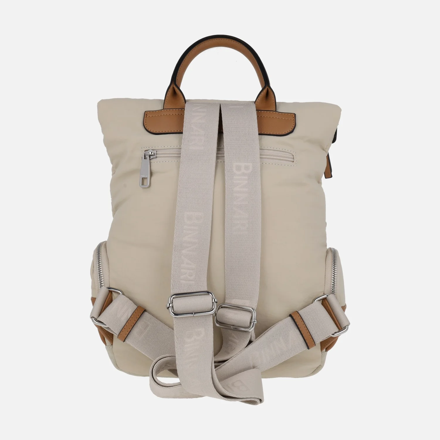 Mochilas marca Binnari modelo Yuca 21163 Hielo. Mochilas elaboradas en tejido nylon ligero, en color beige clarito con detalles en camel. Bolsillos delantero y trasero con cremallera. Dos bolsillos laterales con cremallera. Cierre principal con tapa, broches imantados y cremallera. Interior textil con dos bolsillos, uno de ellos con cremallera. Asa fija de mano. Asas textiles ajustables con hebilla a la espalda. Medidas: 33 cm de alto x 28 cm de ancho x 12 cm de fondo.