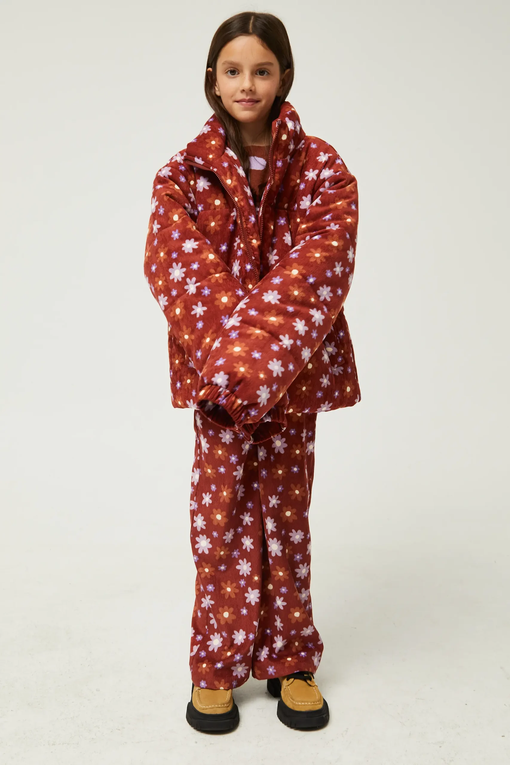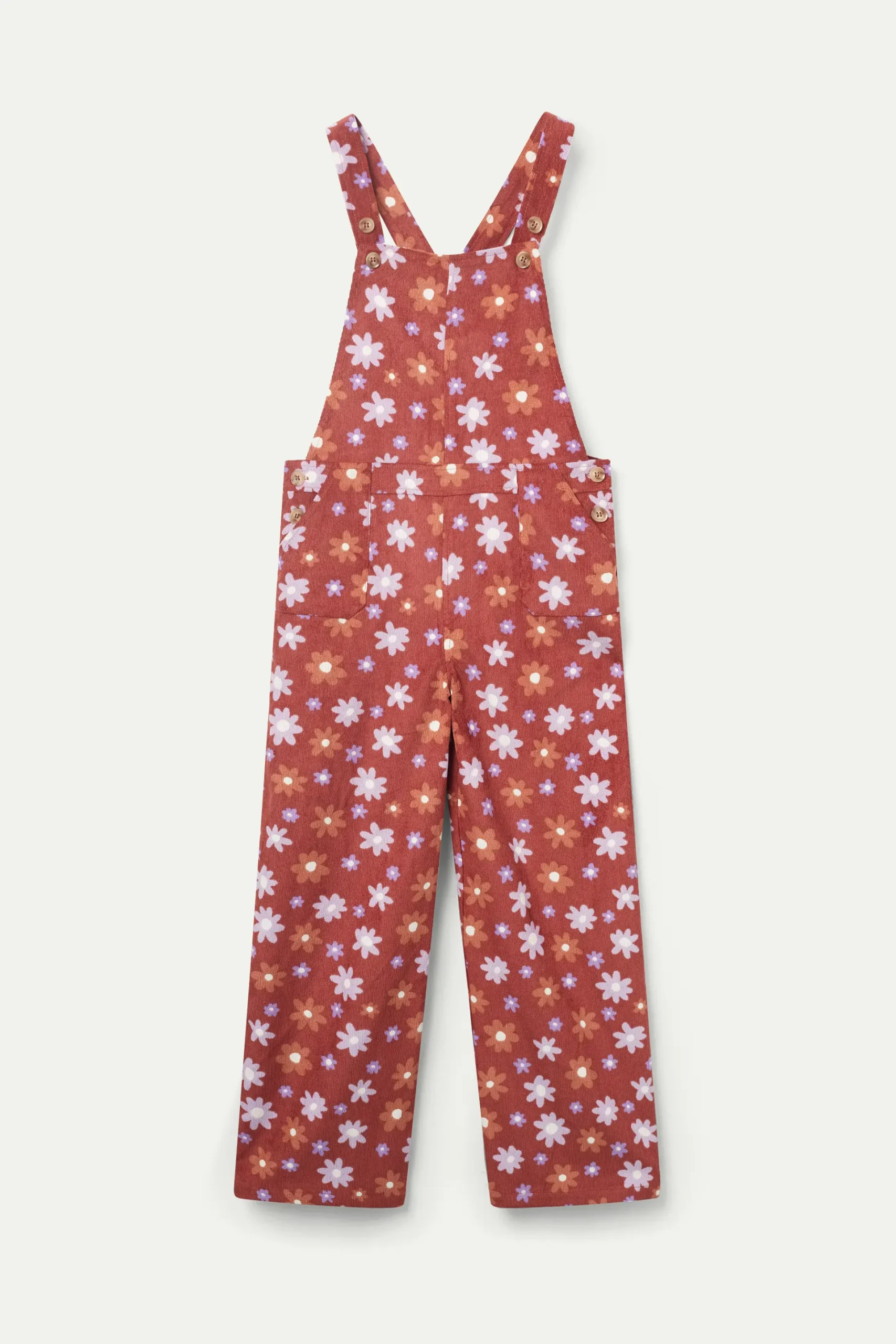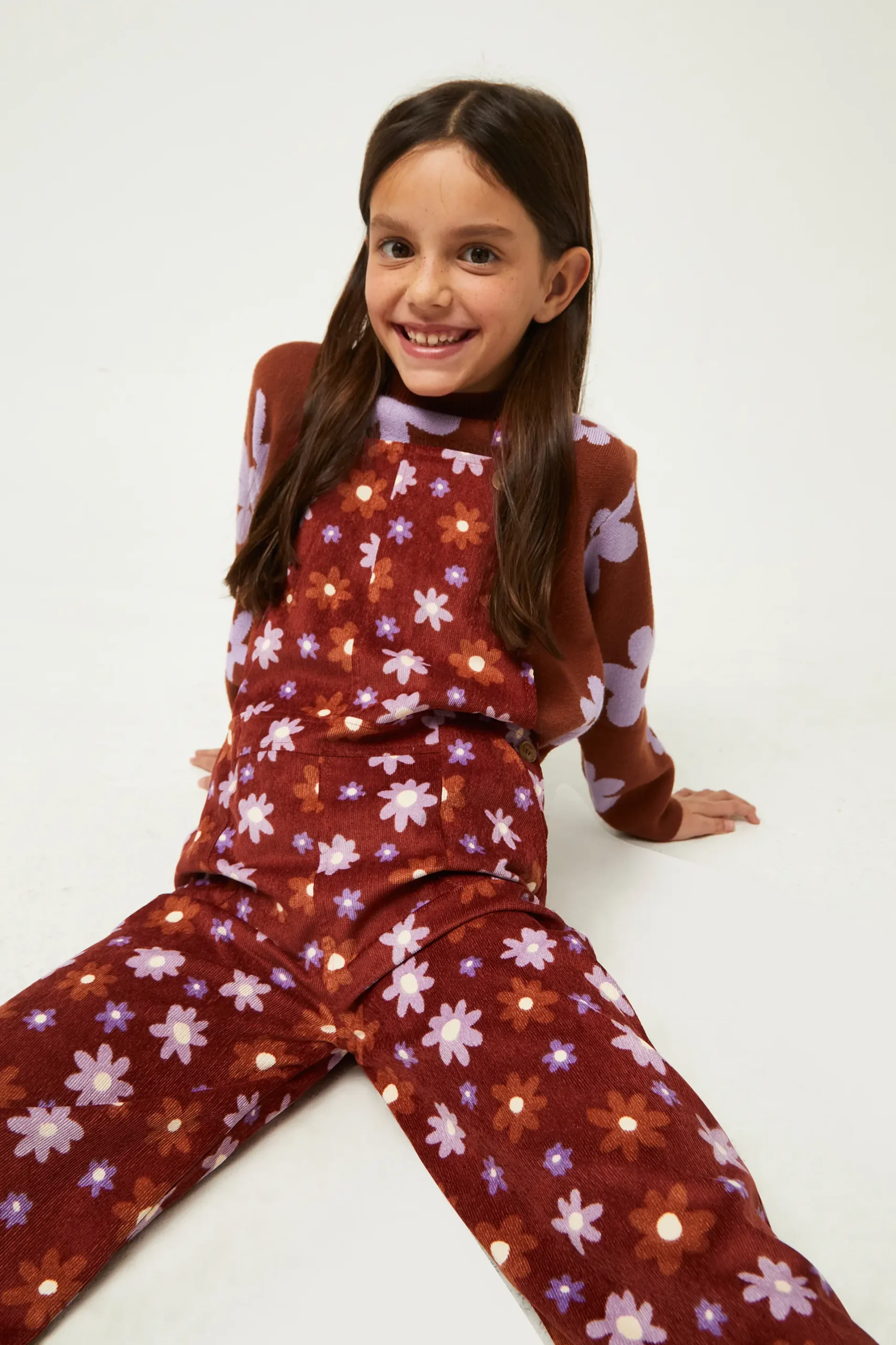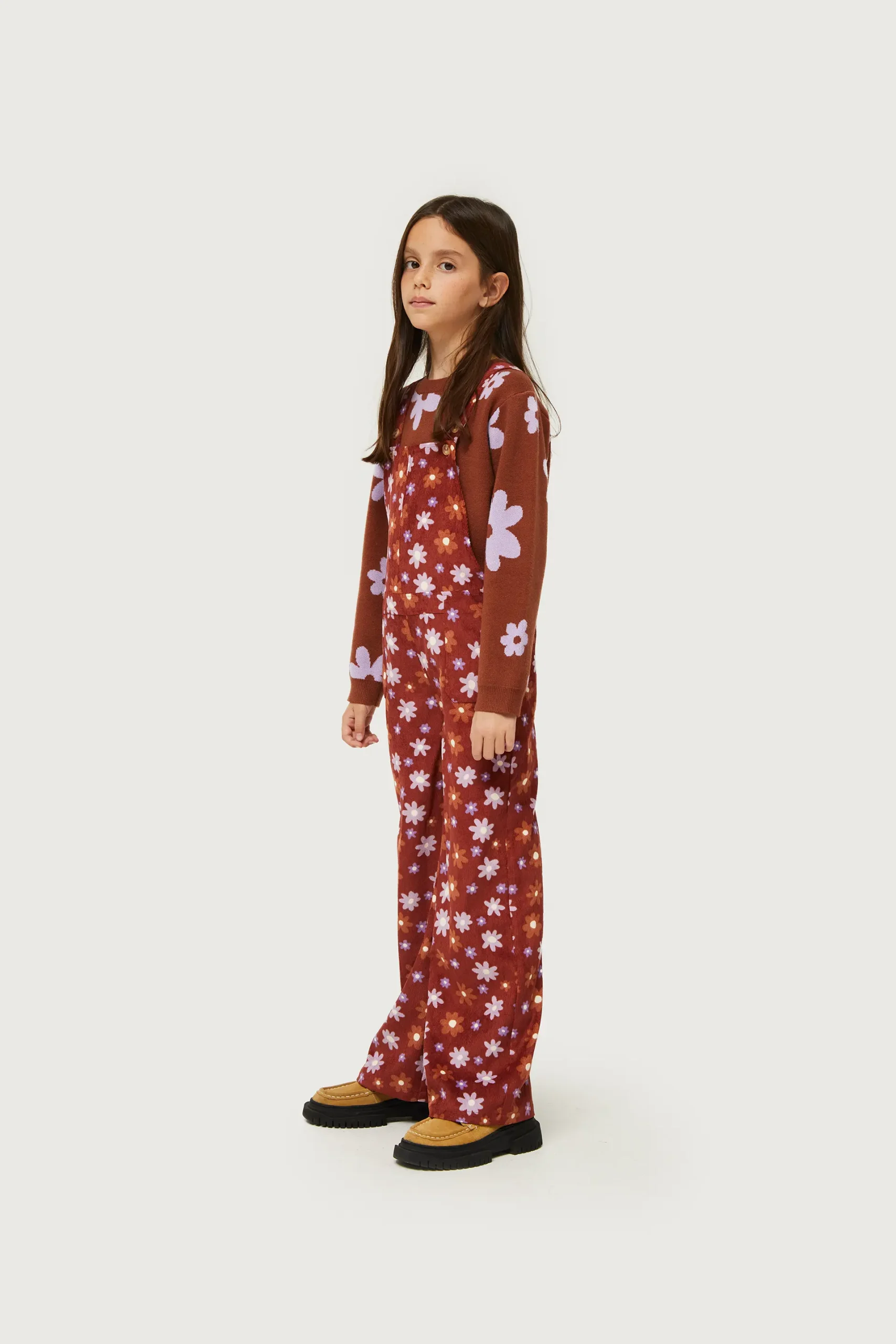 Mono largo de niña en tejido de pana con estampado de flores marrones y lilas. Con escote cuadrado y tirantes ajustables. Pernera recta y bolsillos laterales. La modelo mide 134 cm y lleva la talla 8.