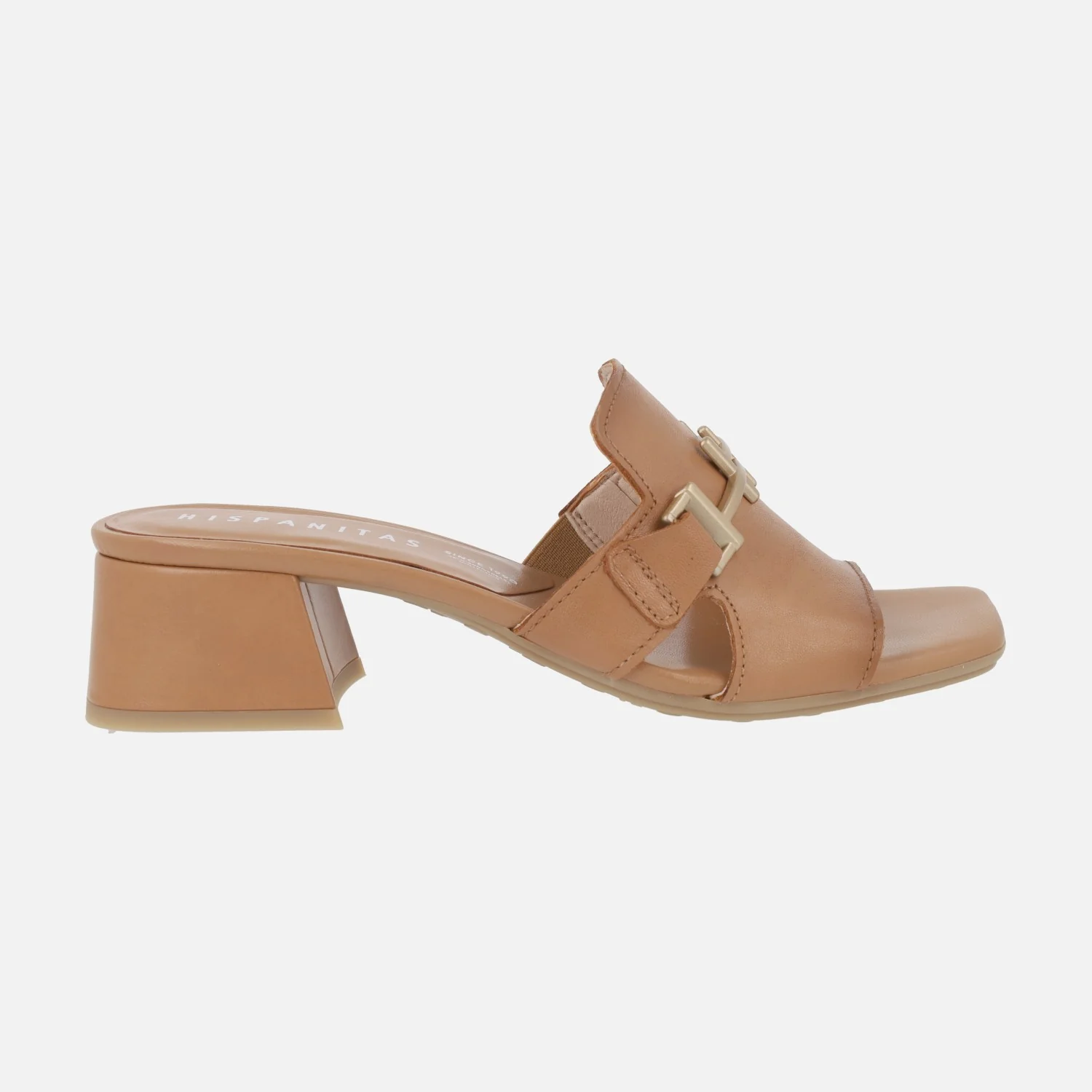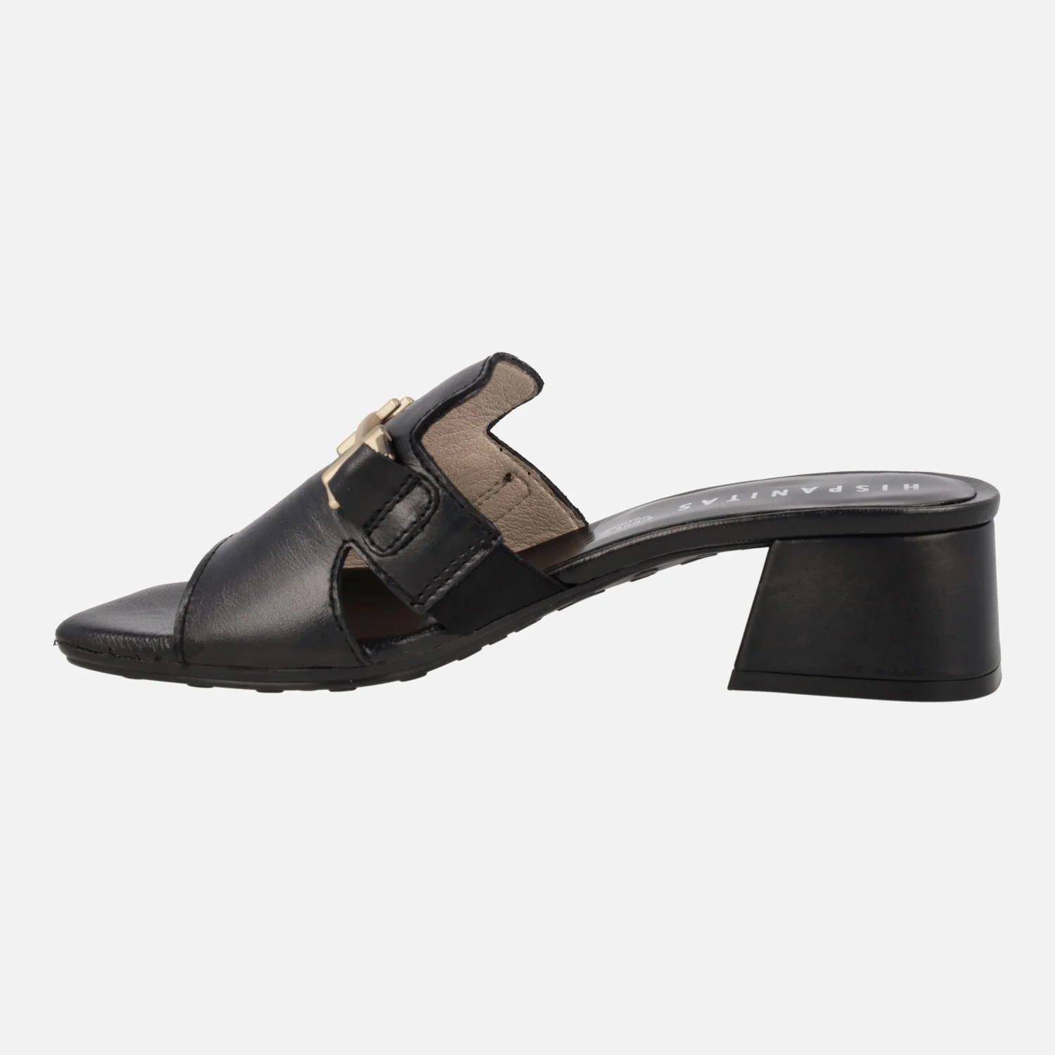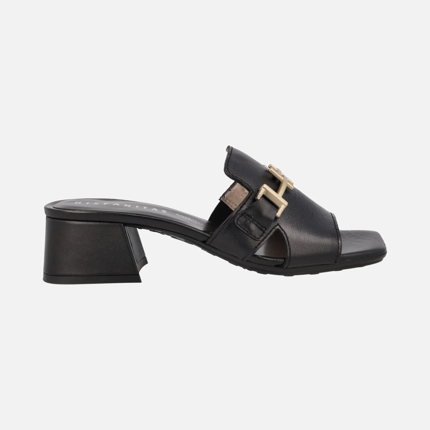 Sandalias estilo mules para mujer de la marca Hispanitas, modelo HV254069, disponibles en negro (Black) y cuero (cuoio). Sandalias de piel con adorno dorado en la parte superior. Interior en microfibra. Pieza elástica para mejor ajuste y sujeción en el lateral interior. Tacones anchos de 5 cms de altura aproximadamente. Sistema TRIFLOW de triple almohadillado para una mayor absorción de impactos y un gran confort a la hora de caminar. Made in Spain.