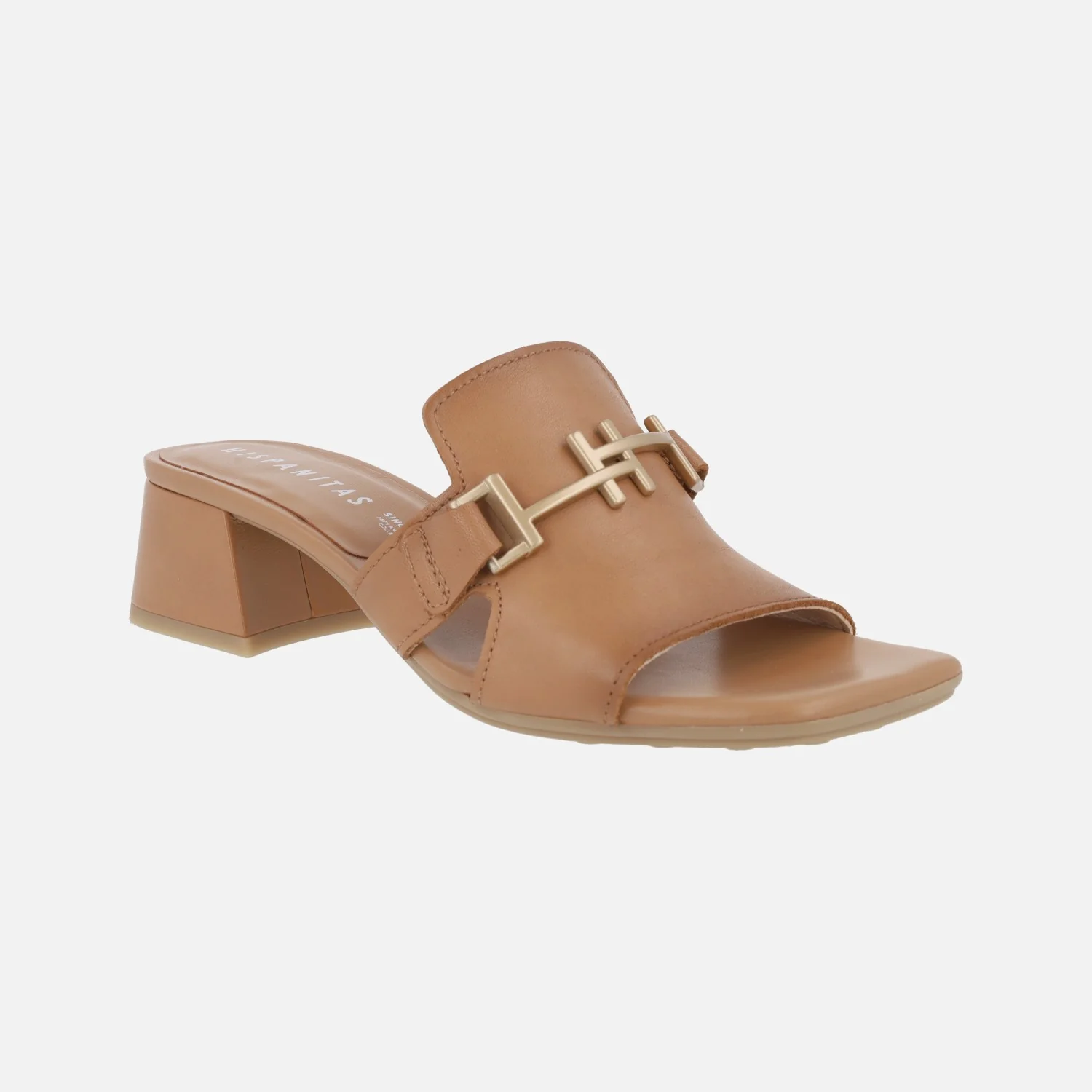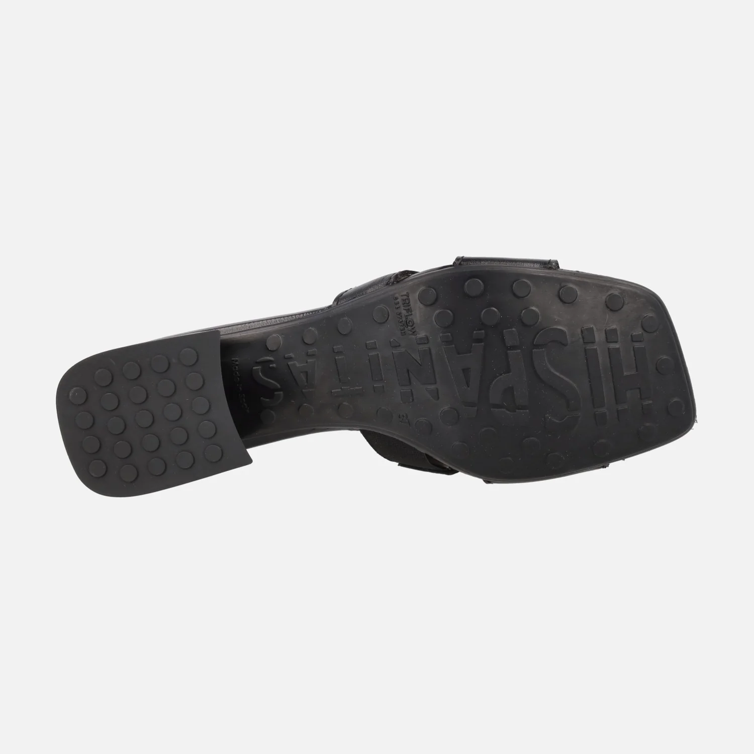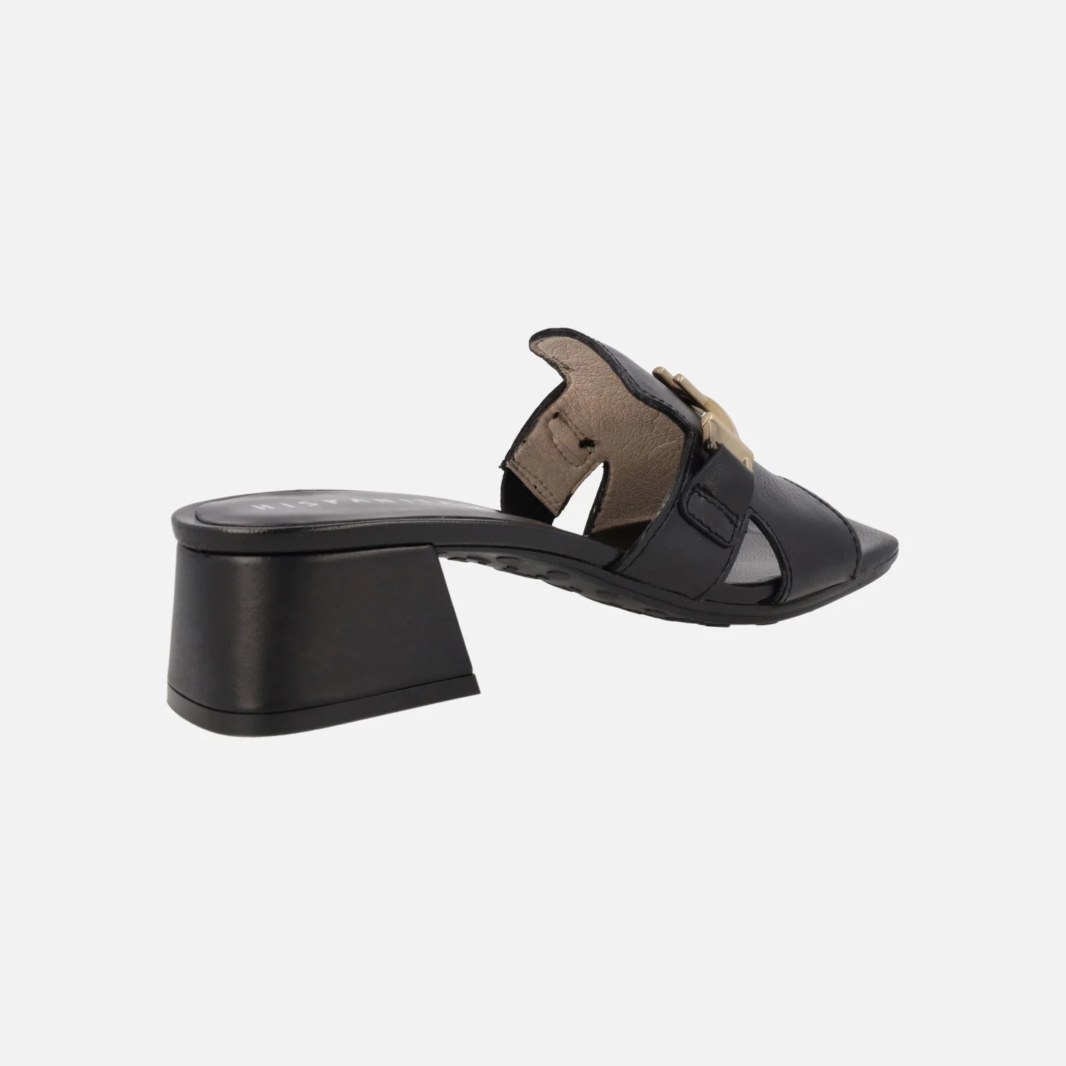 Sandalias estilo mules para mujer de la marca Hispanitas, modelo HV254069, disponibles en negro (Black) y cuero (cuoio). Sandalias de piel con adorno dorado en la parte superior. Interior en microfibra. Pieza elástica para mejor ajuste y sujeción en el lateral interior. Tacones anchos de 5 cms de altura aproximadamente. Sistema TRIFLOW de triple almohadillado para una mayor absorción de impactos y un gran confort a la hora de caminar. Made in Spain.