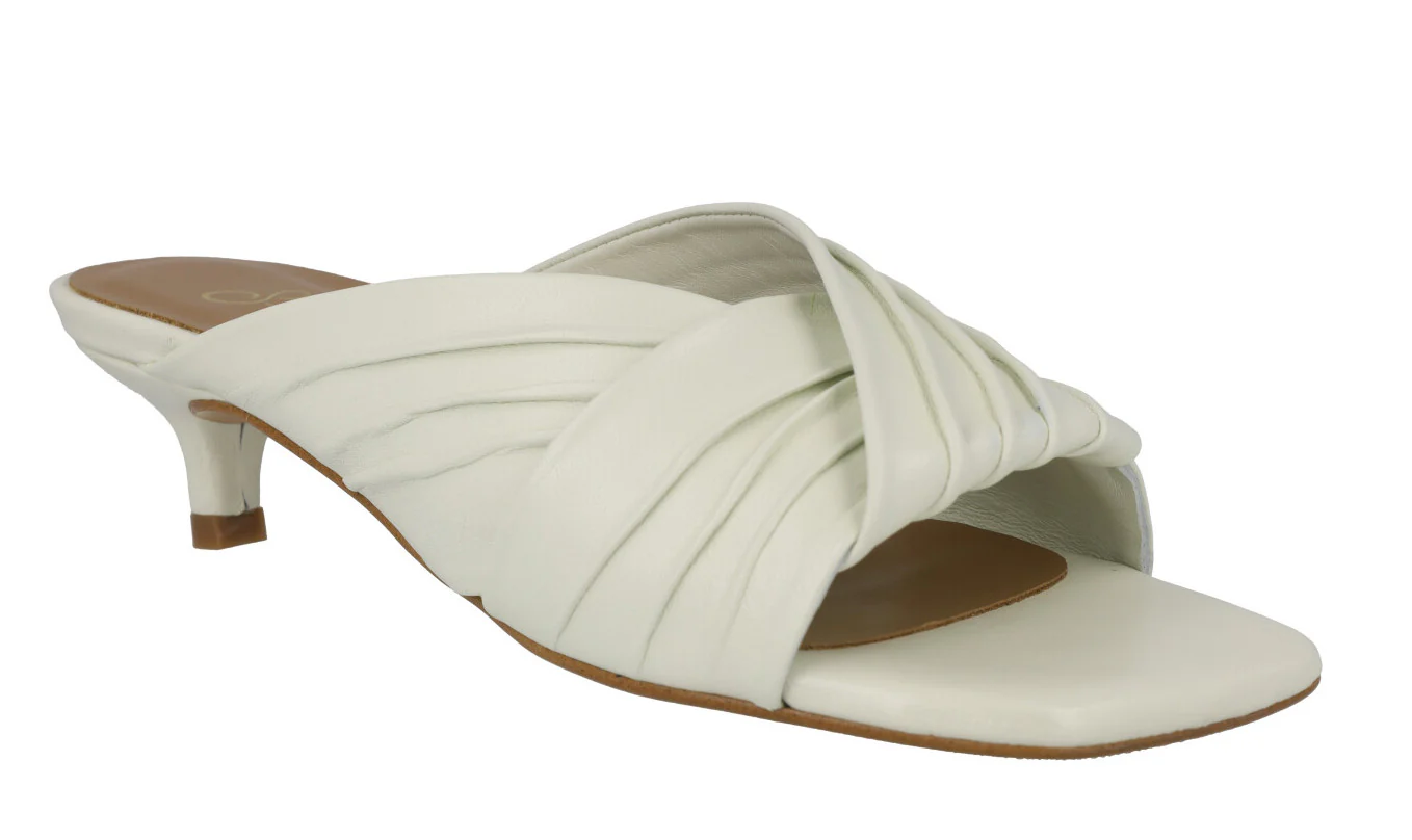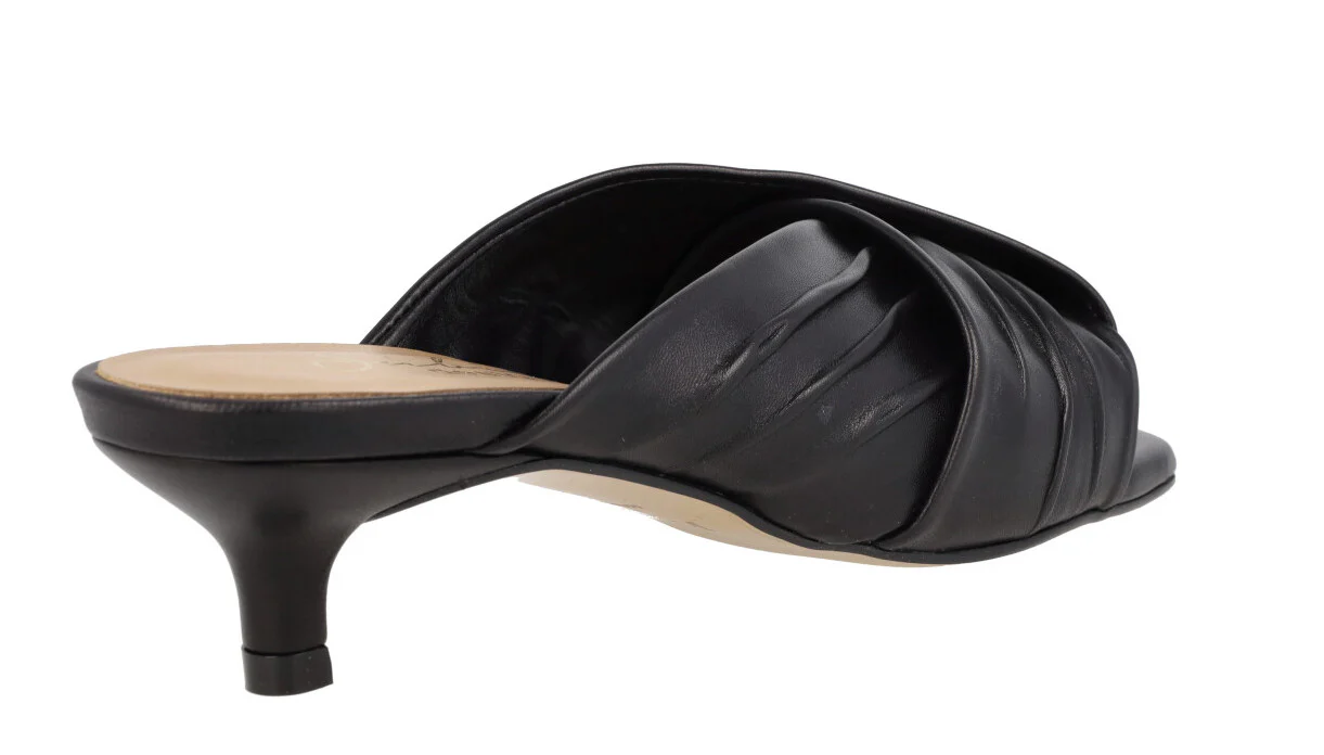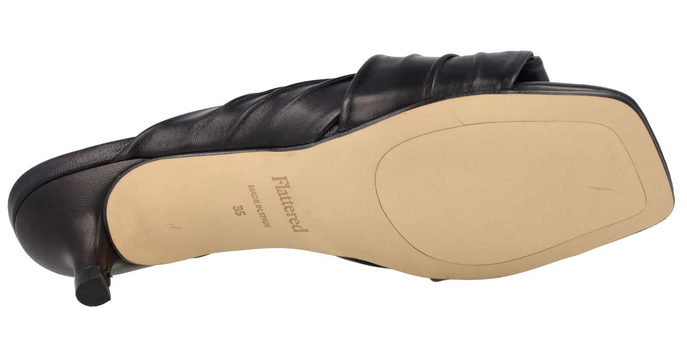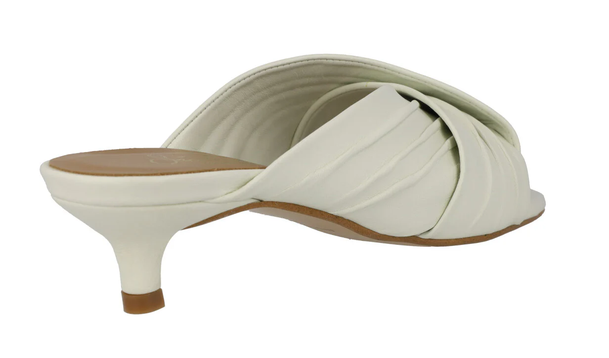Mules de piel para mujer de la marca española Mirai, modelo 54161, disponibles en color negro o nata (blanco roto). Con pala compuesta por varias tiras anchas cruzadas y fruncidas. Interior de piel. Tacones estilo chupete, forrados de piel, con 5 cms de altura. Made in Spain.