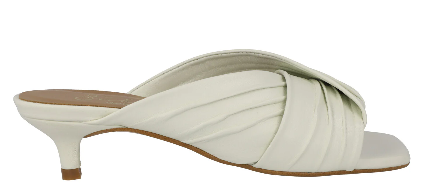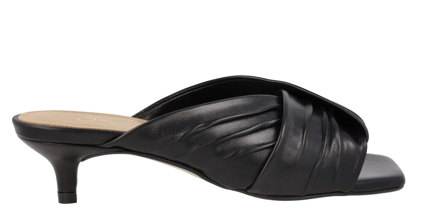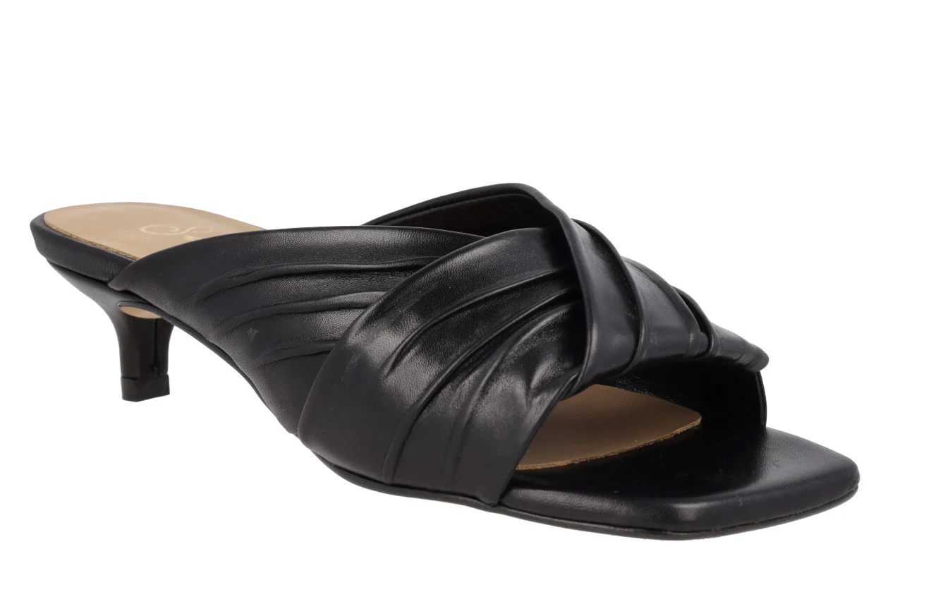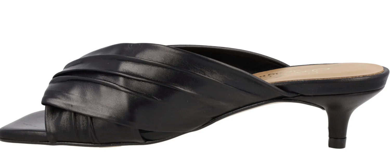 Mules de piel para mujer de la marca española Mirai, modelo 54161, disponibles en color negro o nata (blanco roto). Con pala compuesta por varias tiras anchas cruzadas y fruncidas. Interior de piel. Tacones estilo chupete, forrados de piel, con 5 cms de altura. Made in Spain.
