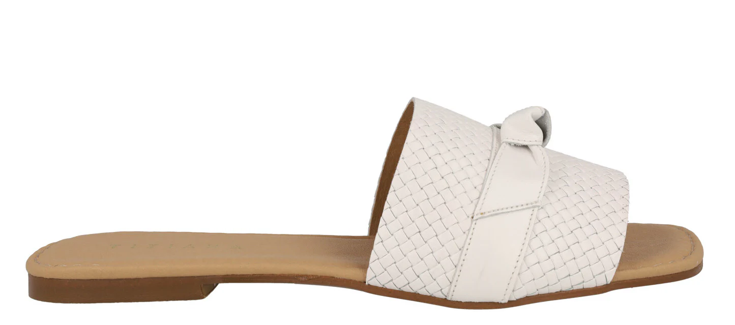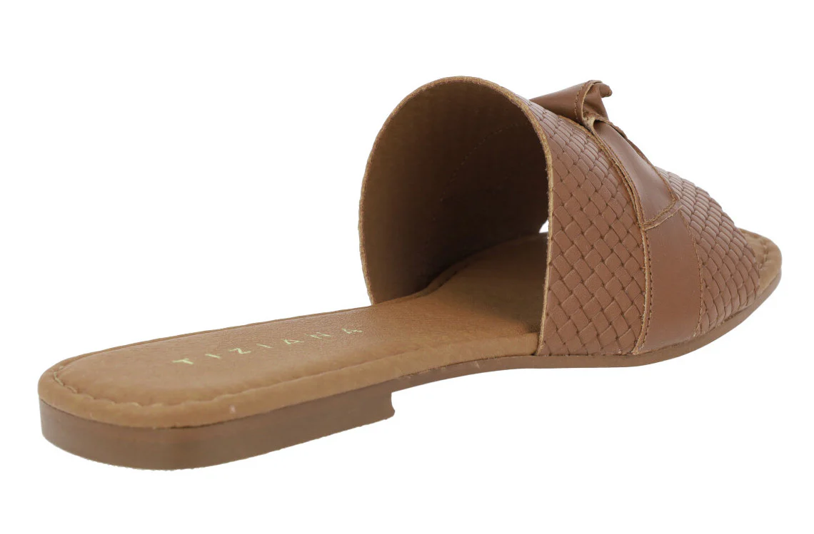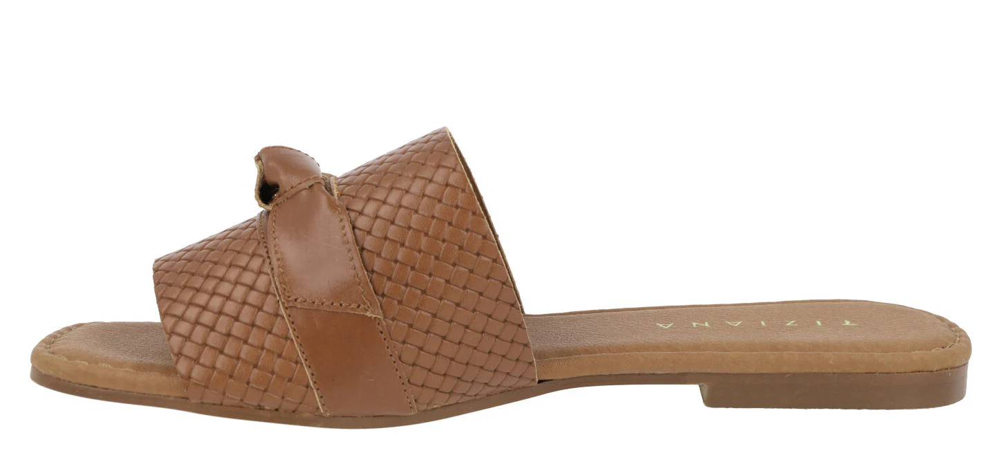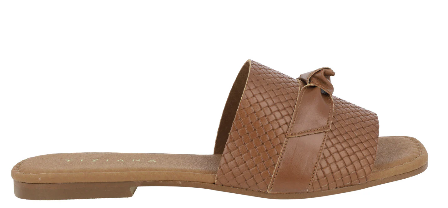 Sandalias planas de piel para mujer marca Tiziana modelo 1051. Palas de piel trenzada con tira lisa y nudo haciendo lazo en la parte superior. Disponibles negras, blancas o color cuero. Forro y planta de piel. Planta acolchada. Planas, de apenas 1 cm de altura en la parte trasera. Made in Spain.