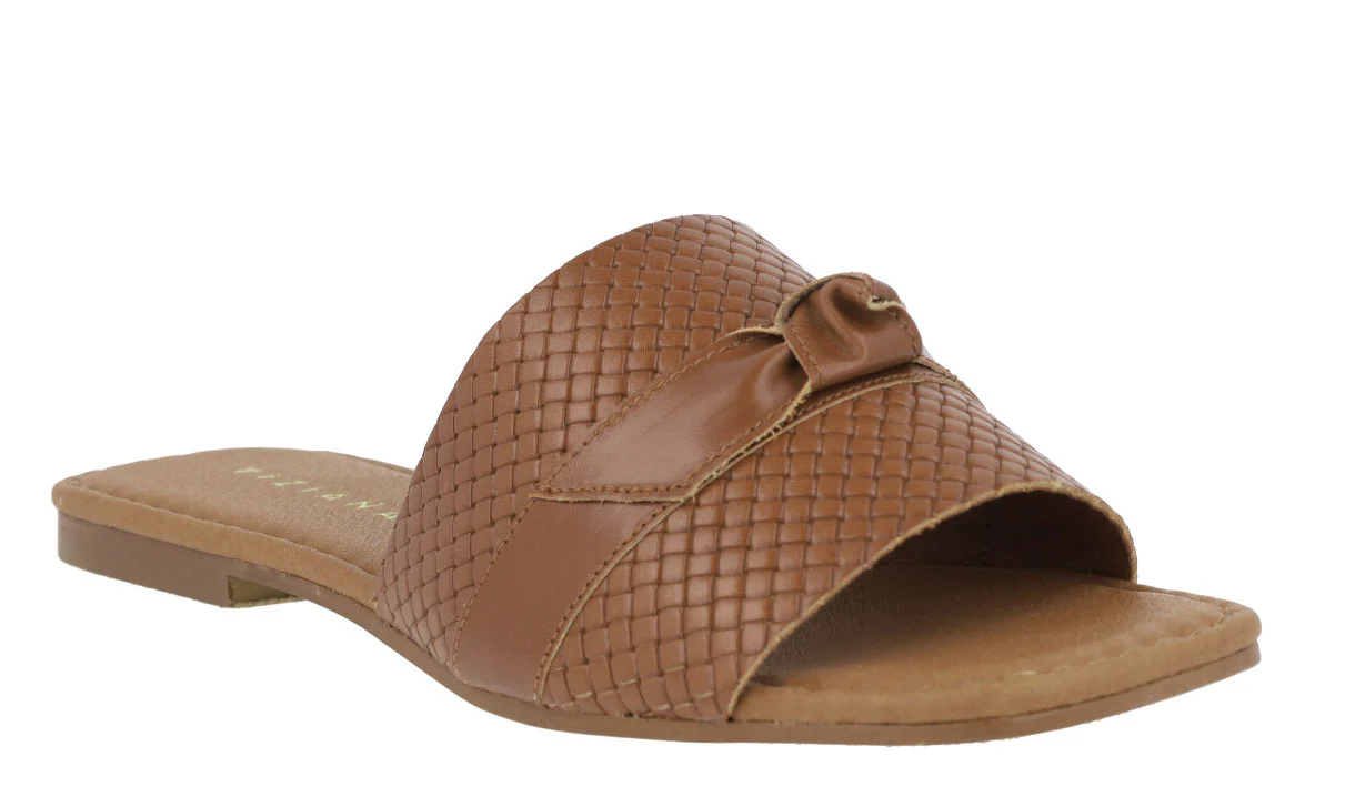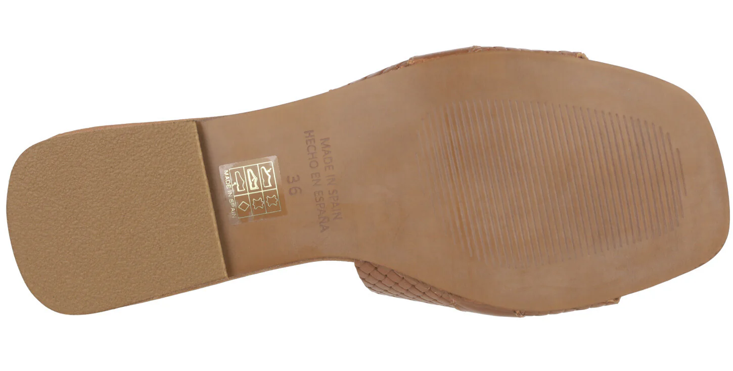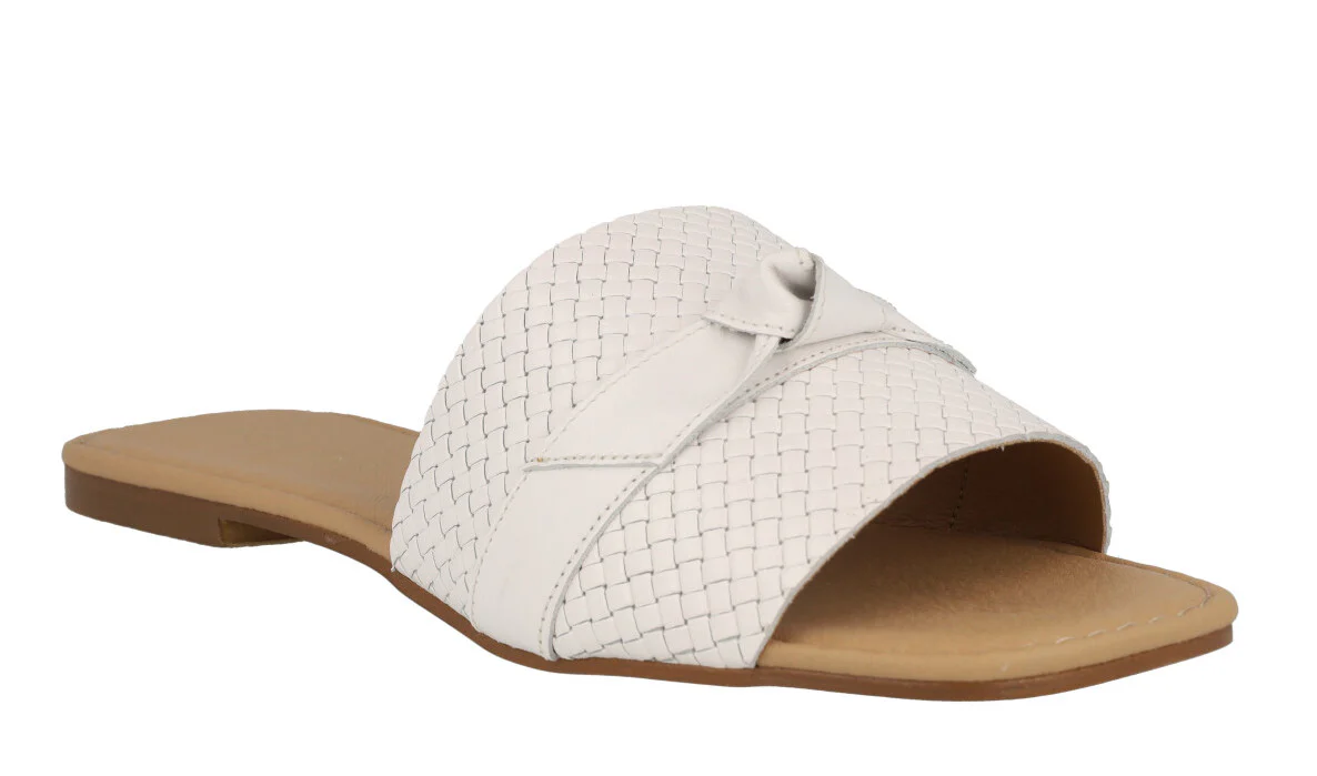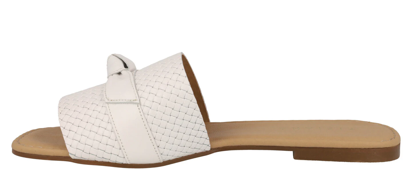 Sandalias planas de piel para mujer marca Tiziana modelo 1051. Palas de piel trenzada con tira lisa y nudo haciendo lazo en la parte superior. Disponibles negras, blancas o color cuero. Forro y planta de piel. Planta acolchada. Planas, de apenas 1 cm de altura en la parte trasera. Made in Spain.