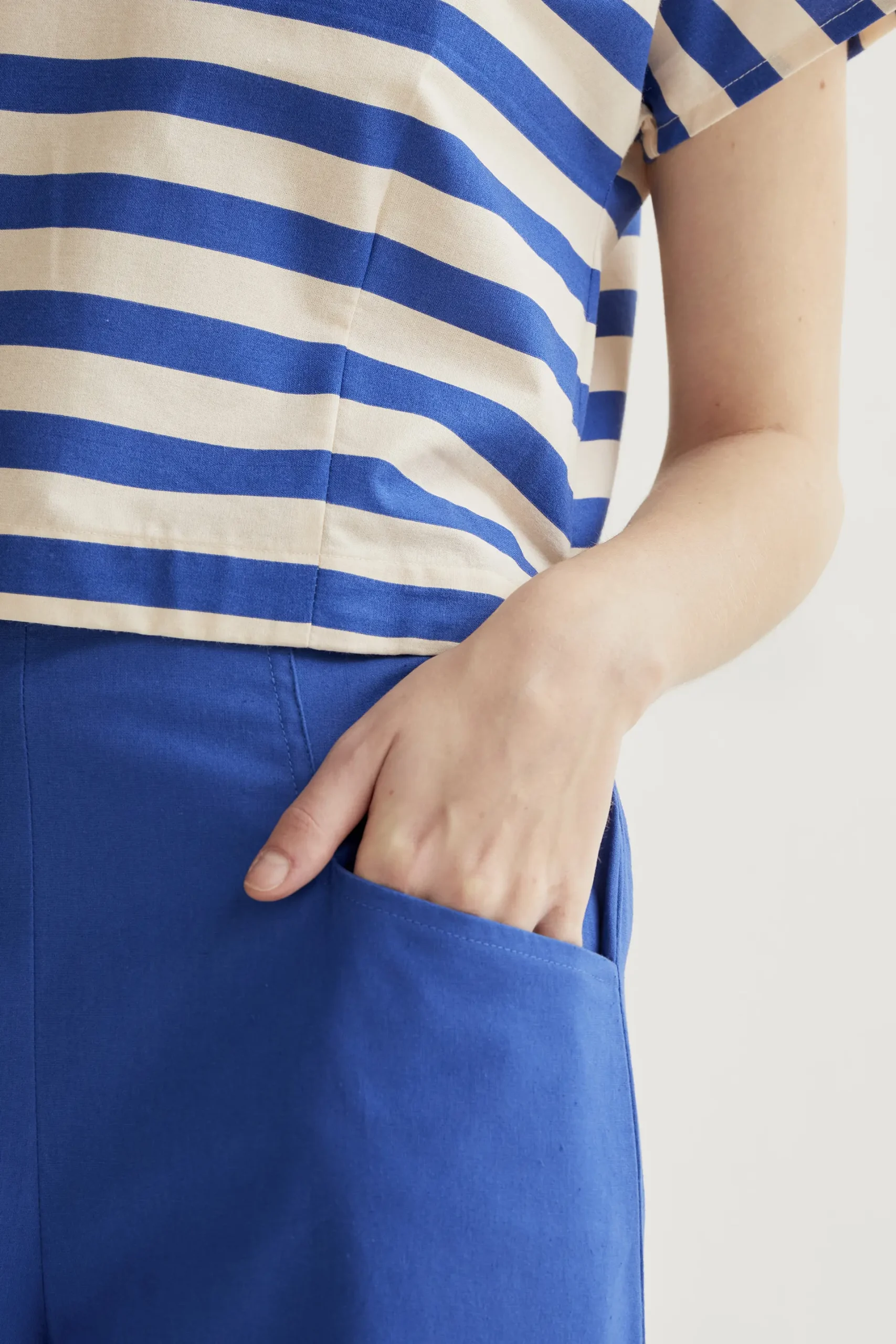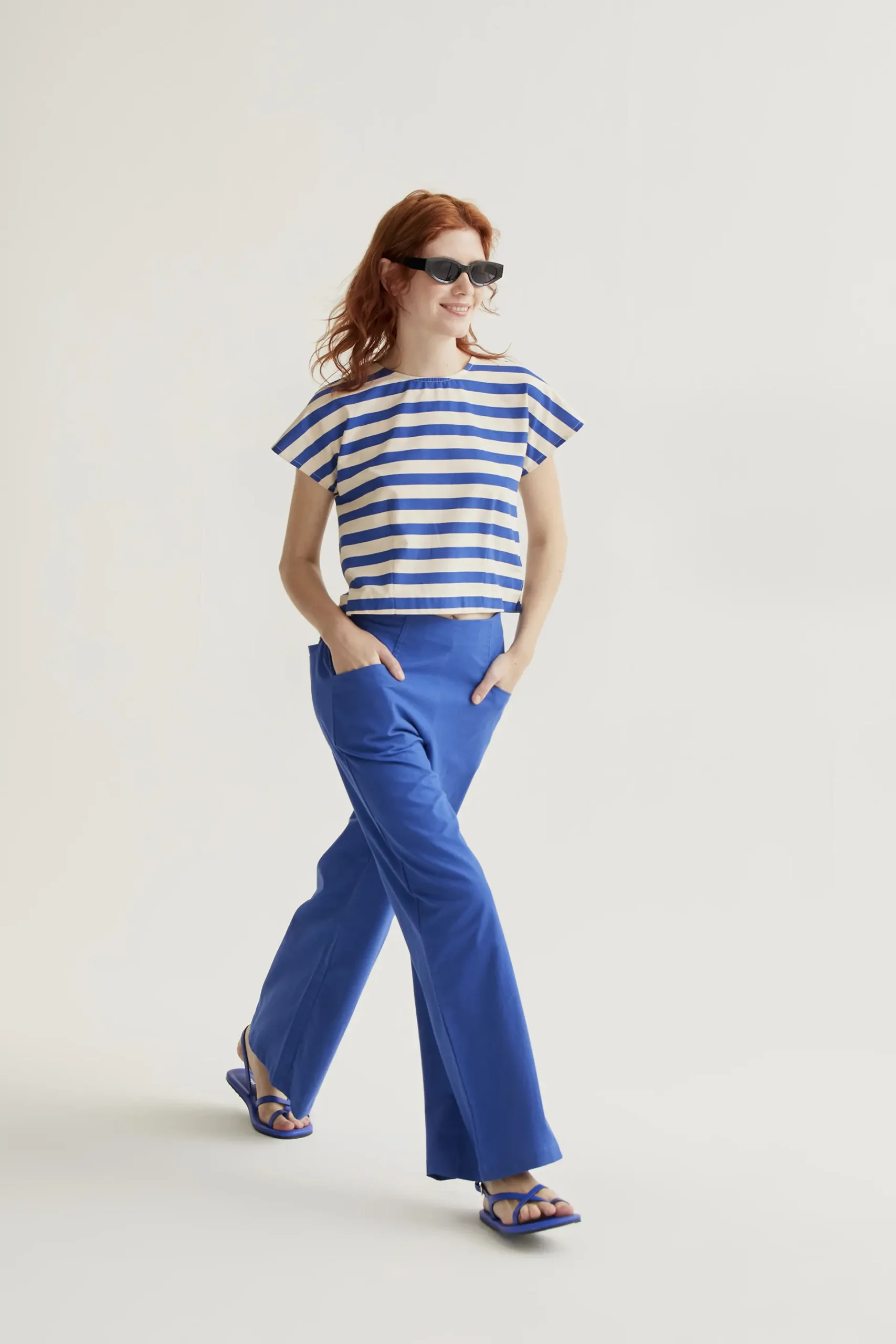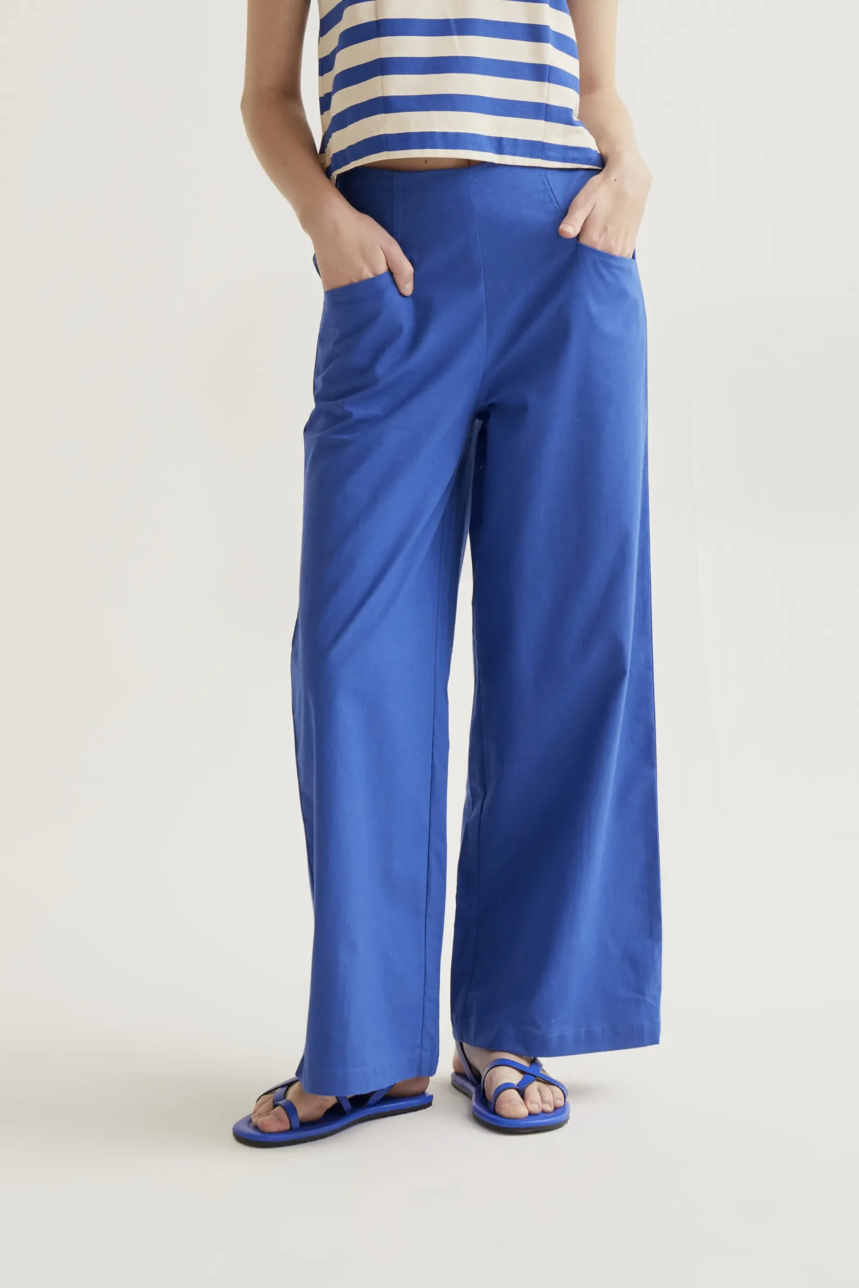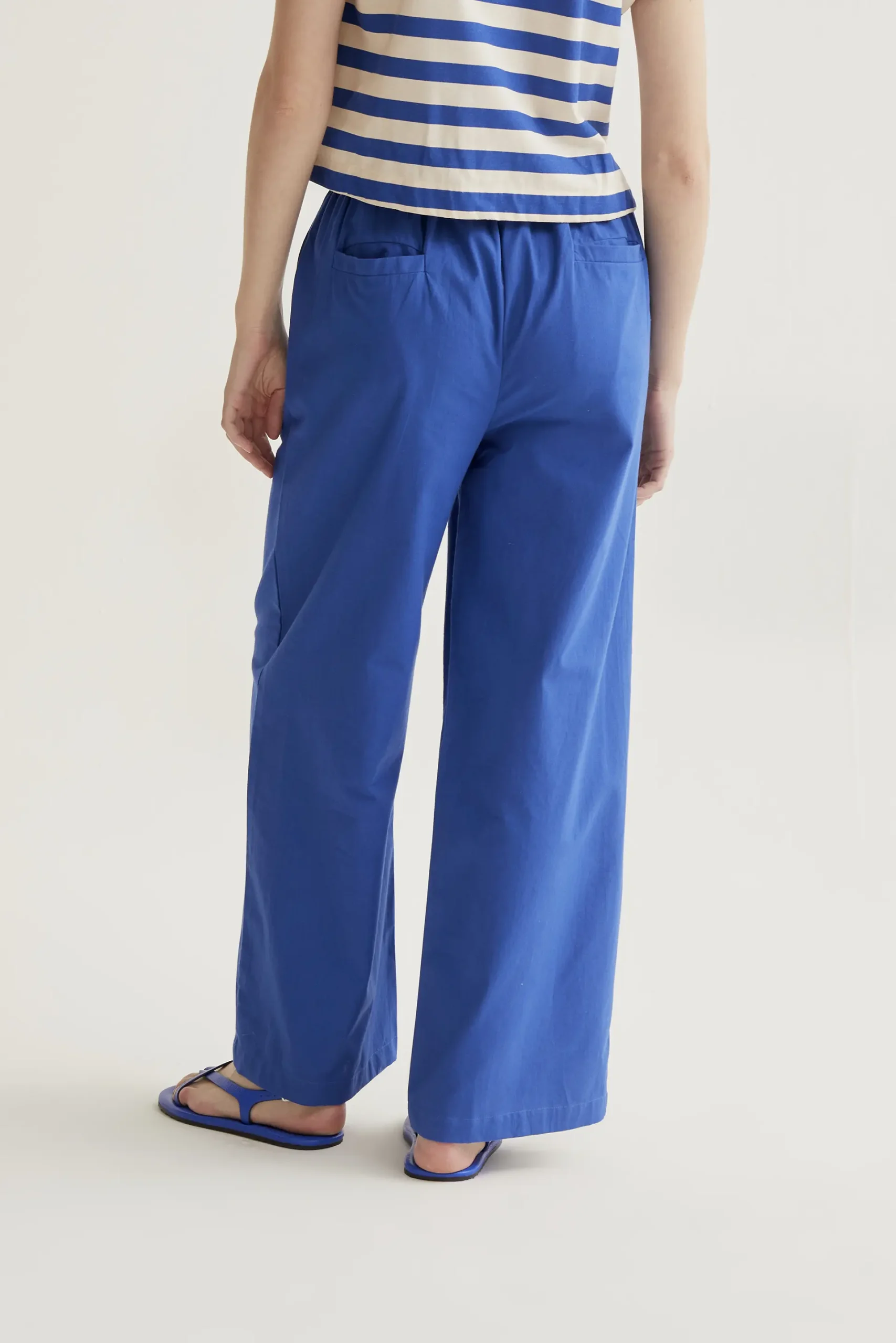 Pantalón de tejido 100% algodón de color azul. Cintura fija elástica de tiro alto. Pernera recta. Bolsillos laterales y posteriores. La modelo mide 175 cm y lleva la talla S.