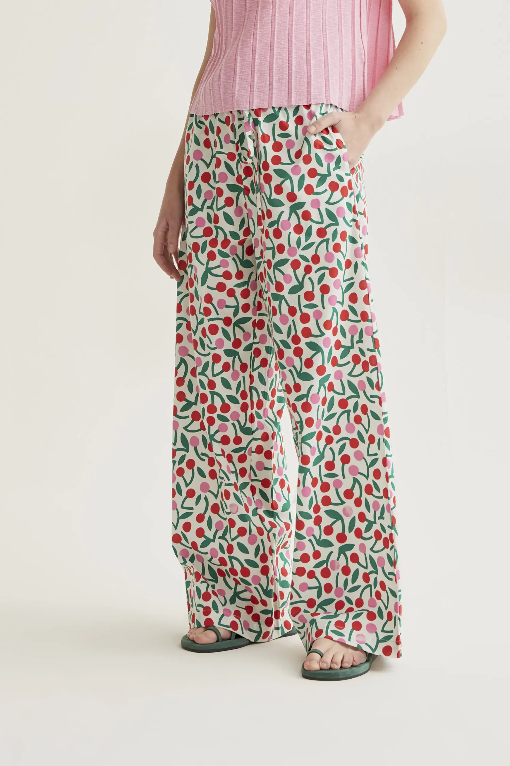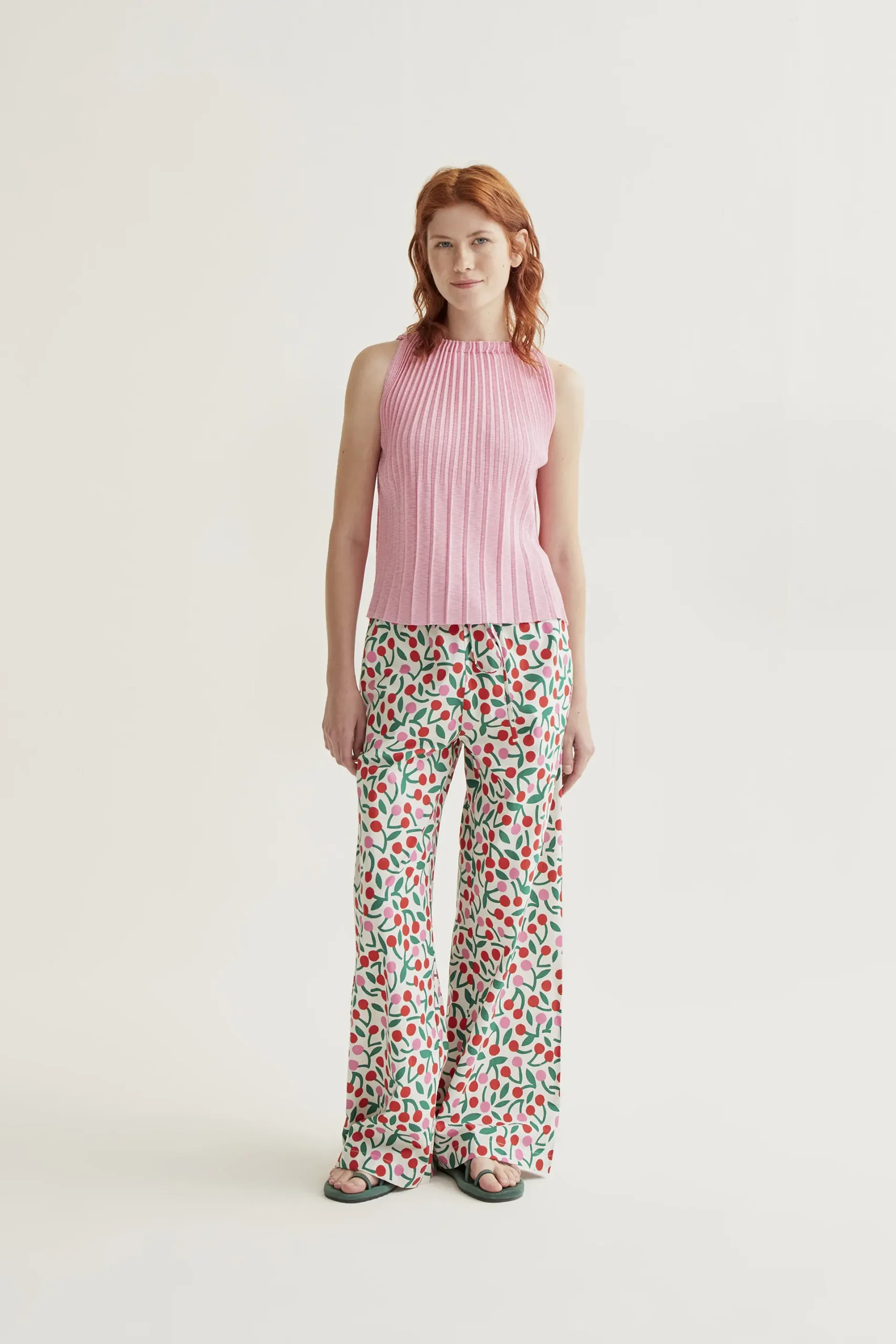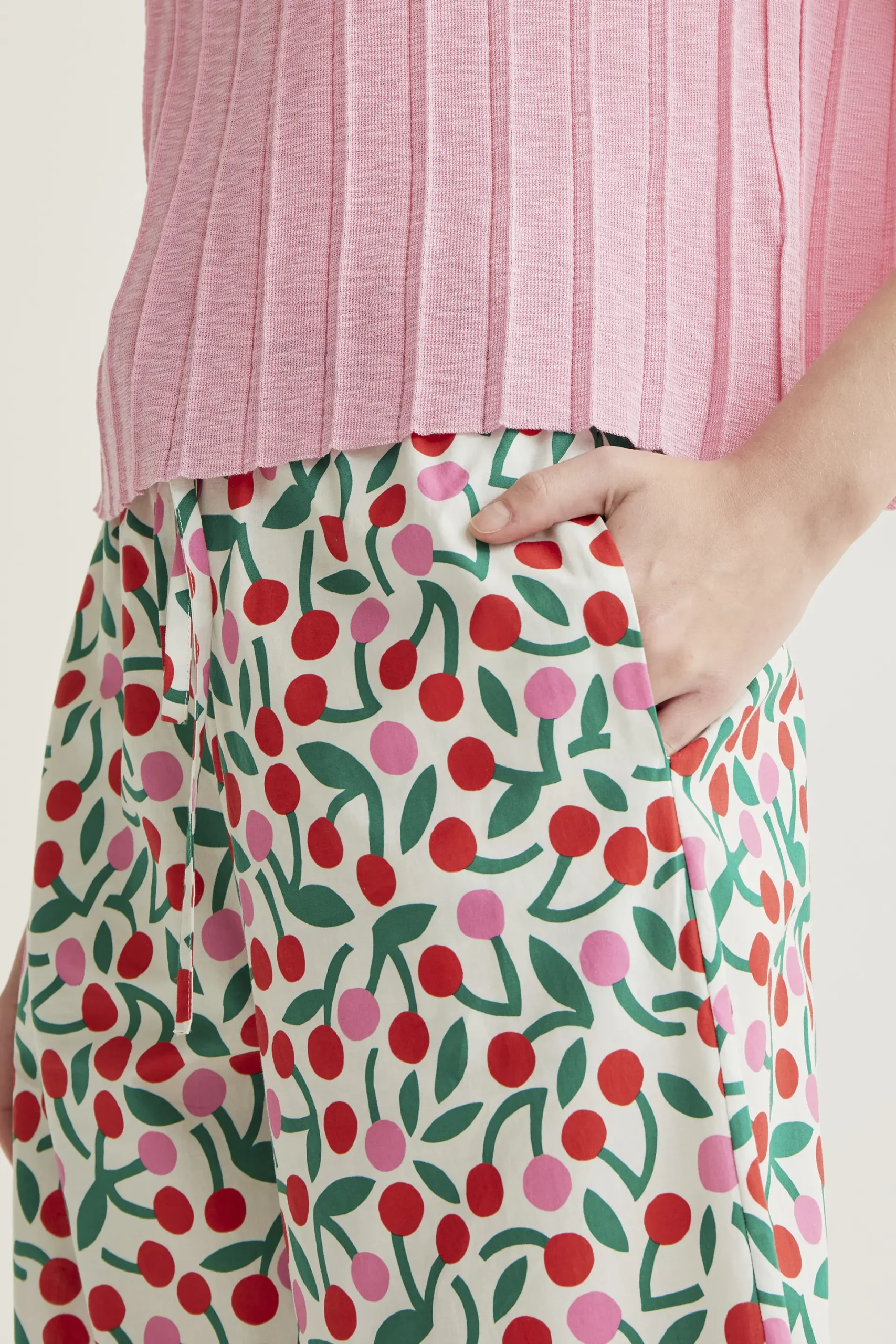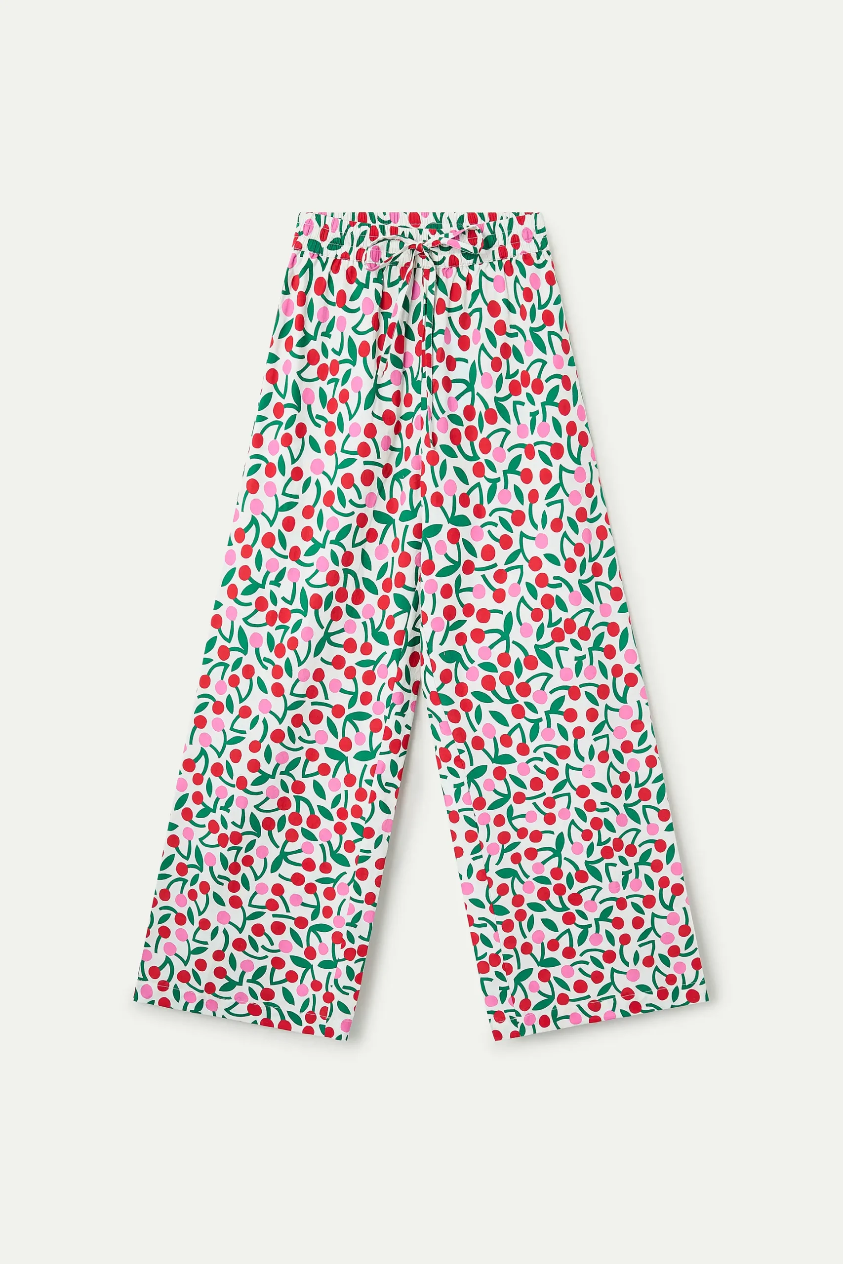 Pantalón de tejido 100% algodón con estampado guinda. Cintura elástica de tiro alto ajustable con cordones. Pernera recta amplia. La modelo mide 175 cm y lleva la talla S.