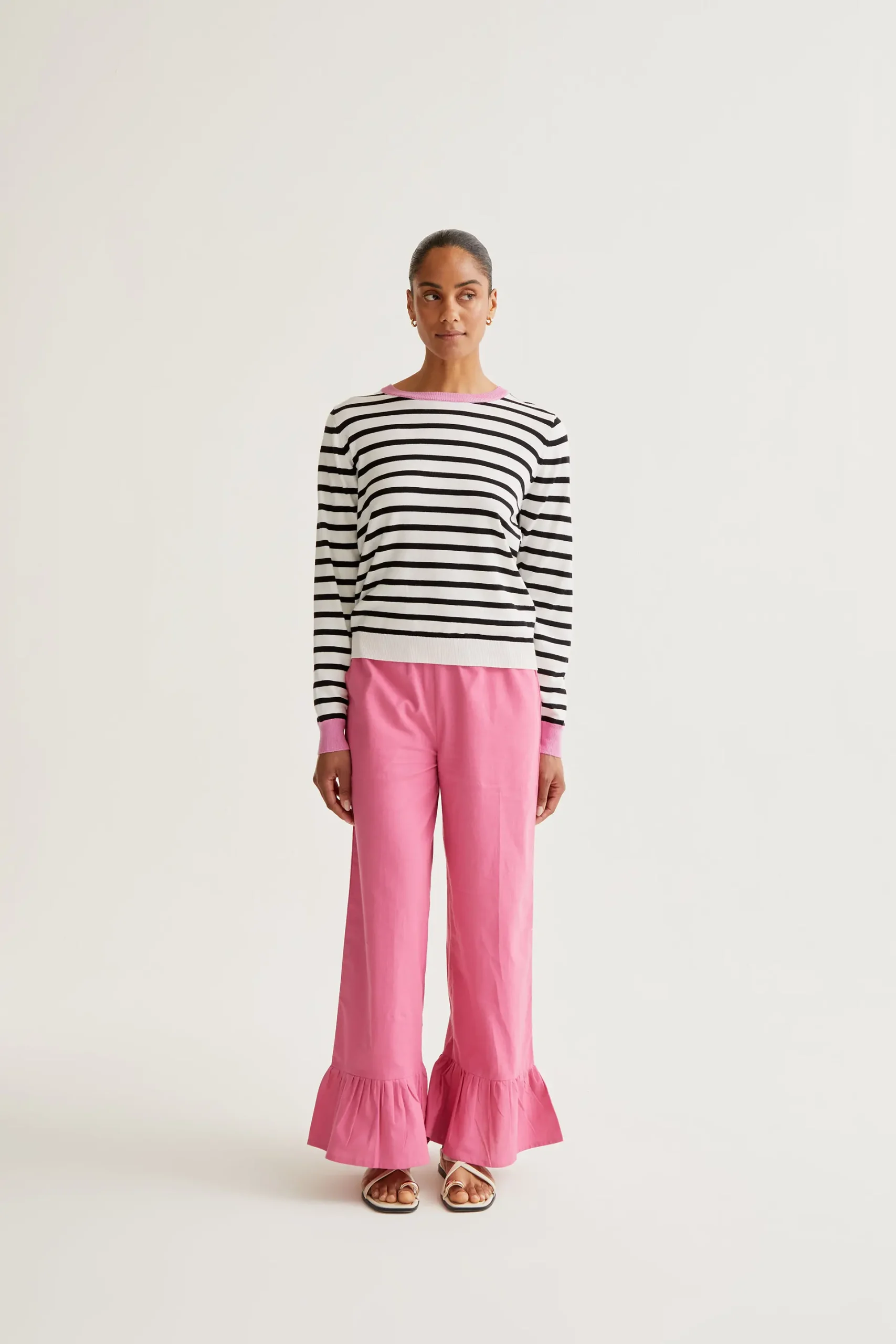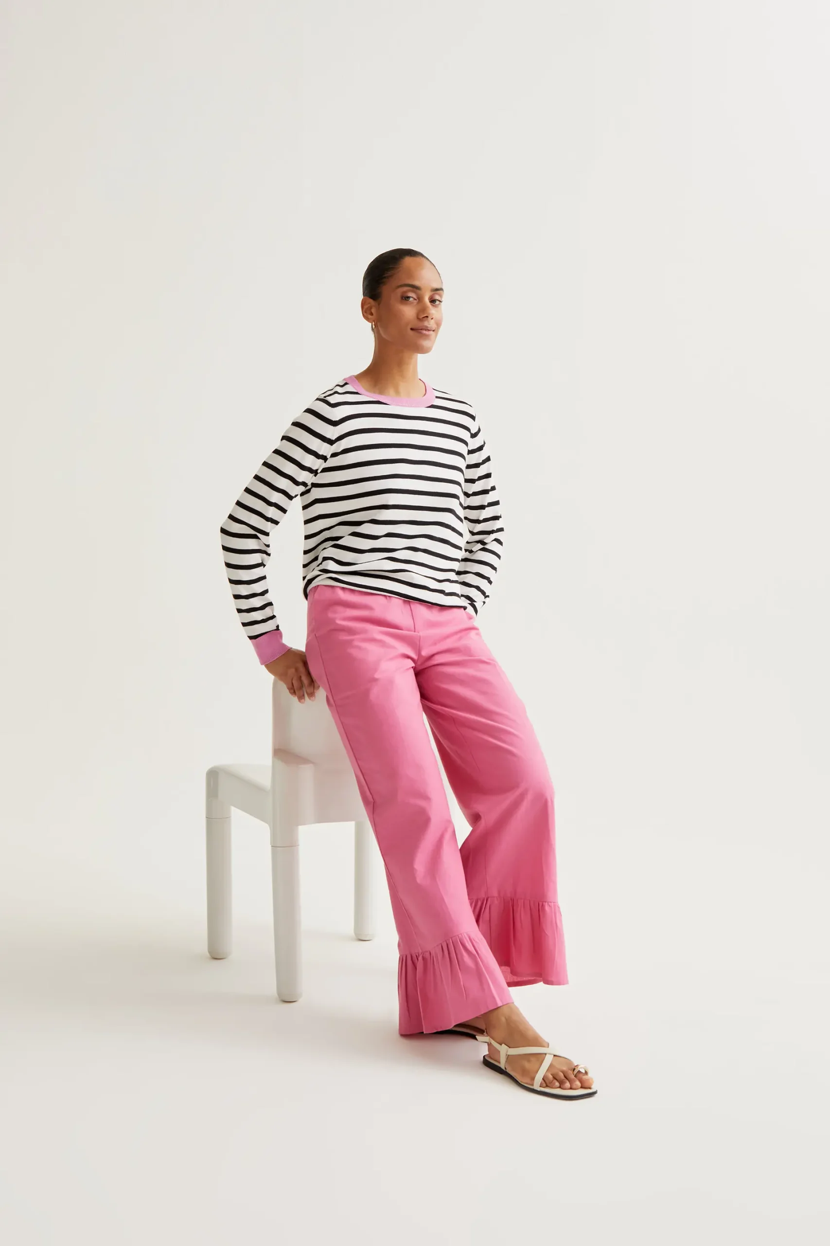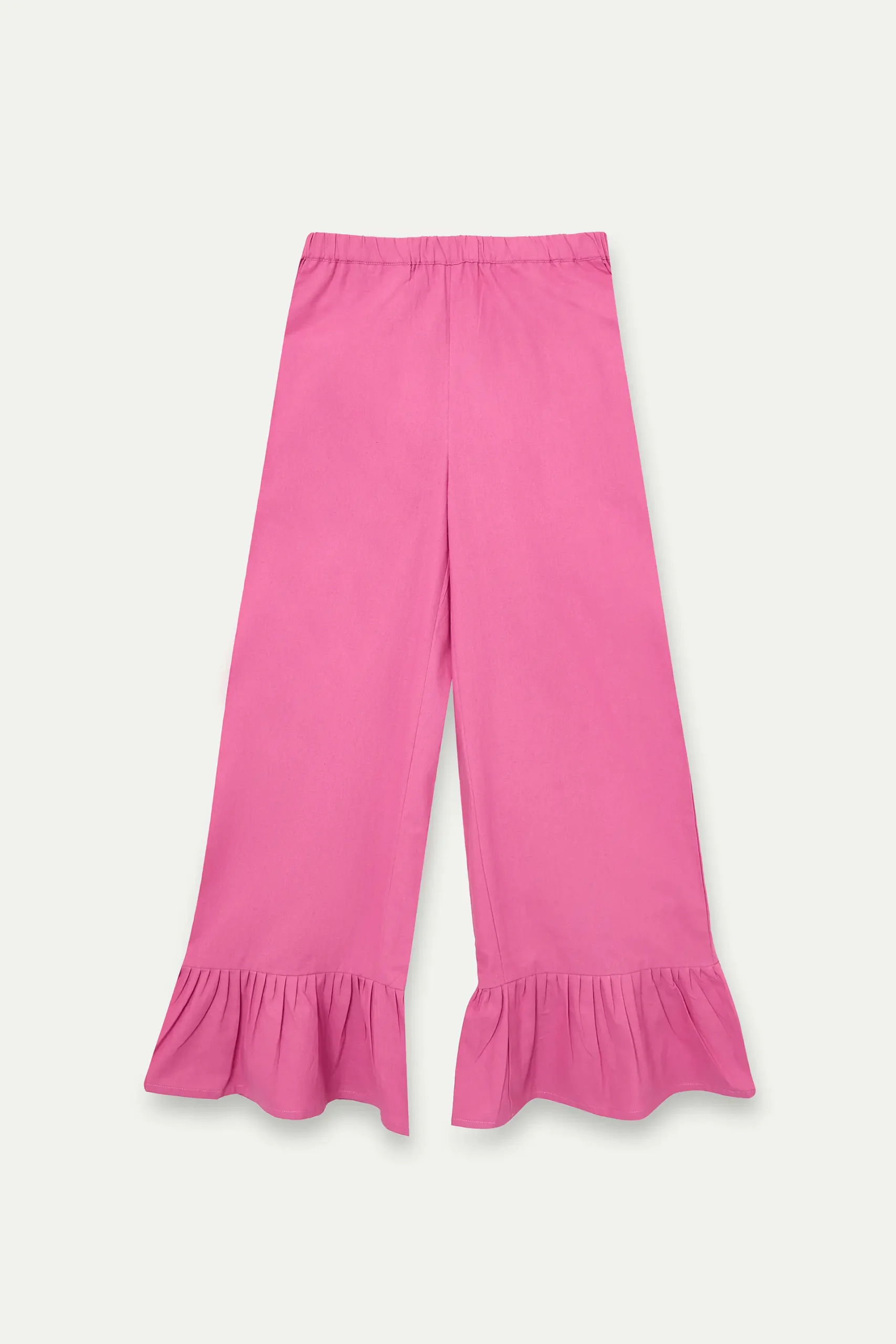 Pantalón de tejido 100% algodón de color rosa. Cintura elástica de tiro alto. Pernera recta. Detalle acampanado con volantes. La modelo mide 173 cm y lleva la talla S.