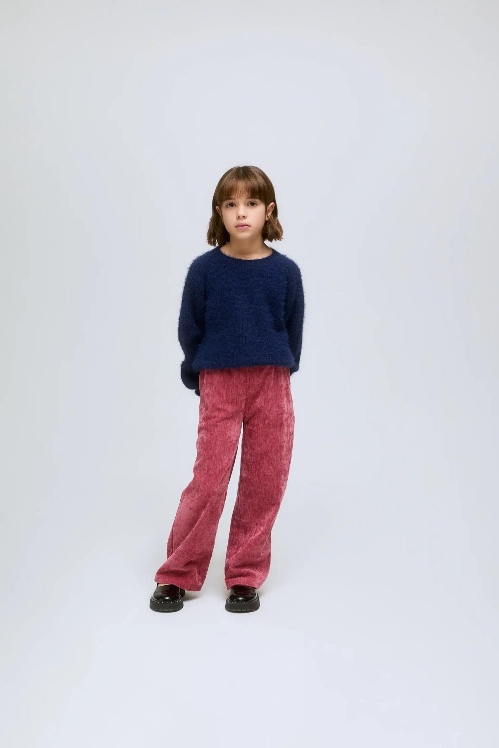 Pantalón de niña ancho en color rosa con cintura elástica, bolsillos laterales. Efecto aterciopelado, calentito y cómodo.