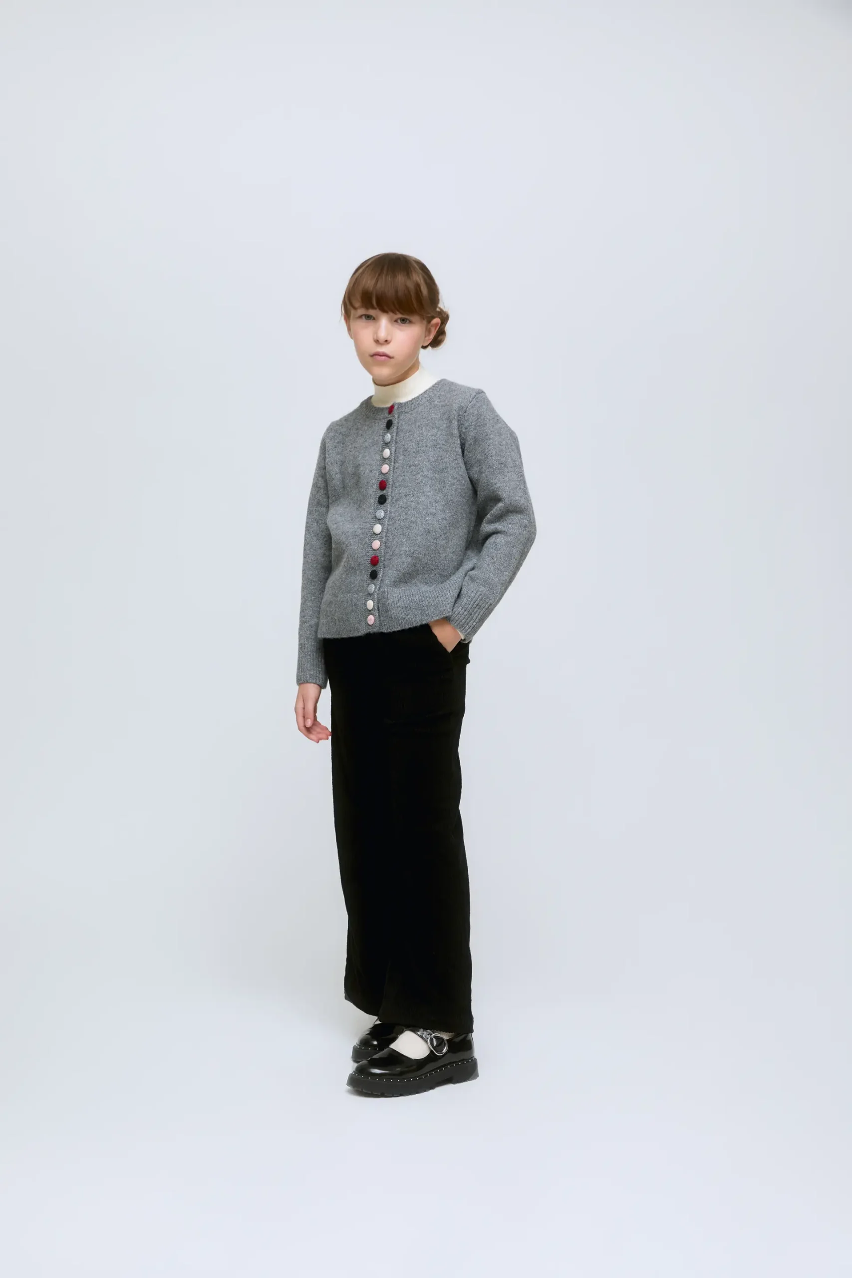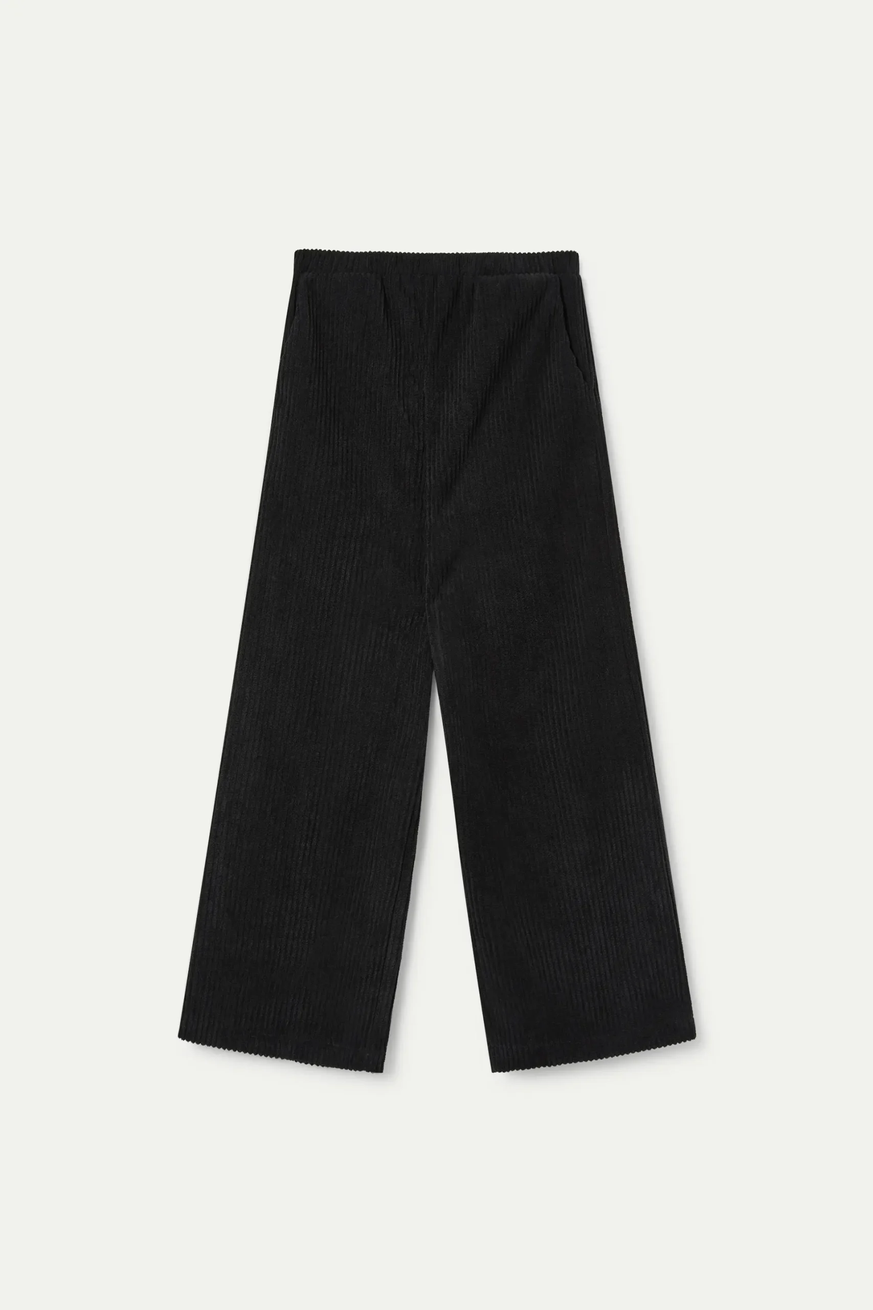 Pantalón ancho de niña de pana de color negro. Diseño recto y holgado con cinturilla elástica y bolsillos laterales. Cómo y funcional.