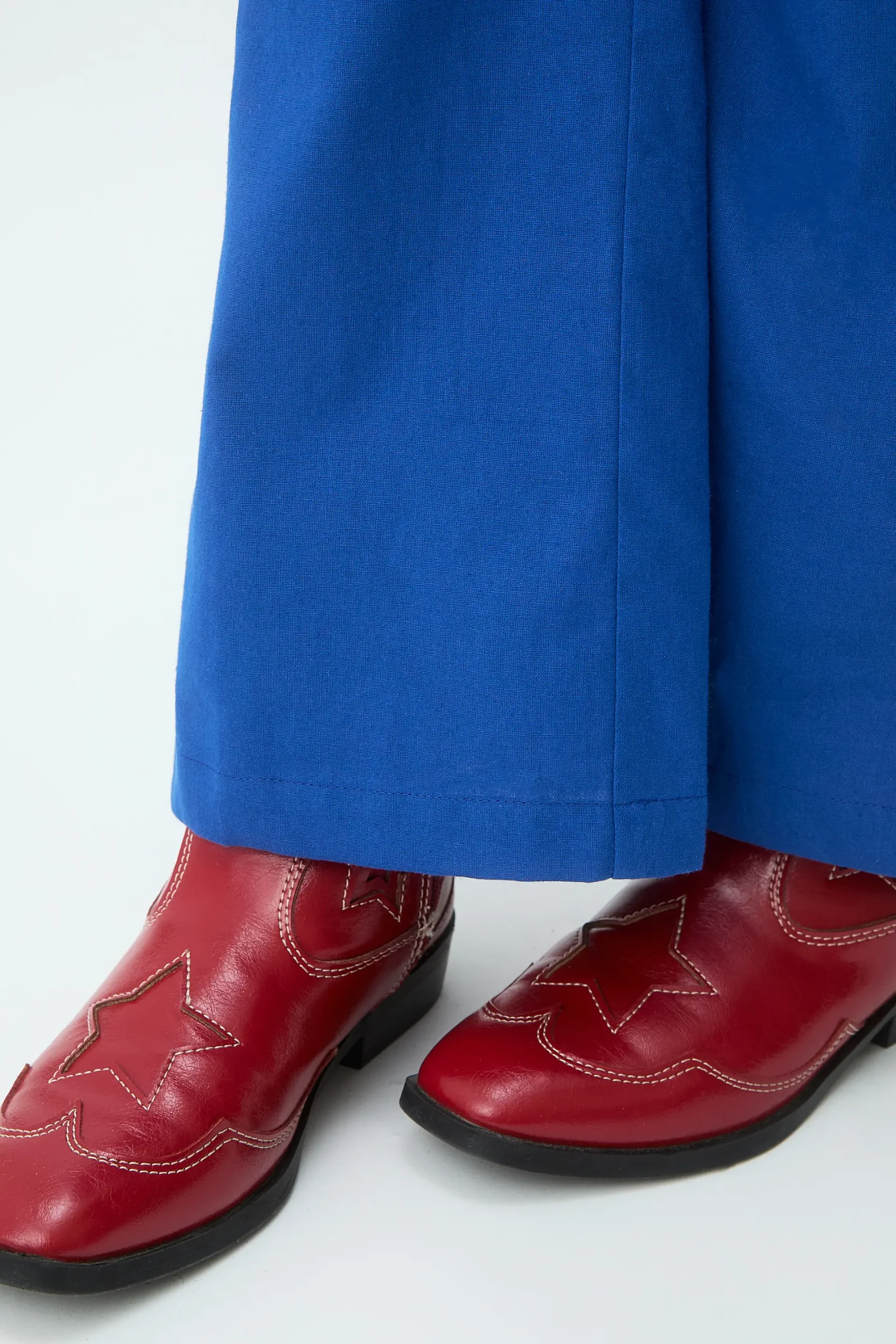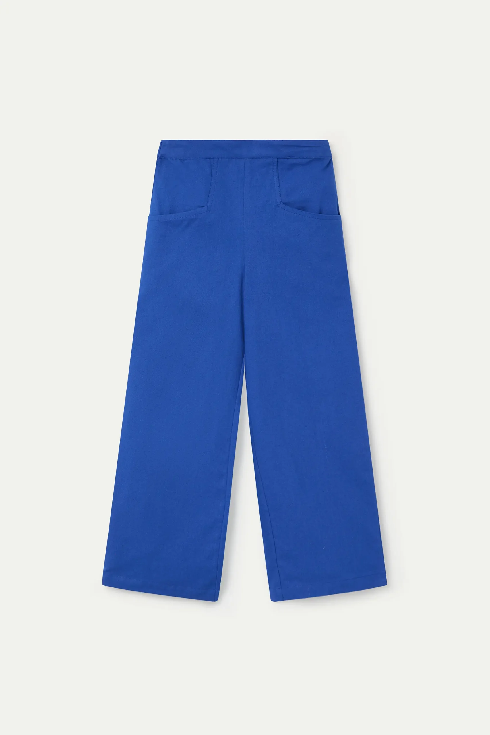 Pantalón de niña con tejido 100% algodón de color azul. Cintura elástica de tiro alto. Pernera recta. Bolsillos frontales funcionales. La modelo mide 133 cm y lleva la talla 8-9 años.
