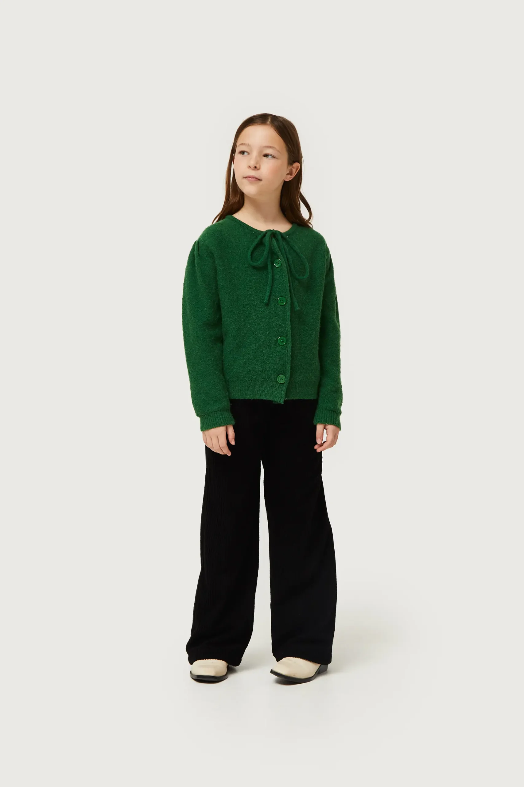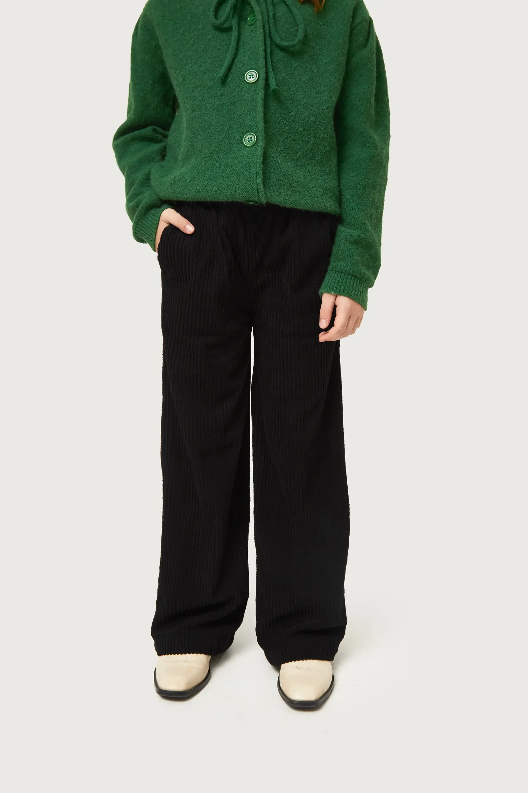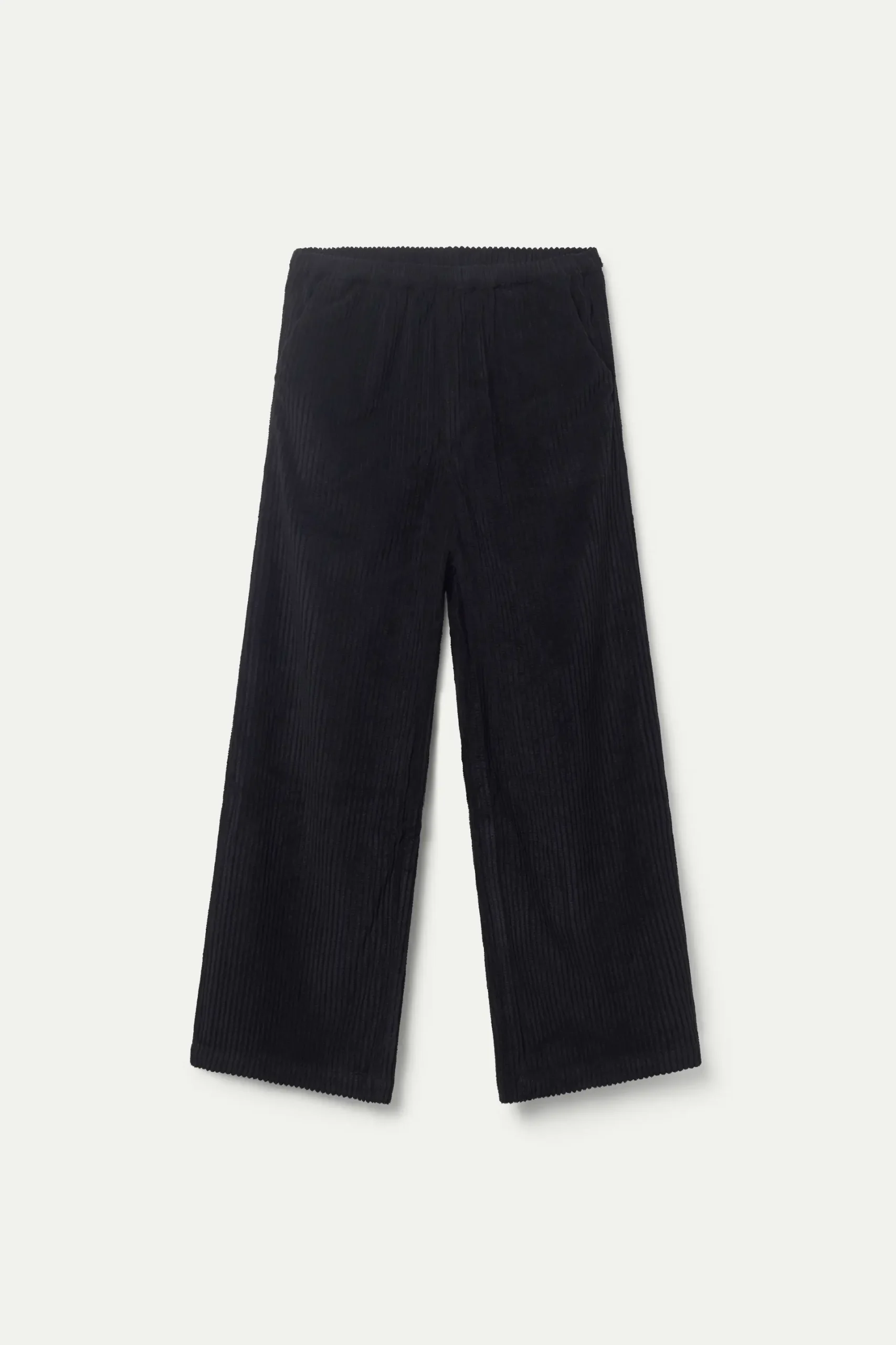 Pantalón de niña de pana de color negro. Con cintura elástica y pernera recta. Bolsillos laterales. La modelo mide 134 cm y lleva la talla 8.