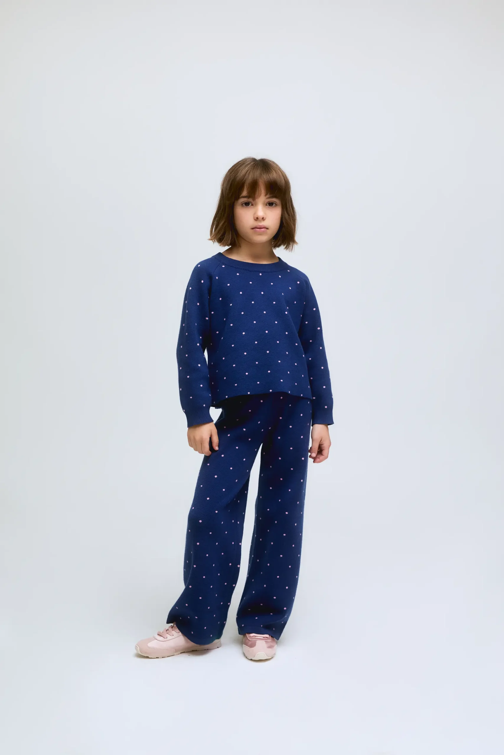 Pantalón de niña de punto azul marino con lunares rosas. Con cintura elástica y pernera recta.