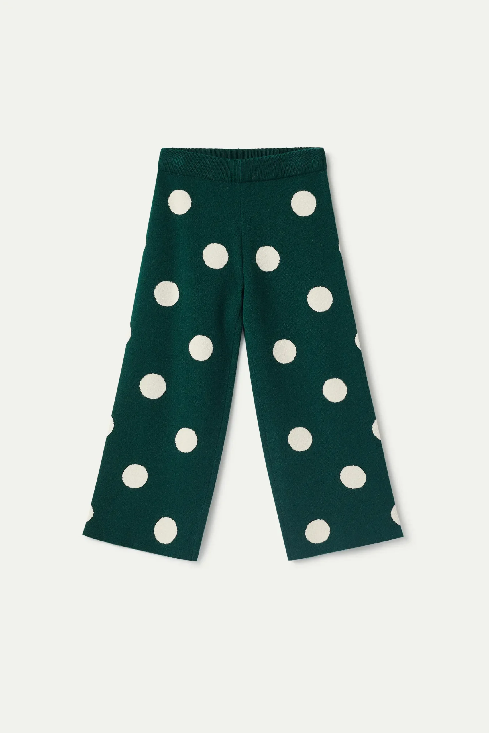 Pantalón de niña en punto jacquard de color verde con estampado de lunares blancos. Con cintura elástica y pernera recta. La modelo mide 140 cm y lleva la talla 8.