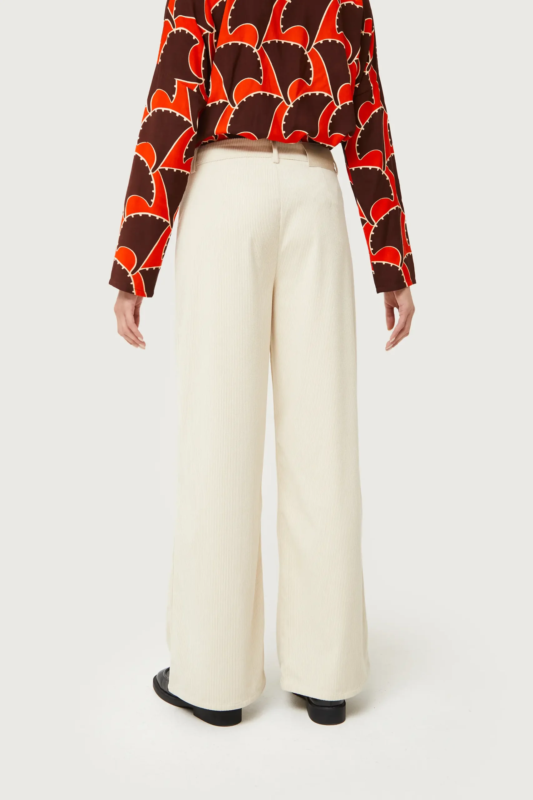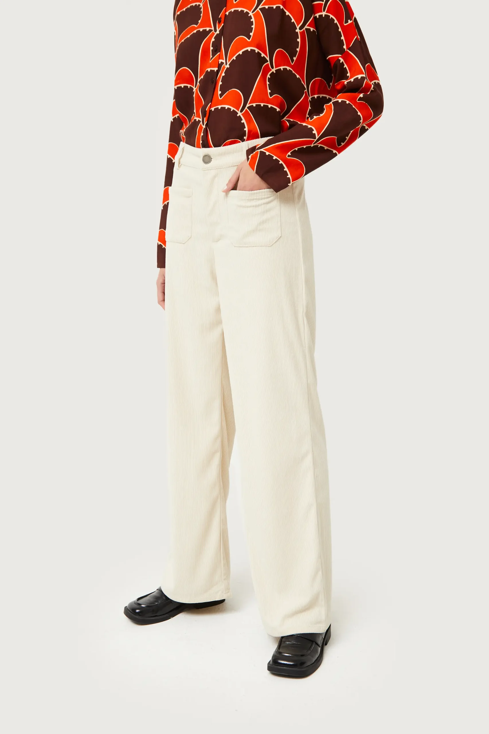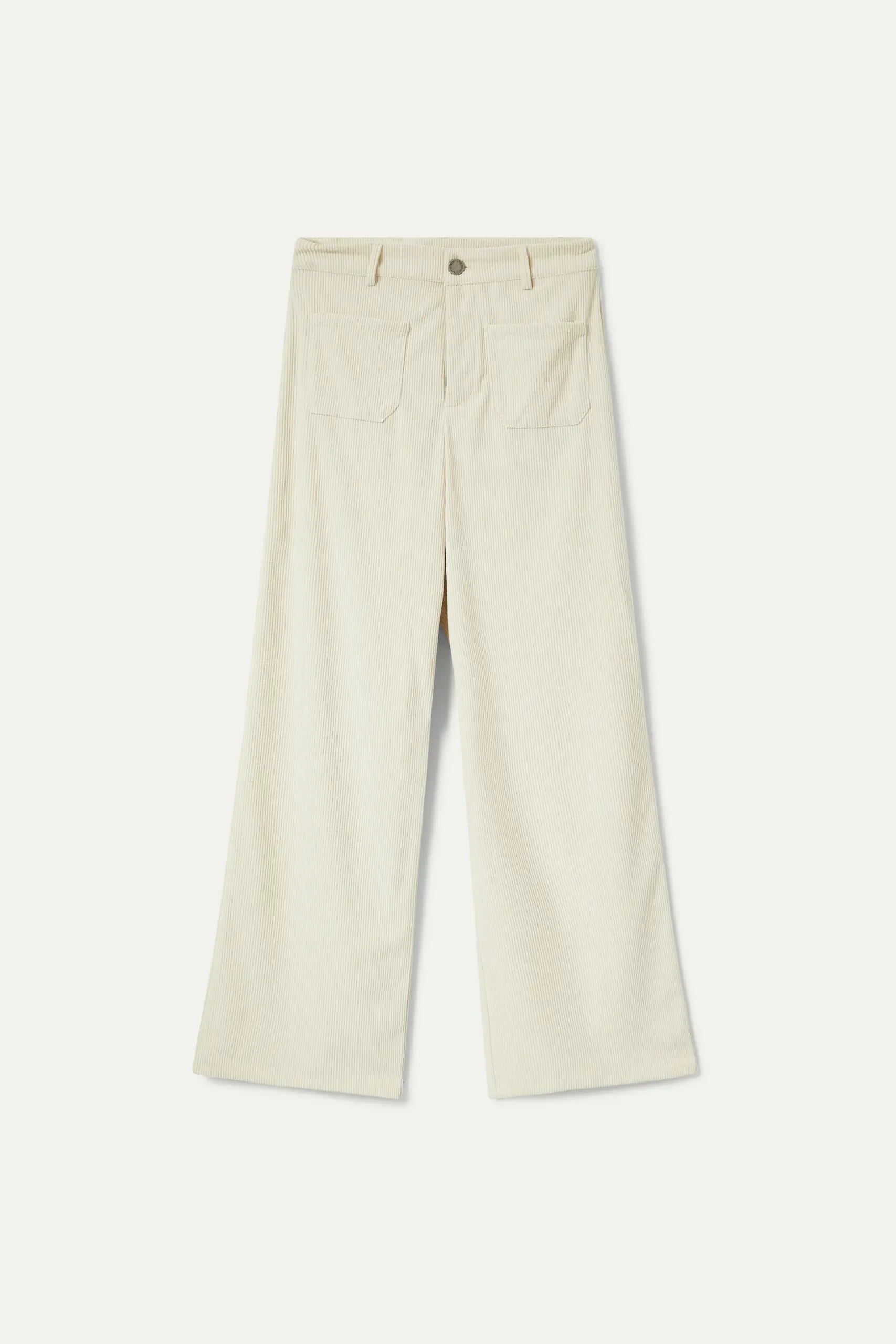 Pantalón largo de pana de color blanco roto. Con cintura de tiro medio y pernera recta. Cierre con botón y cremallera. Detalle de bolsillos frontales y trabillas para el cinturón. La modelo mide 176 cm y lleva la talla S.