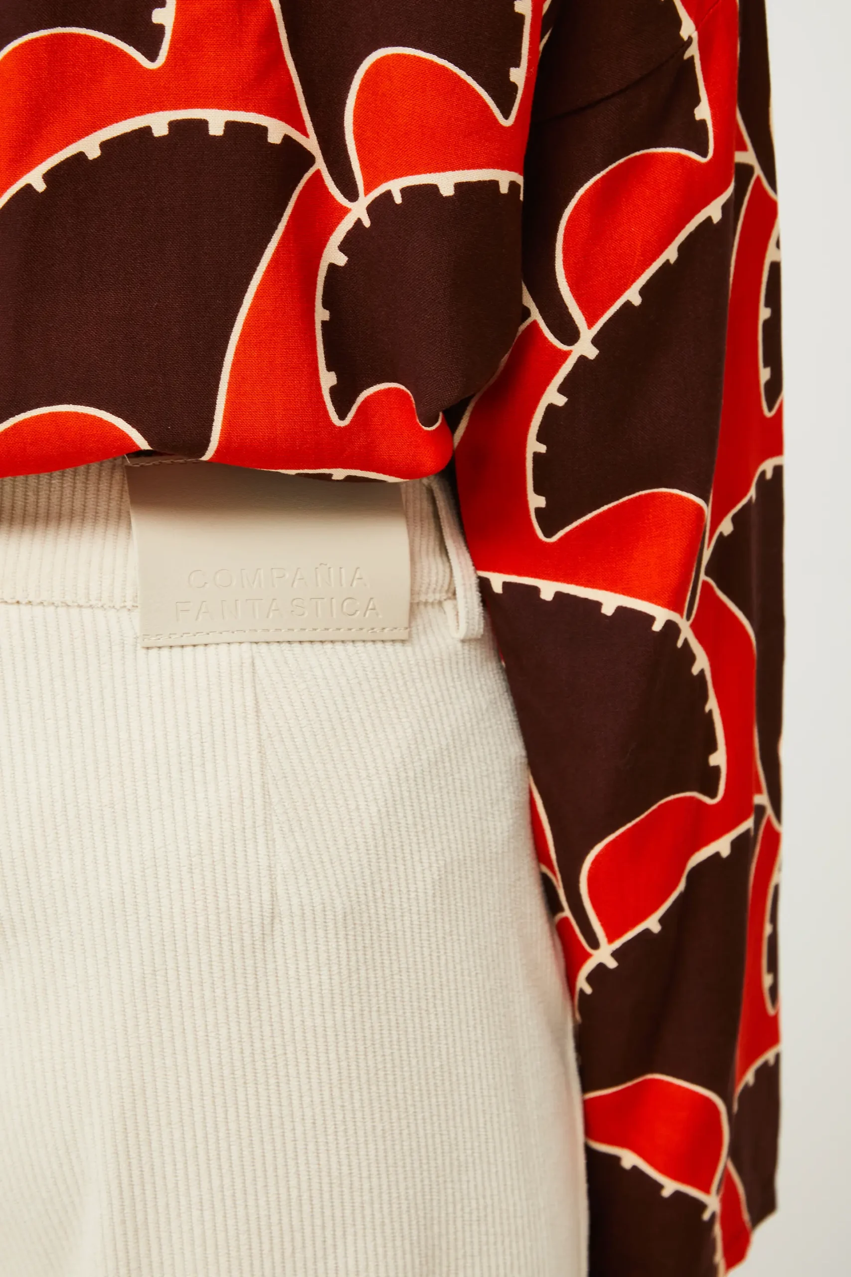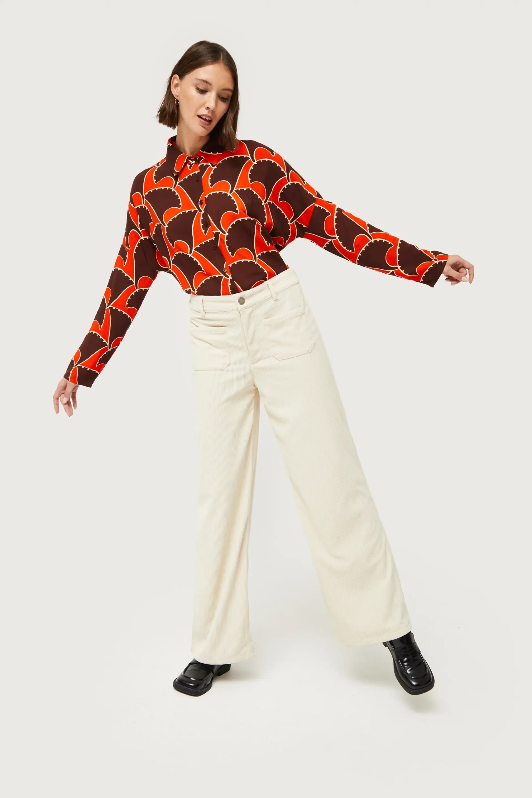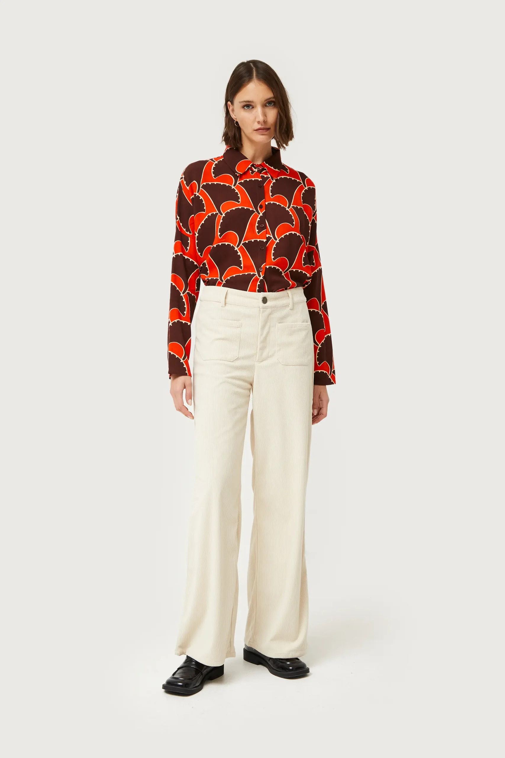Pantalón largo de pana de color blanco roto. Con cintura de tiro medio y pernera recta. Cierre con botón y cremallera. Detalle de bolsillos frontales y trabillas para el cinturón. La modelo mide 176 cm y lleva la talla S.