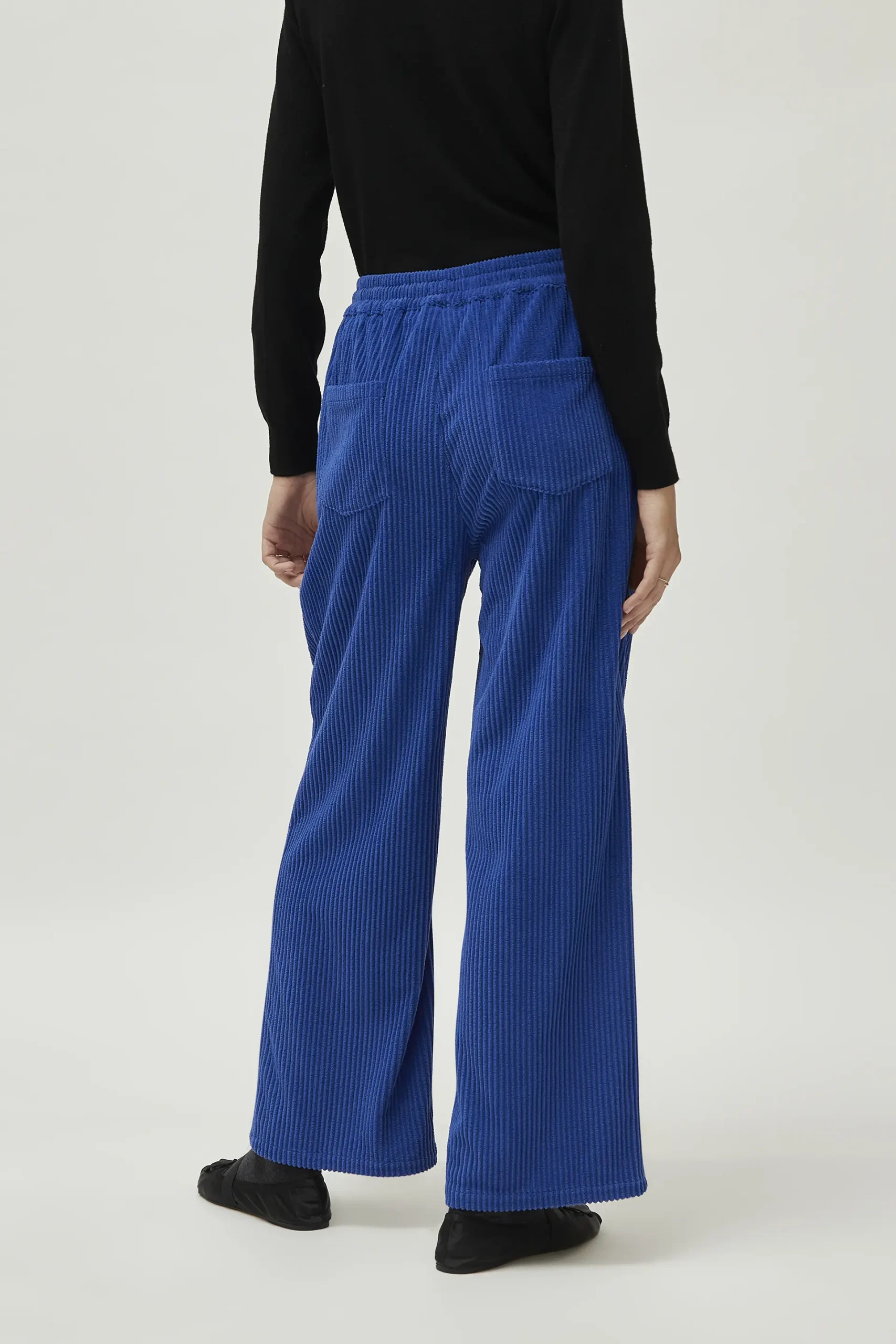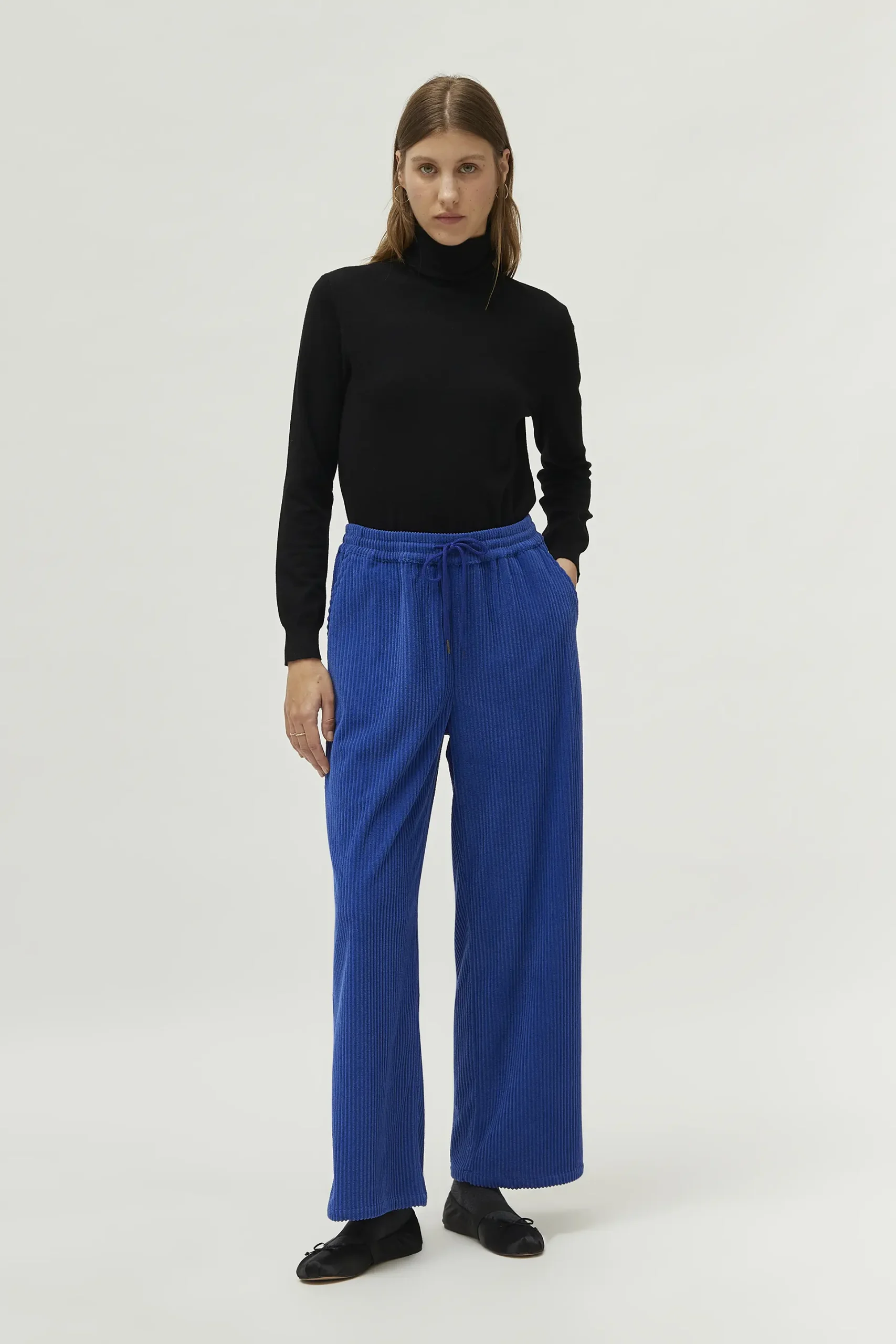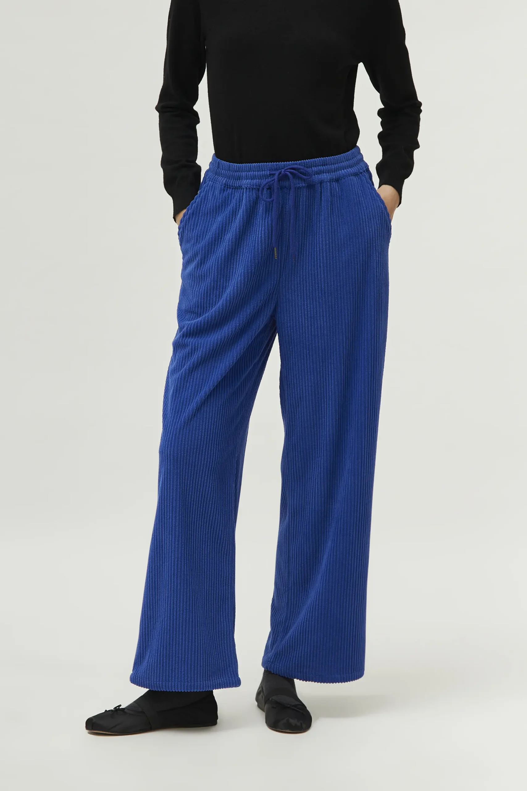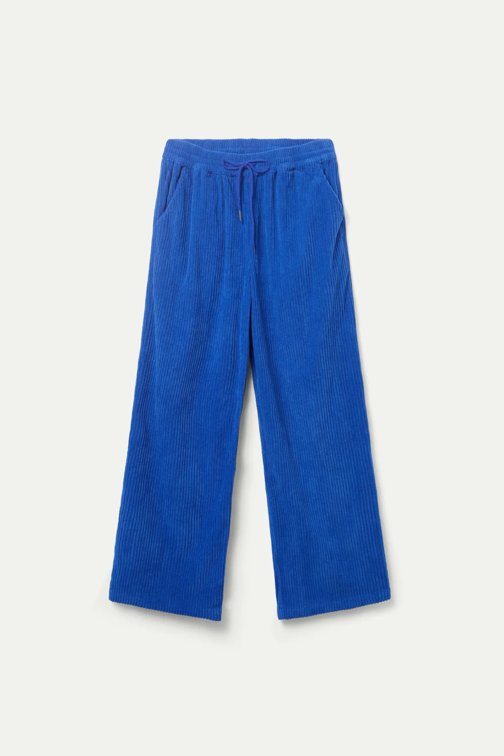 Pantalón largo de pana de color azul. Con cintura elástica con cordón ajustable y pernera ancha. Bolsillos laterales y traseros. La modelo mide 177 cm y lleva la talla S.