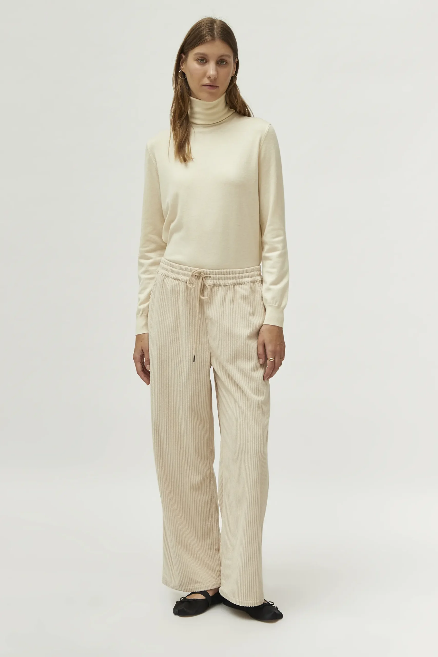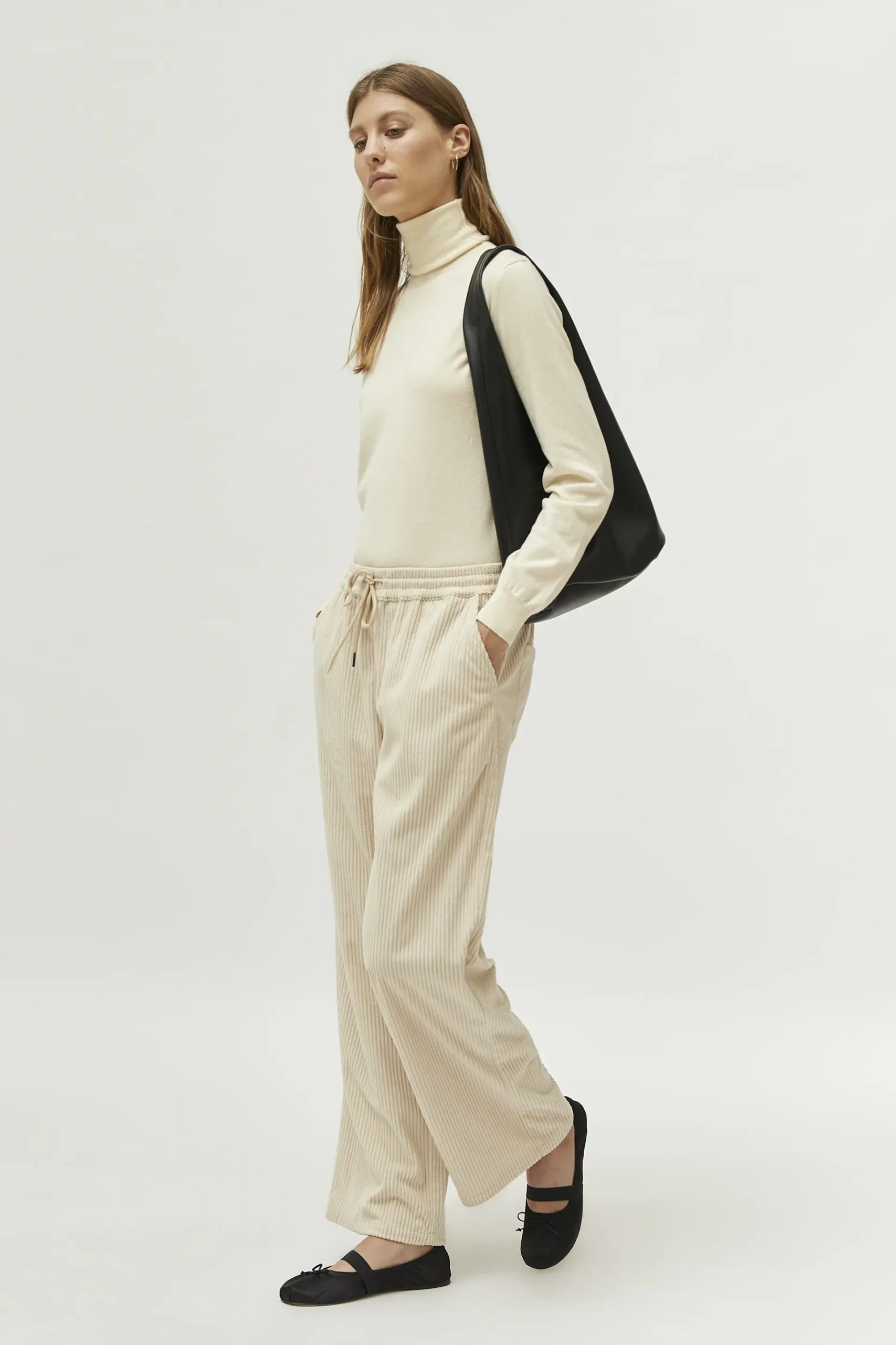 Pantalón largo de pana de color blanco roto. Con cintura elástica con cordón ajustable y pernera ancha. Bolsillos laterales y traseros. La modelo mide 177 cm y lleva la talla S.
