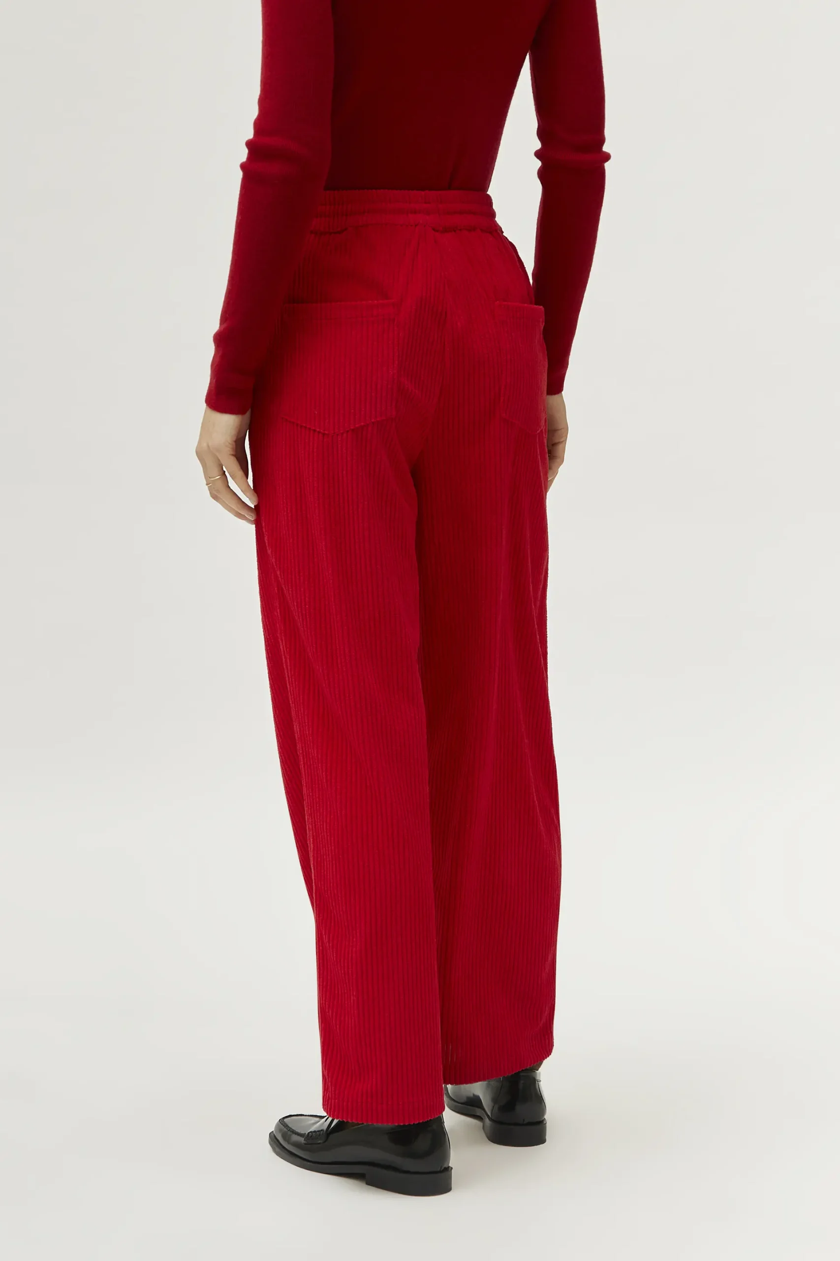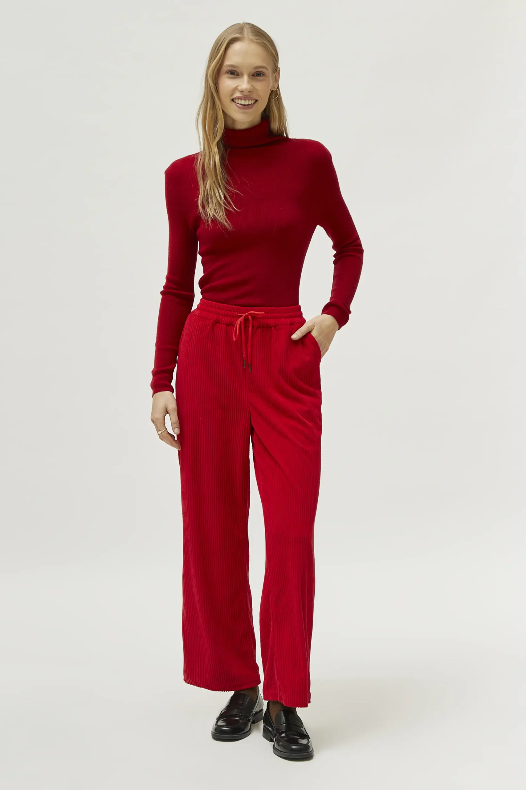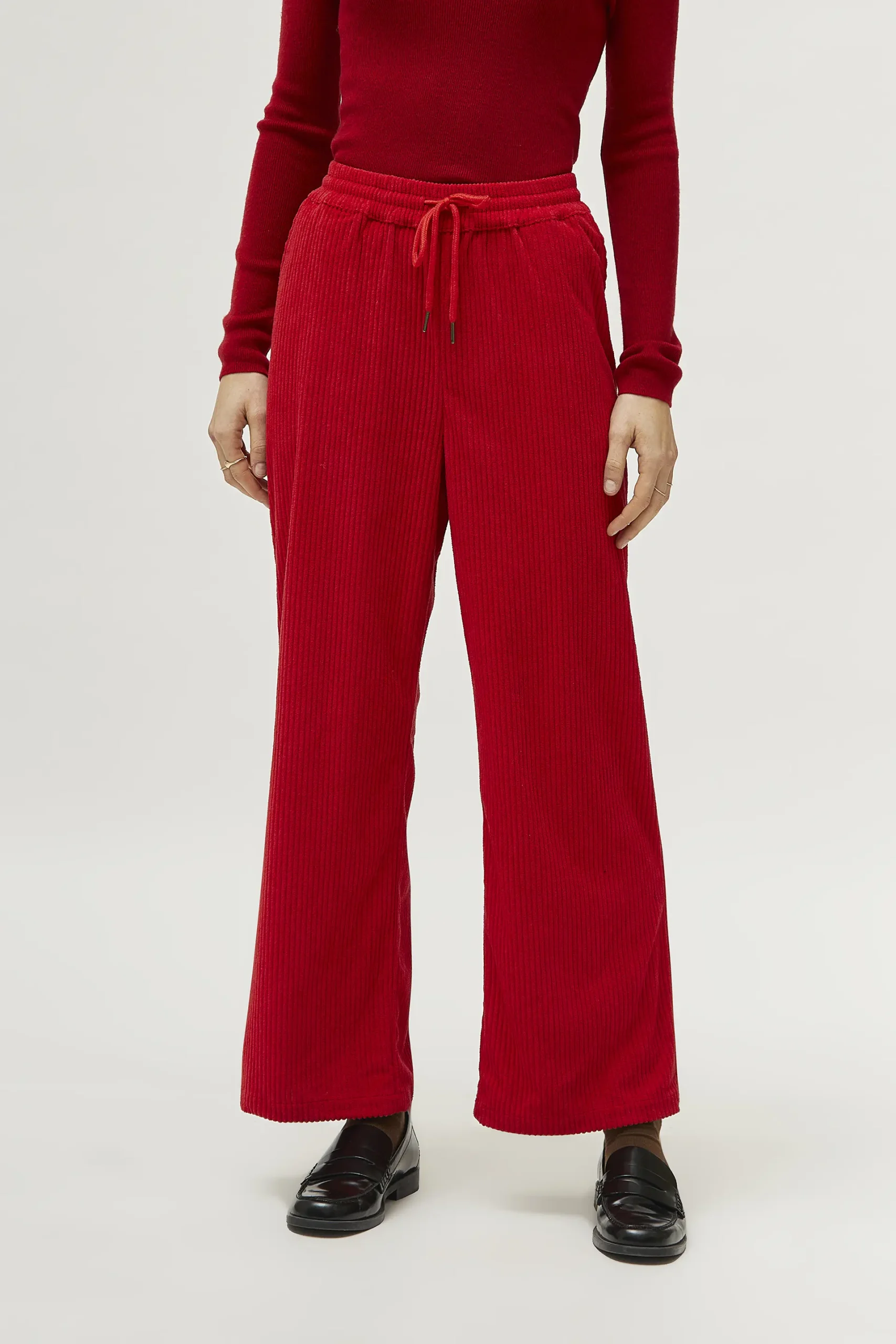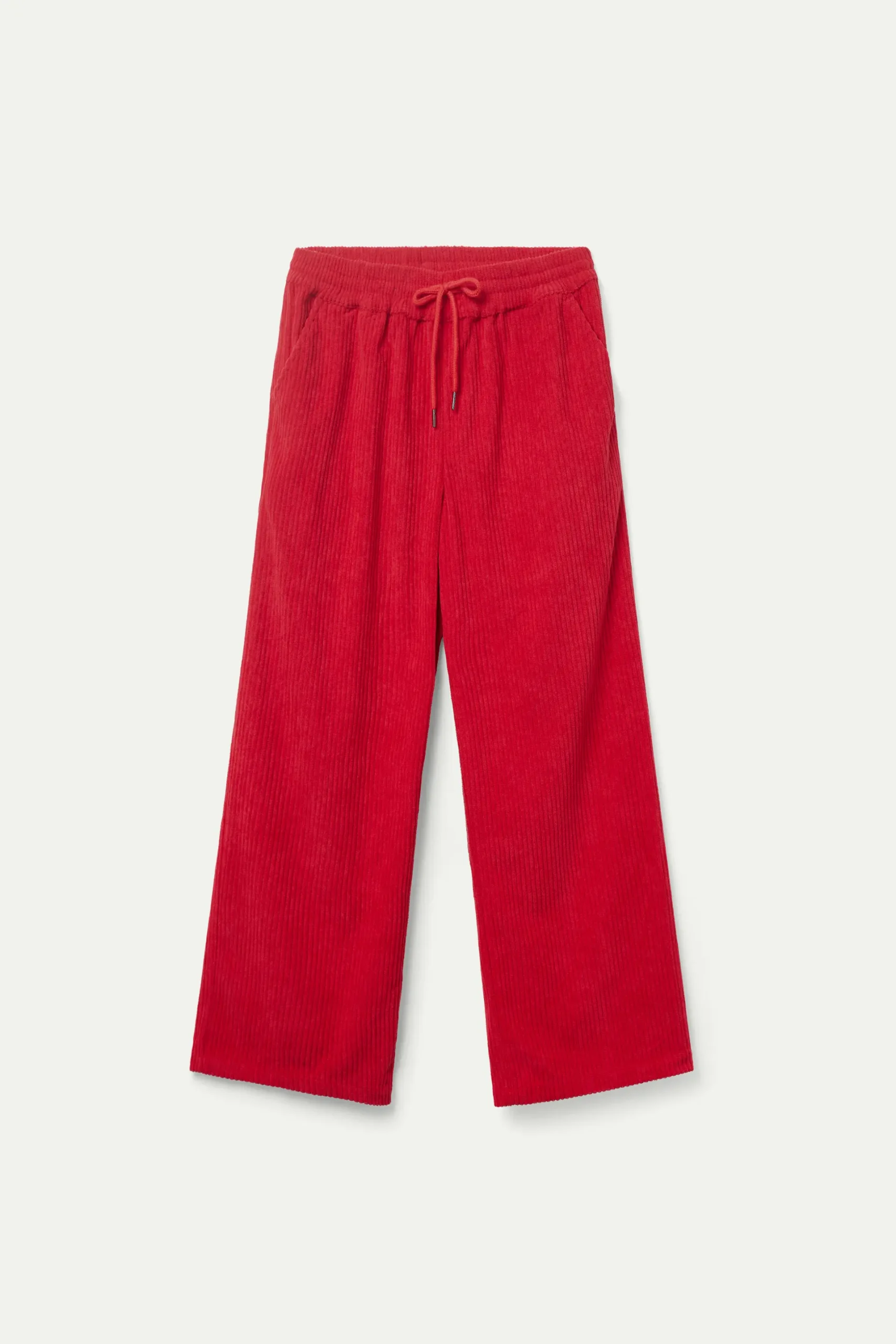Pantalón largo de pana de color rojo. Con cintura elástica con cordón ajustable y pernera ancha. Bolsillos laterales y traseros. La modelo mide 174 cm y lleva la talla S.