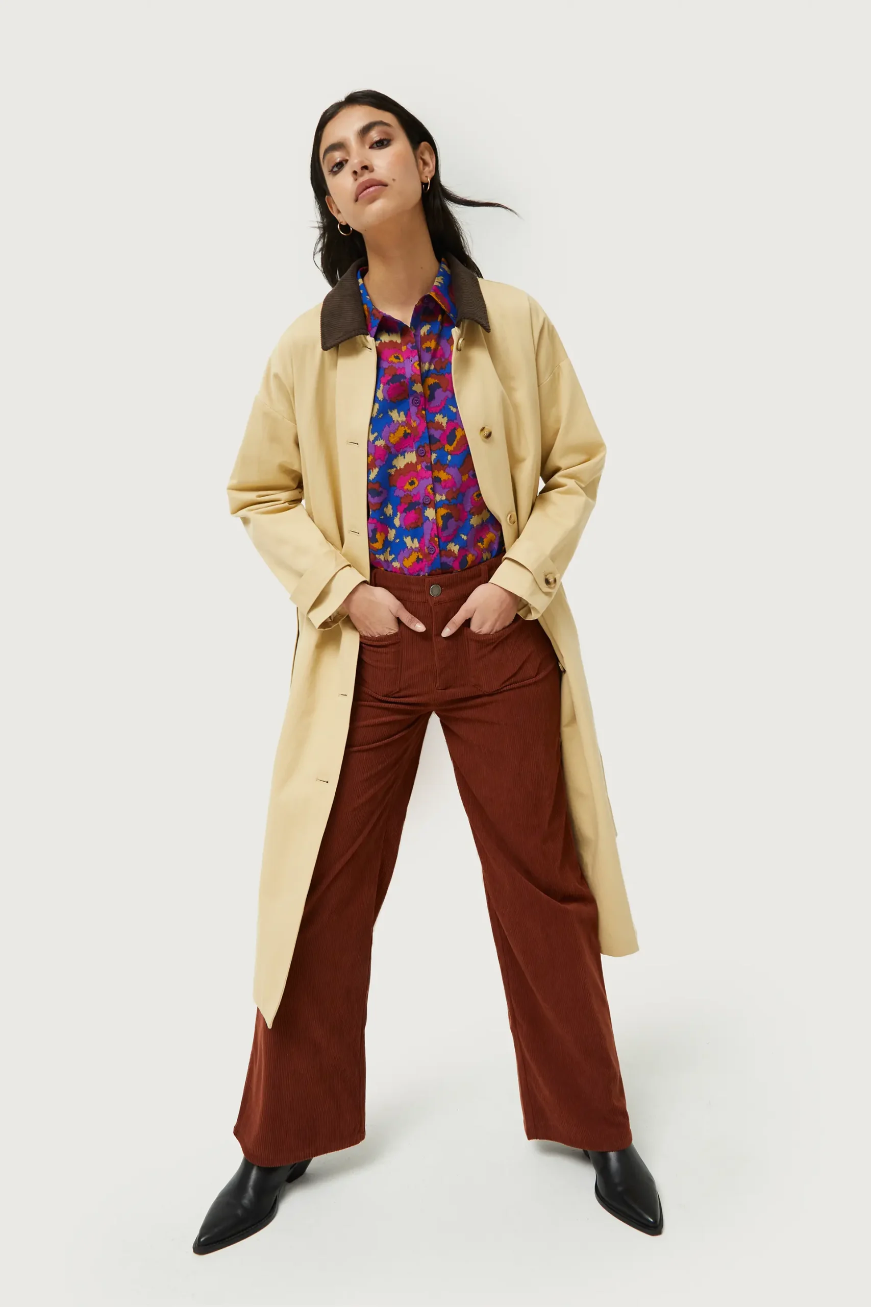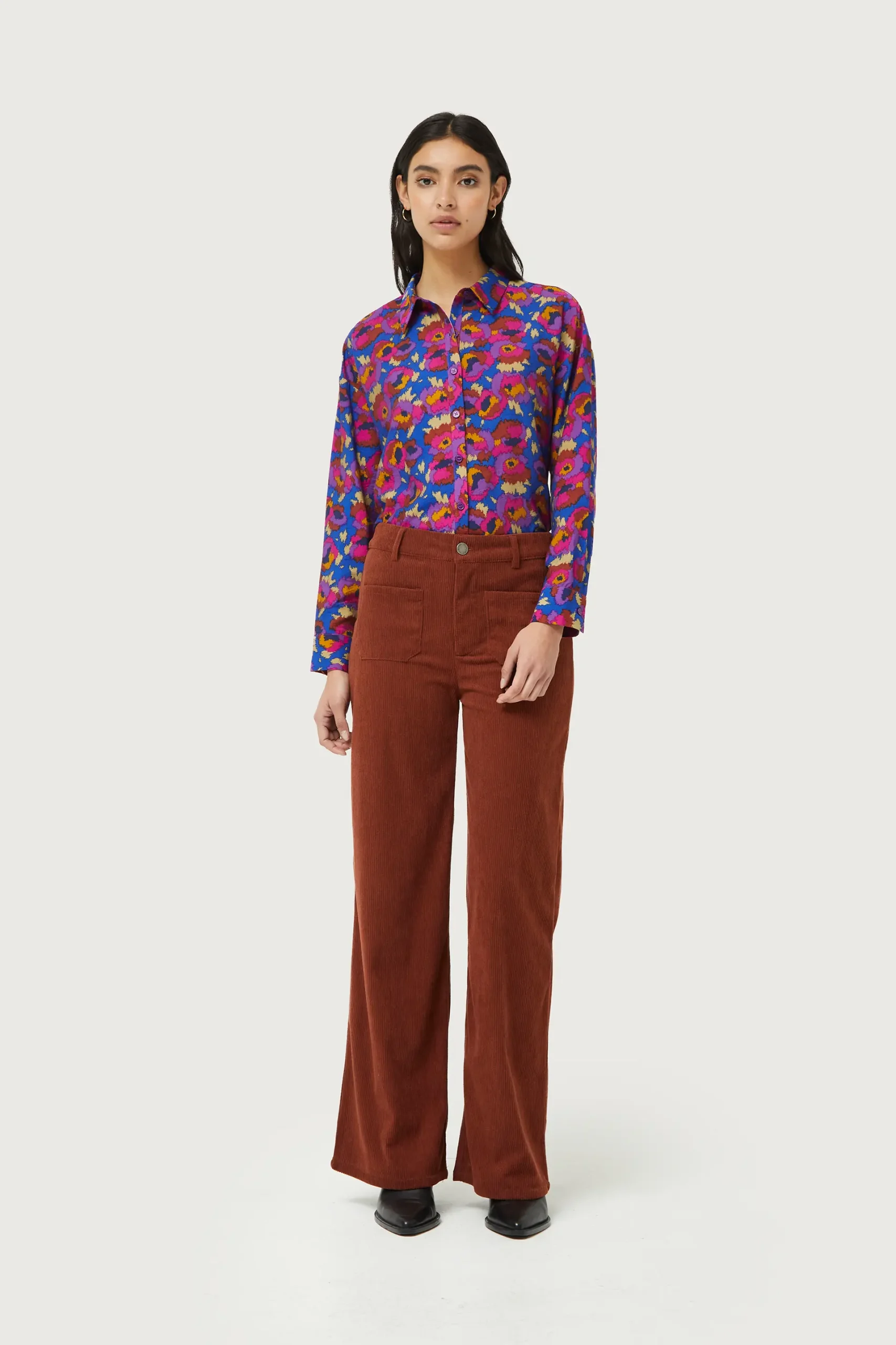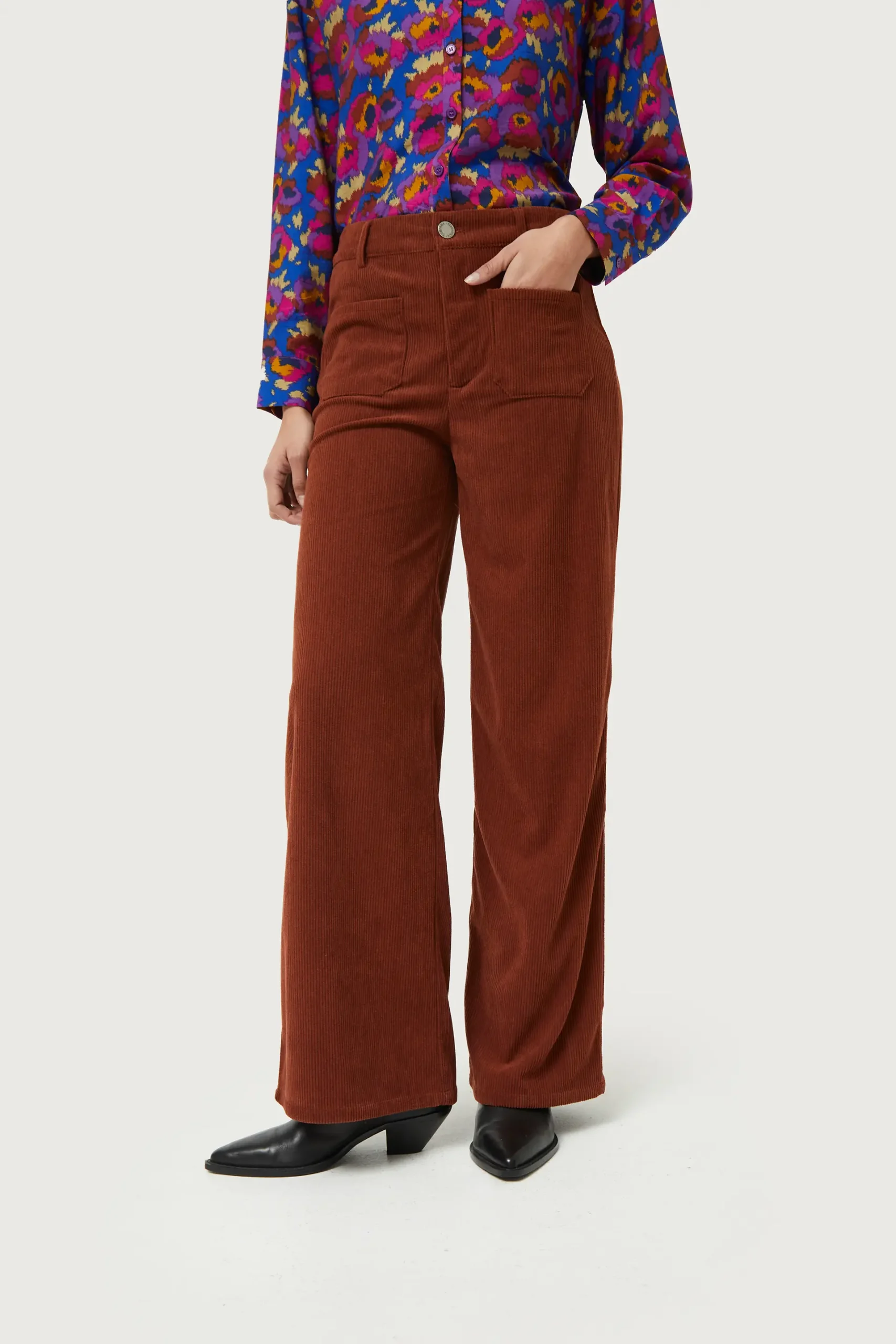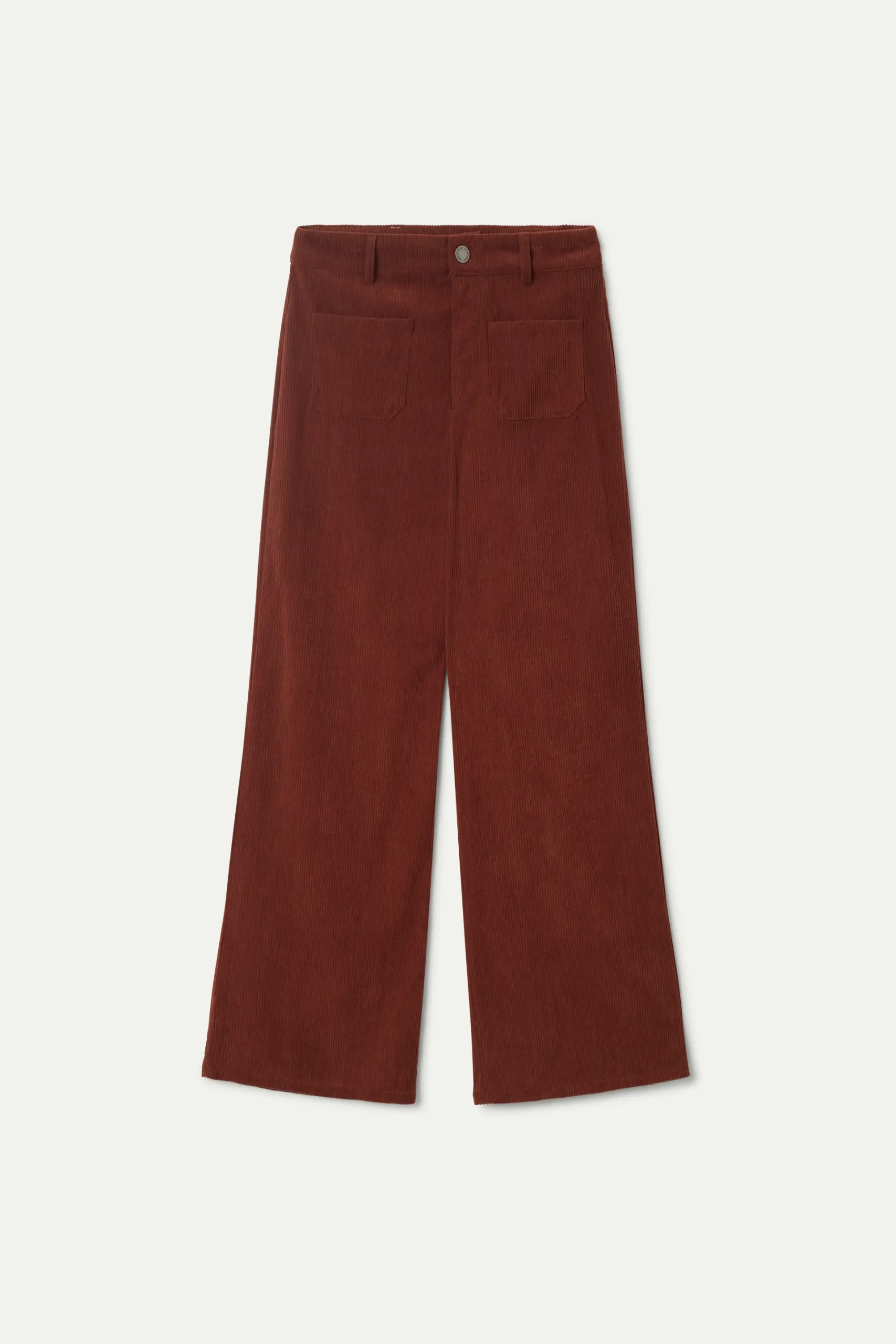 Pantalón largo de pana de color marrón. Con cintura de tiro medio y pernera recta. Cierre con botón y cremallera. Detalle de bolsillos frontales y trabillas para el cinturón. La modelo mide 176 cm y lleva la talla S.