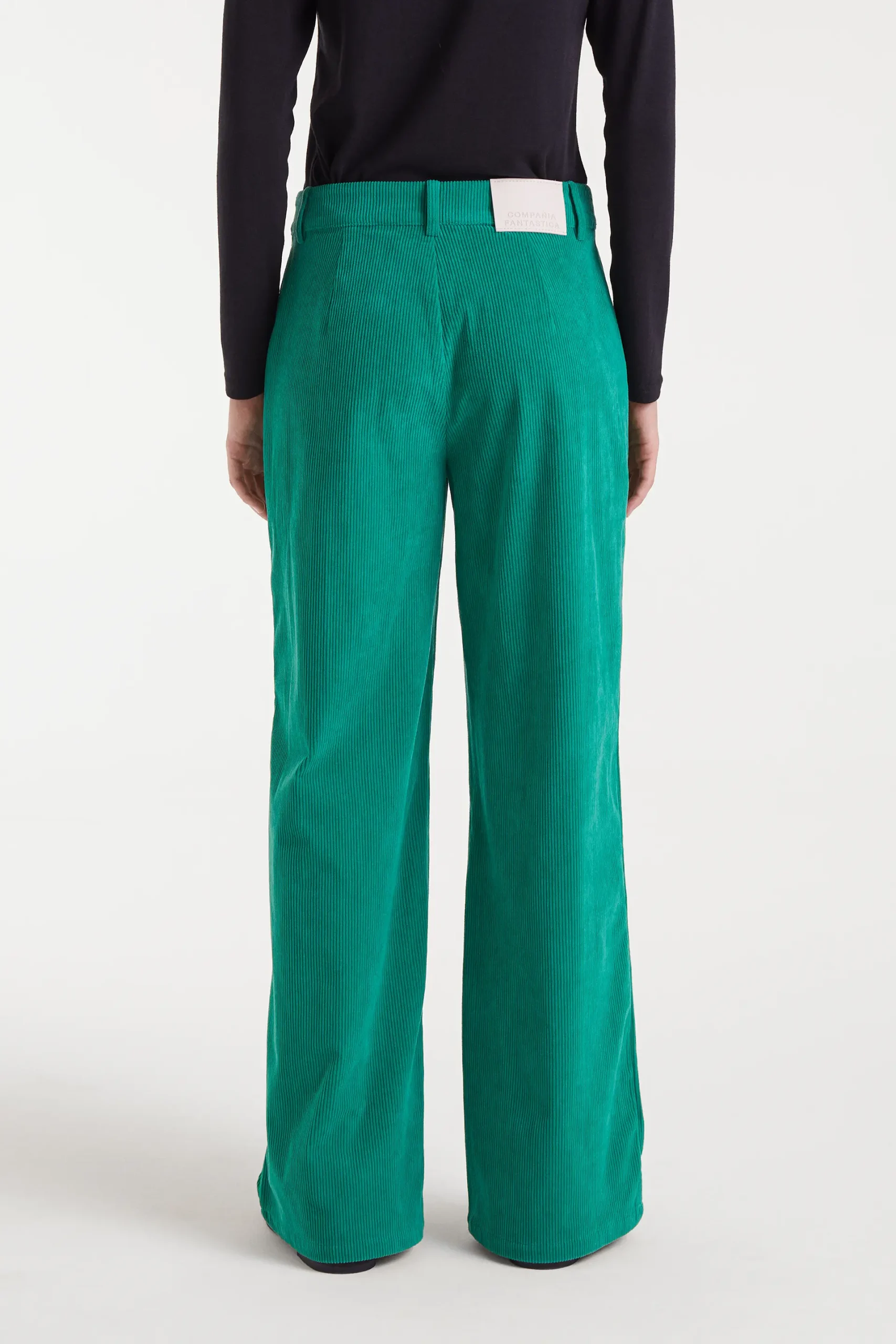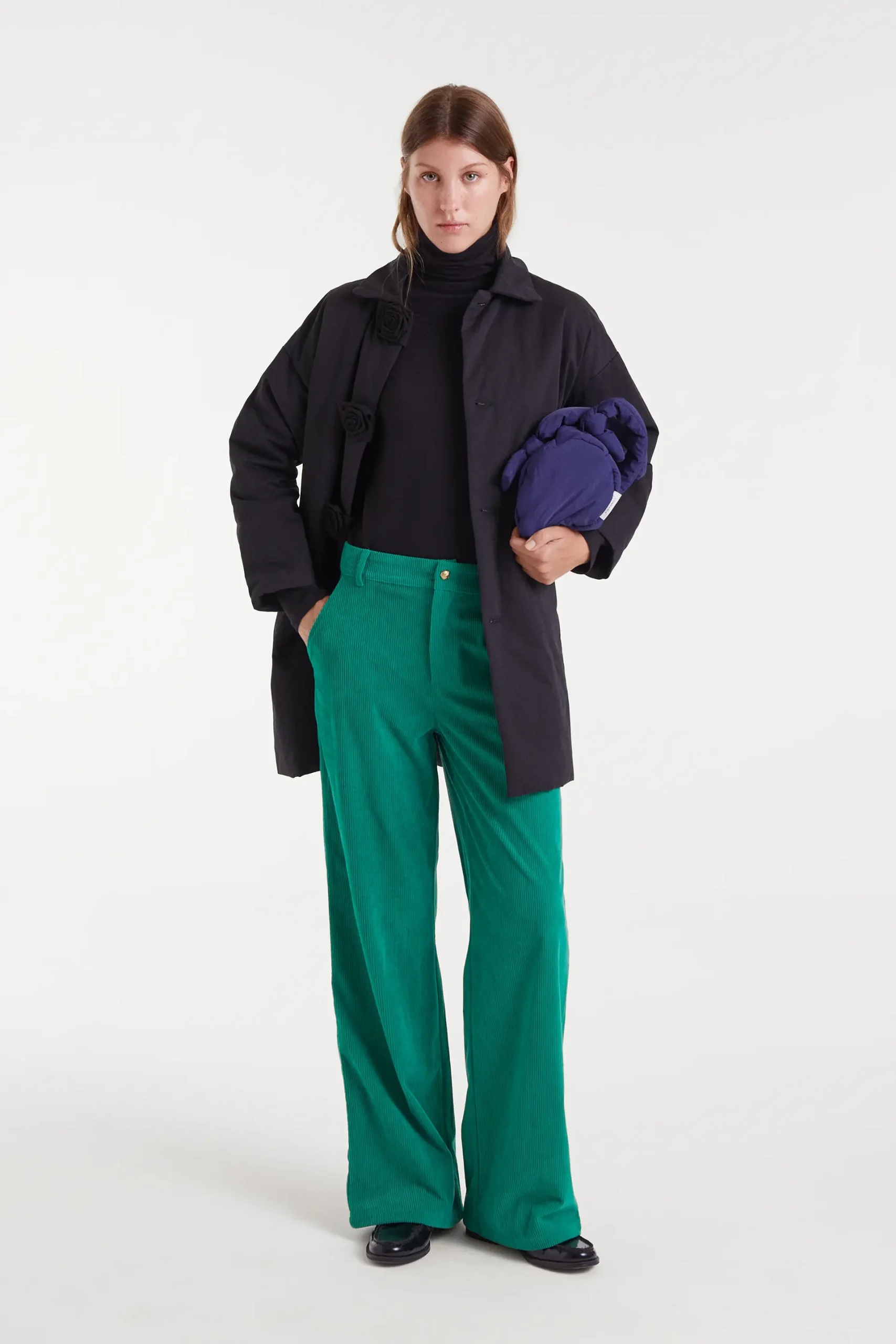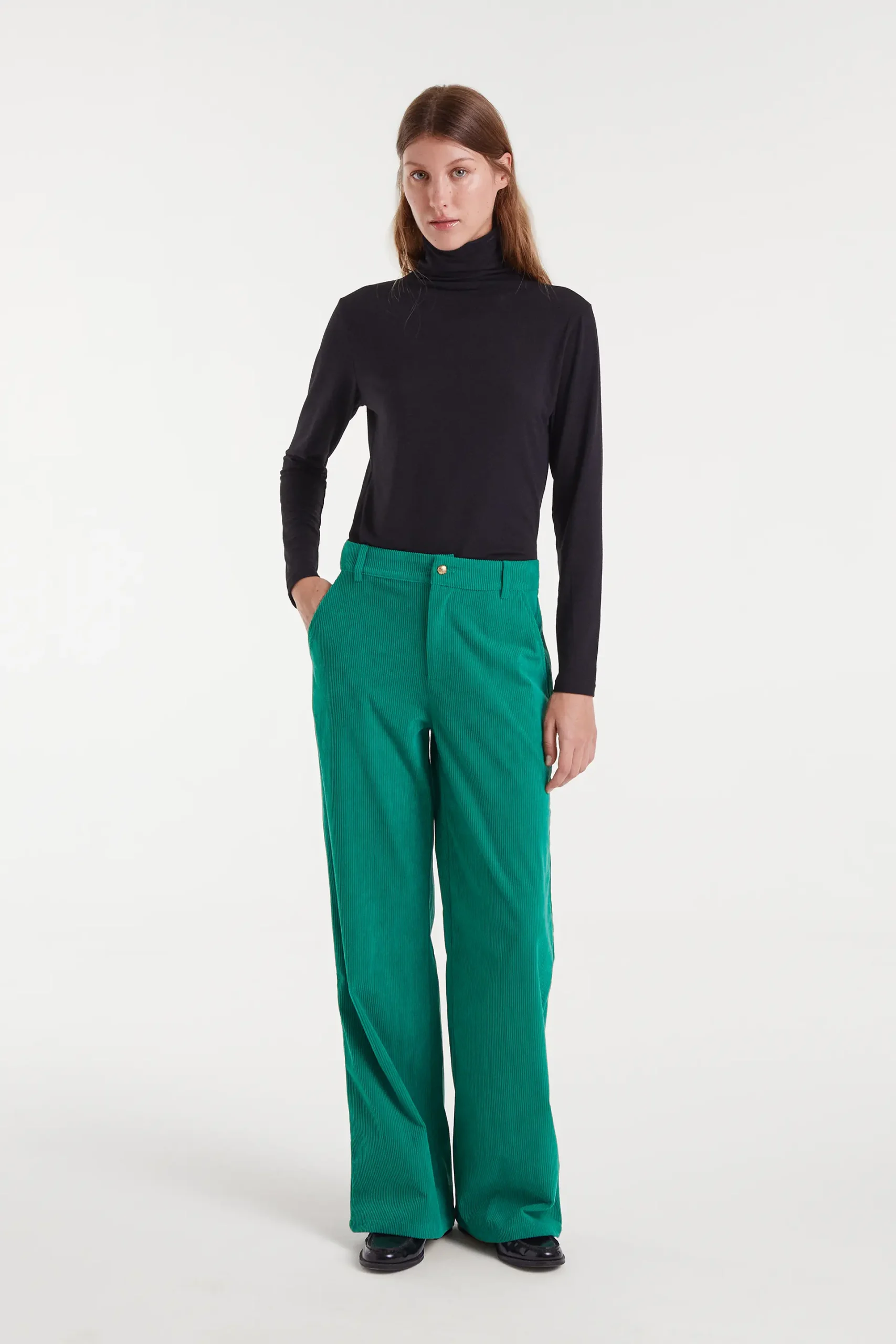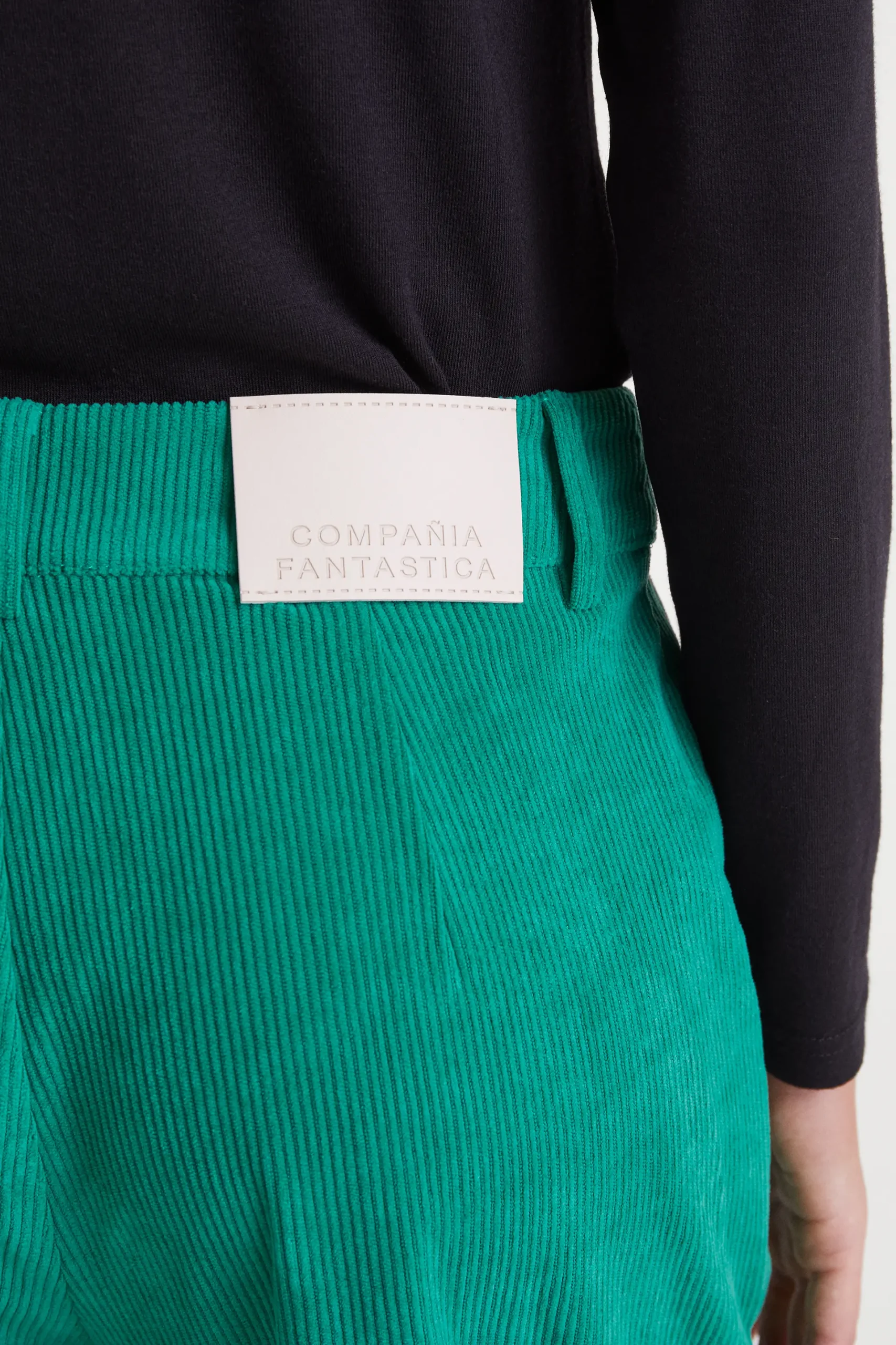 Pantalón con tejido de pana de color verde. Con cintura fija de tiro medio y pernera de corte recto. Cierre frontal con cremallera y botón metálico. Bolsillos laterales. La modelo mide 177 cm y lleva la talla S.