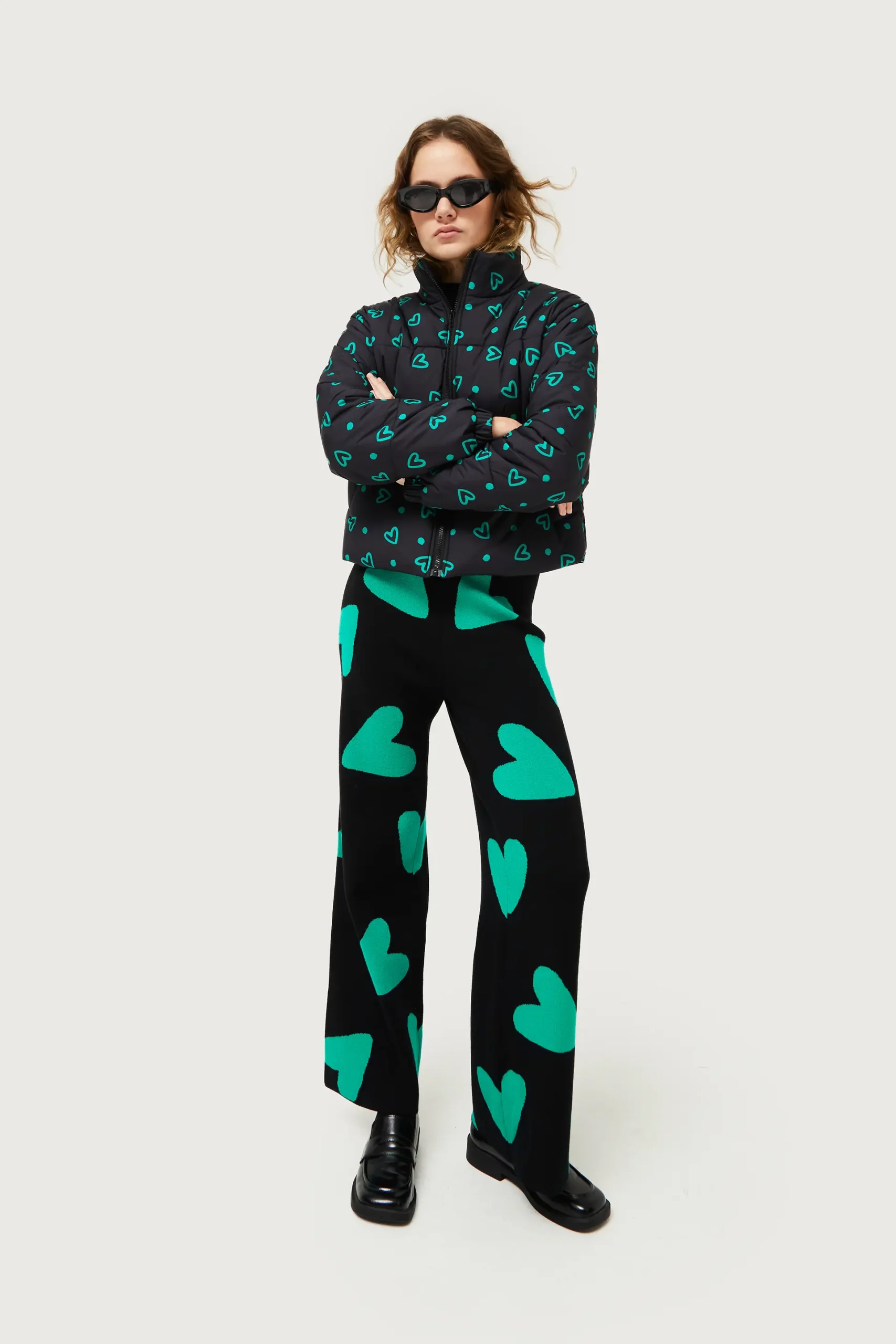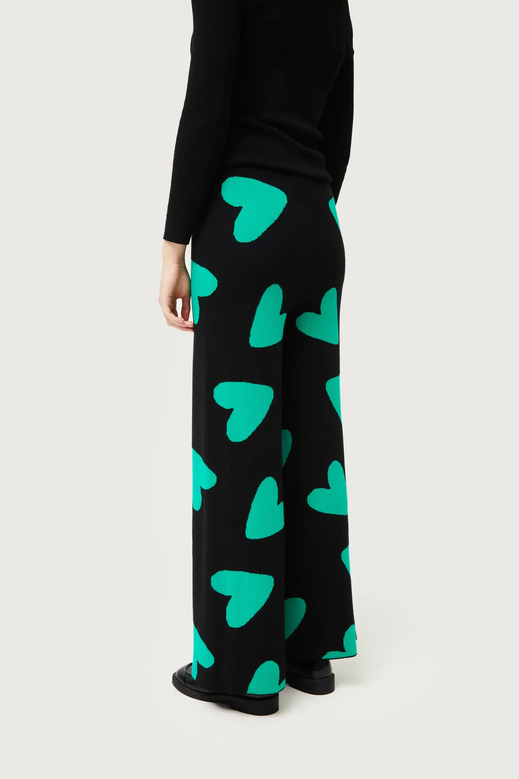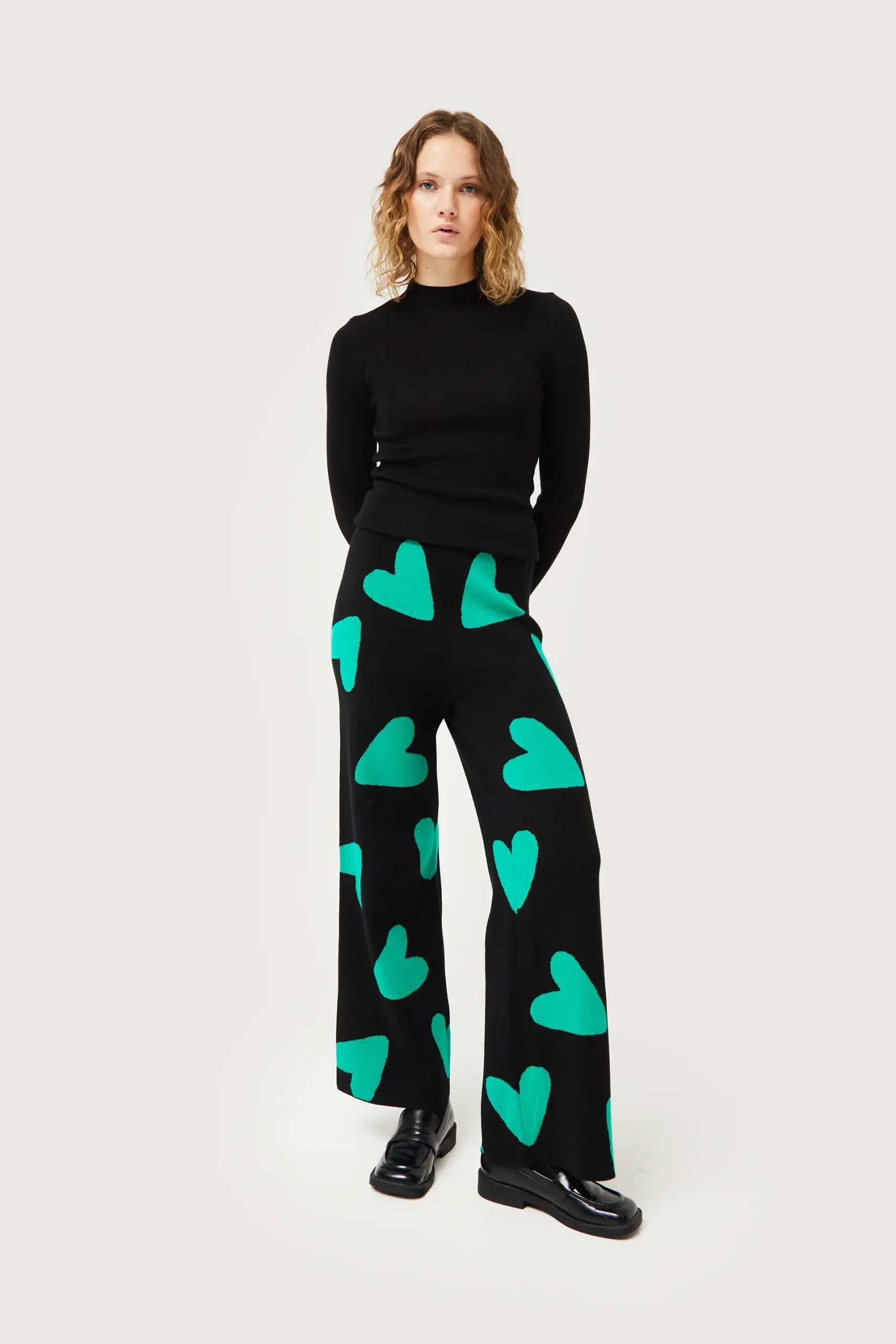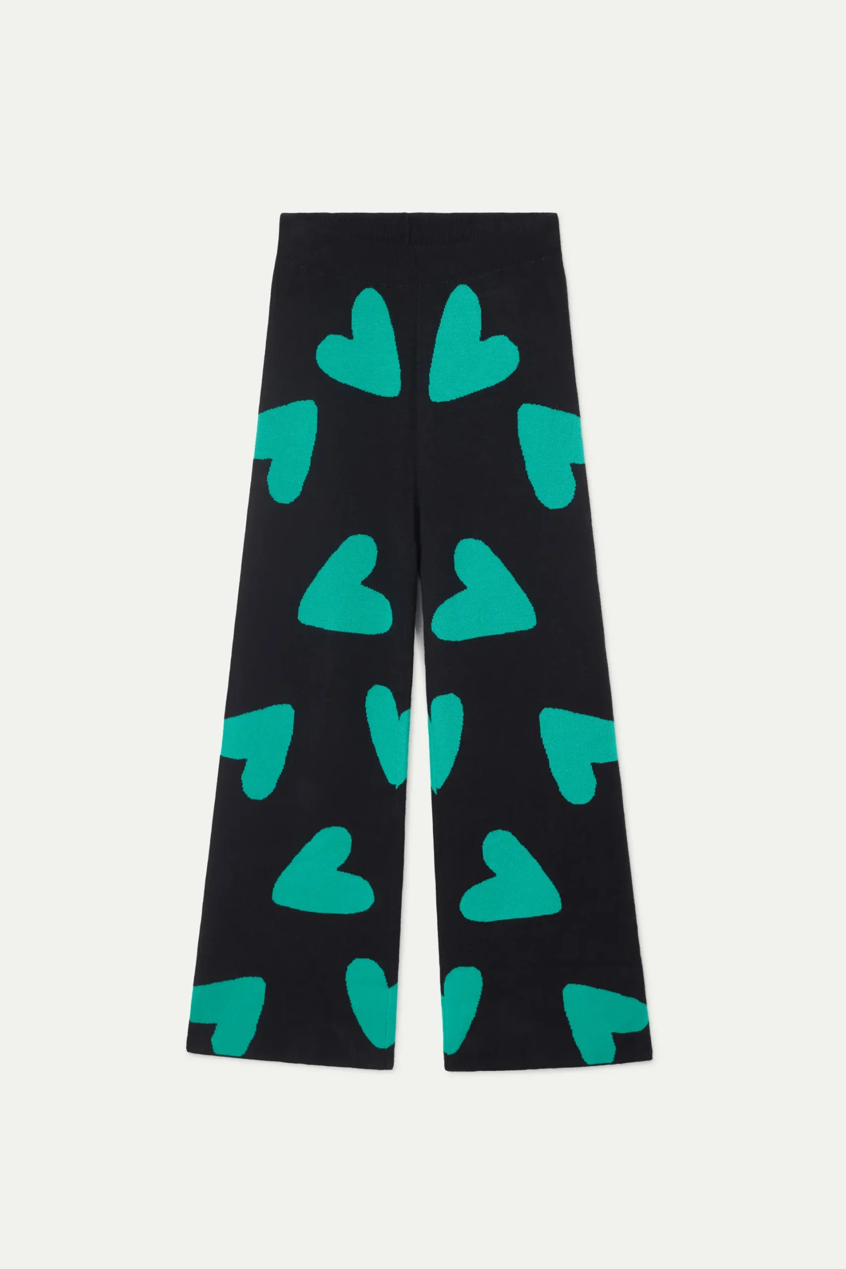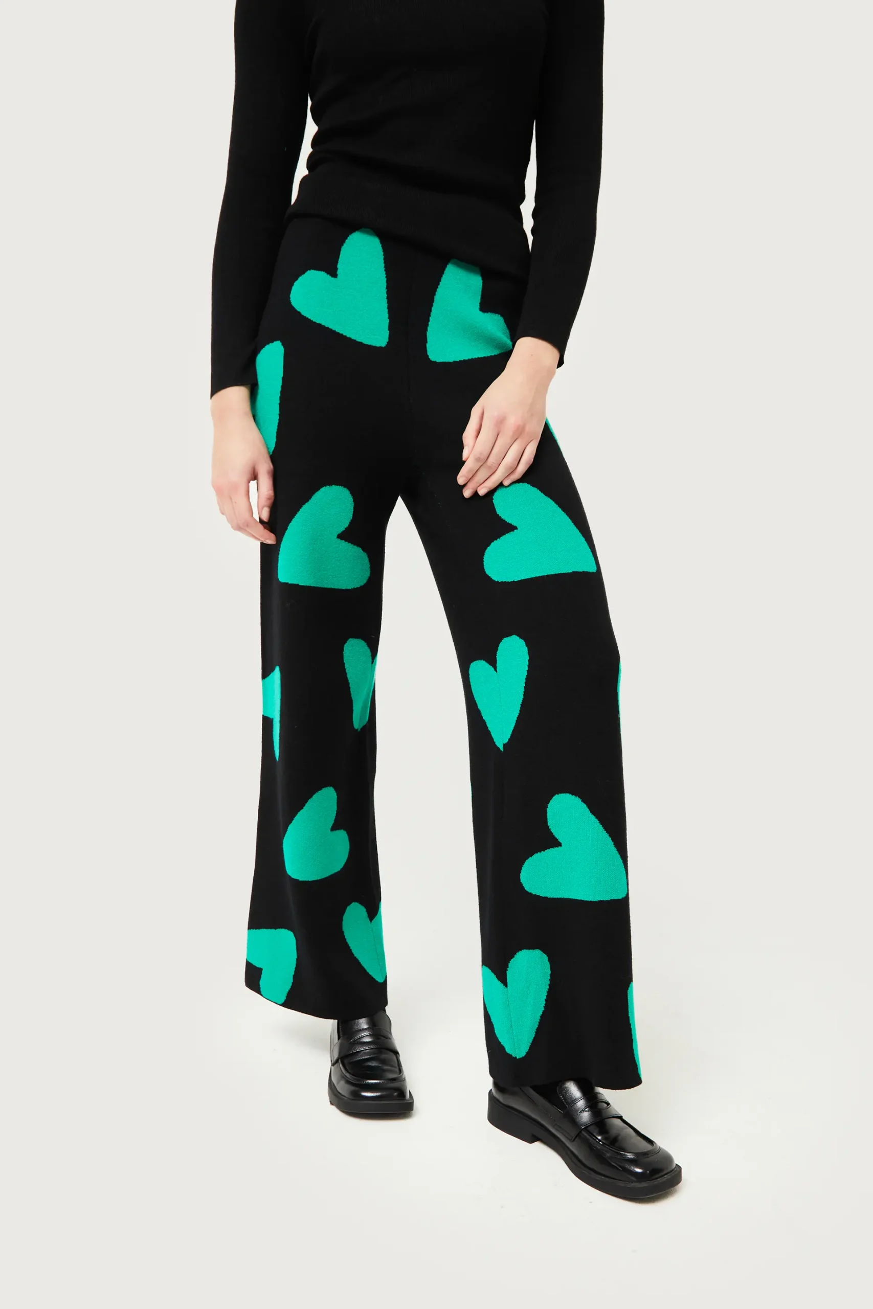 Pantalón largo de punto jacquard de color negro con estampado de corazones verdes. Con cintura elástica de tiro alto y pernera recta. La modelo mide 175 cm y lleva la talla S.