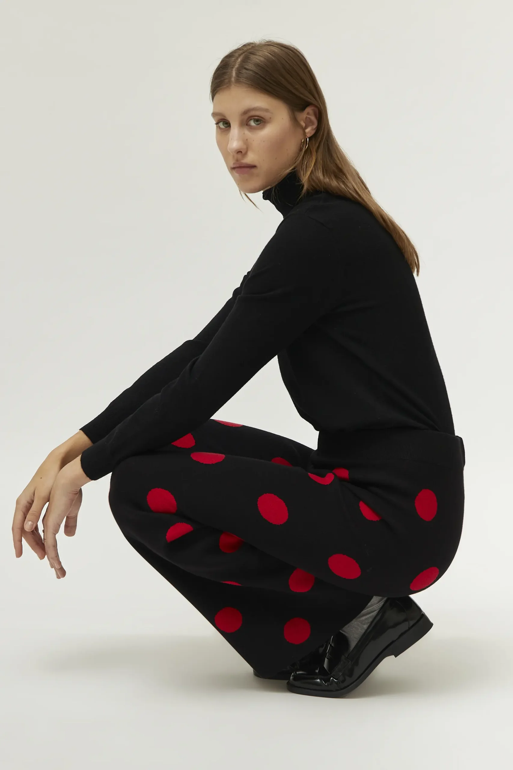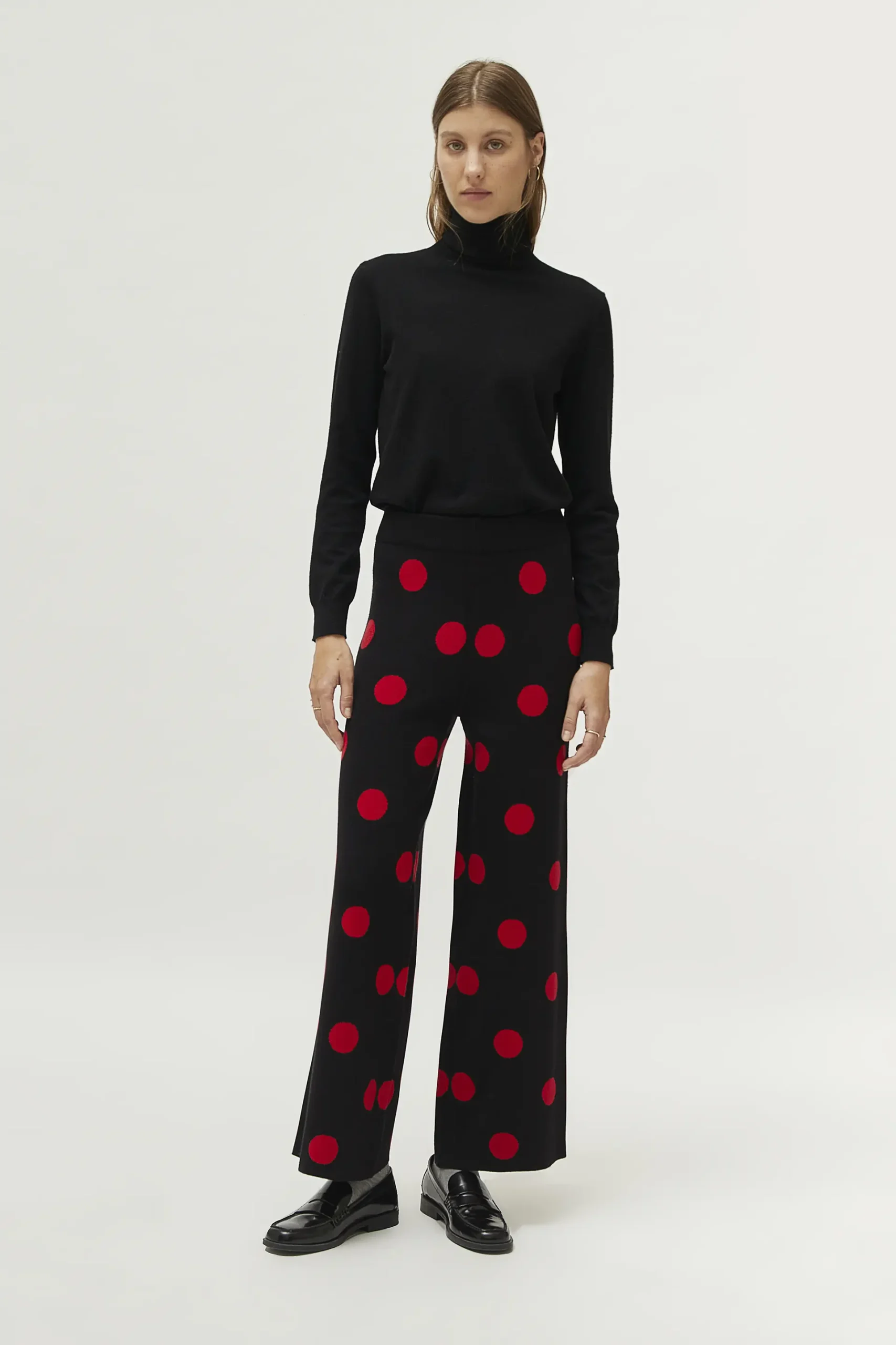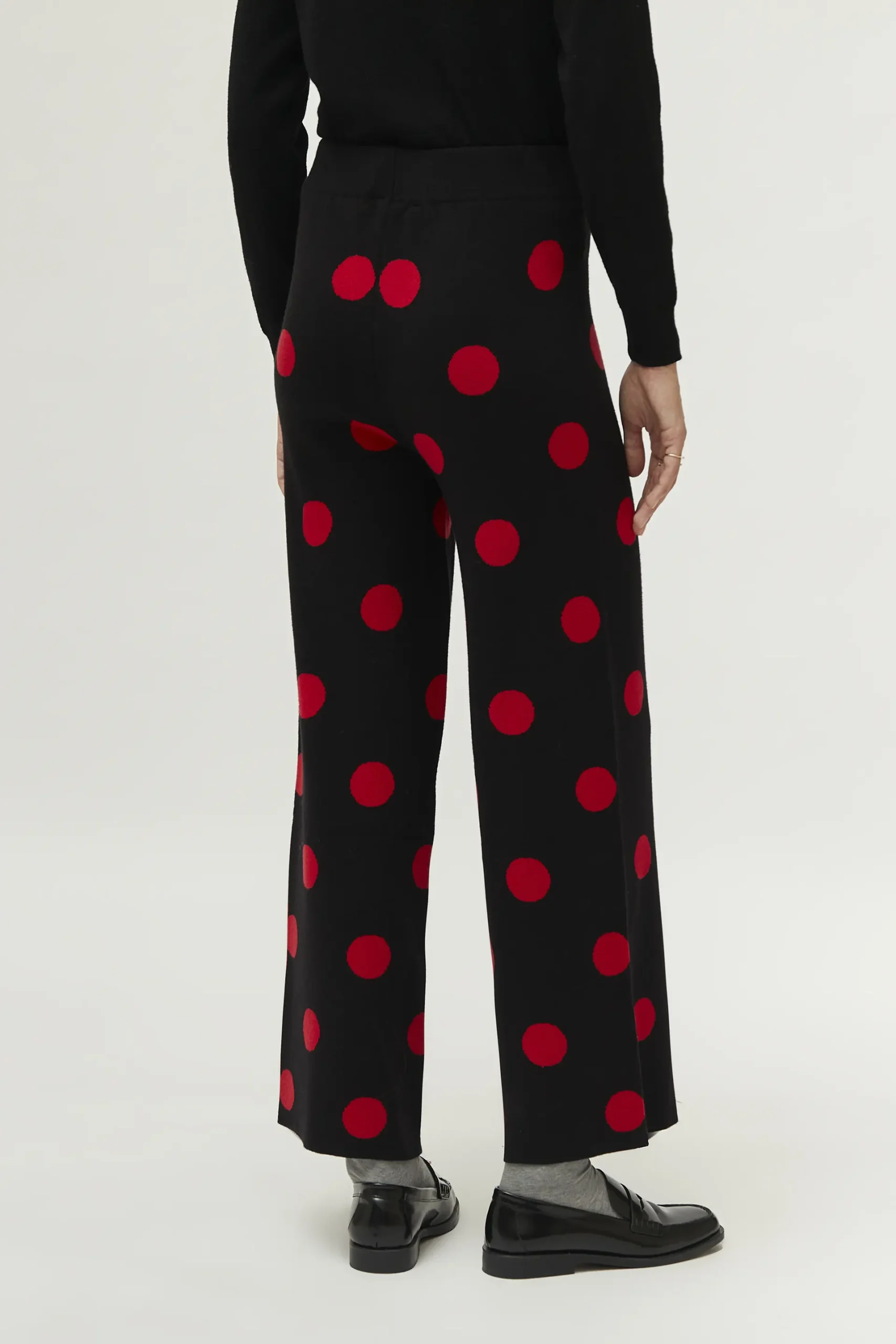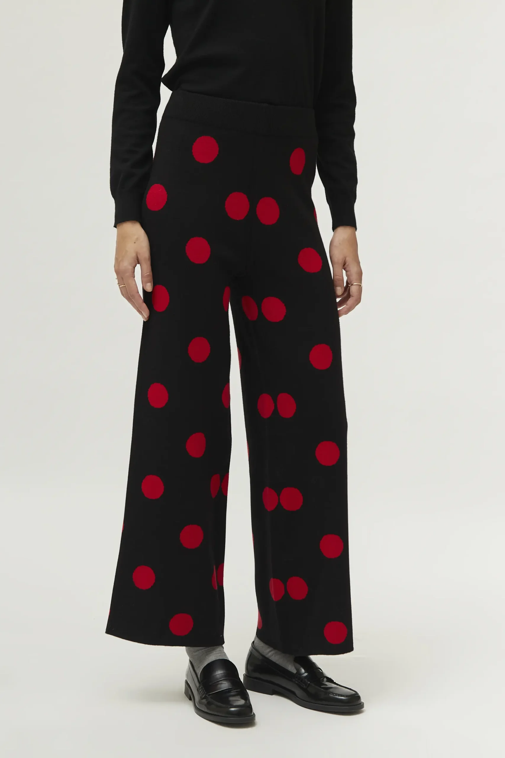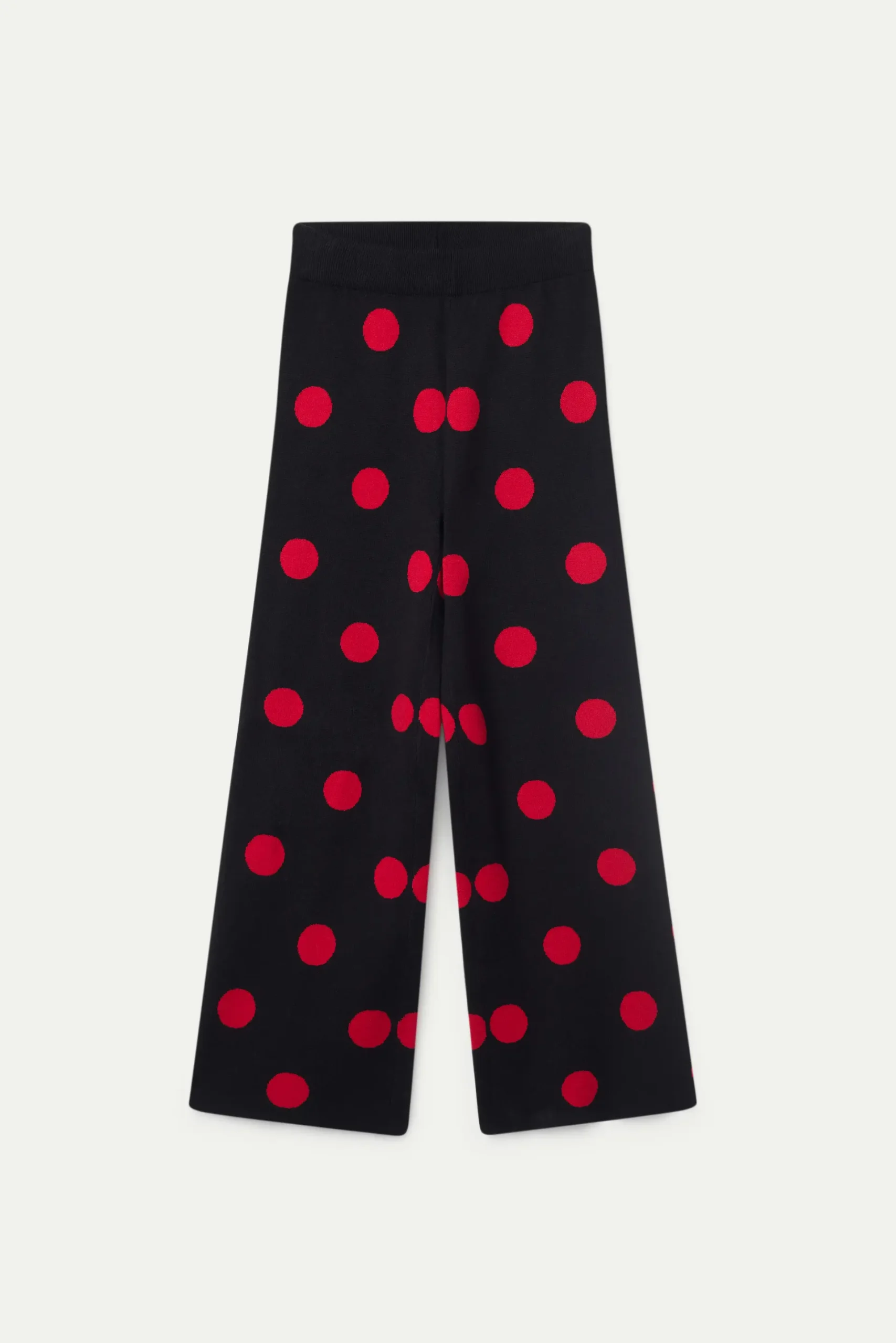 Pantalón de punto jacquard de color negro con estampado de lunares rojos. Con cintura elástica de tiro alto y pernera ancha. La modelo mide 177 cm y lleva la talla S.