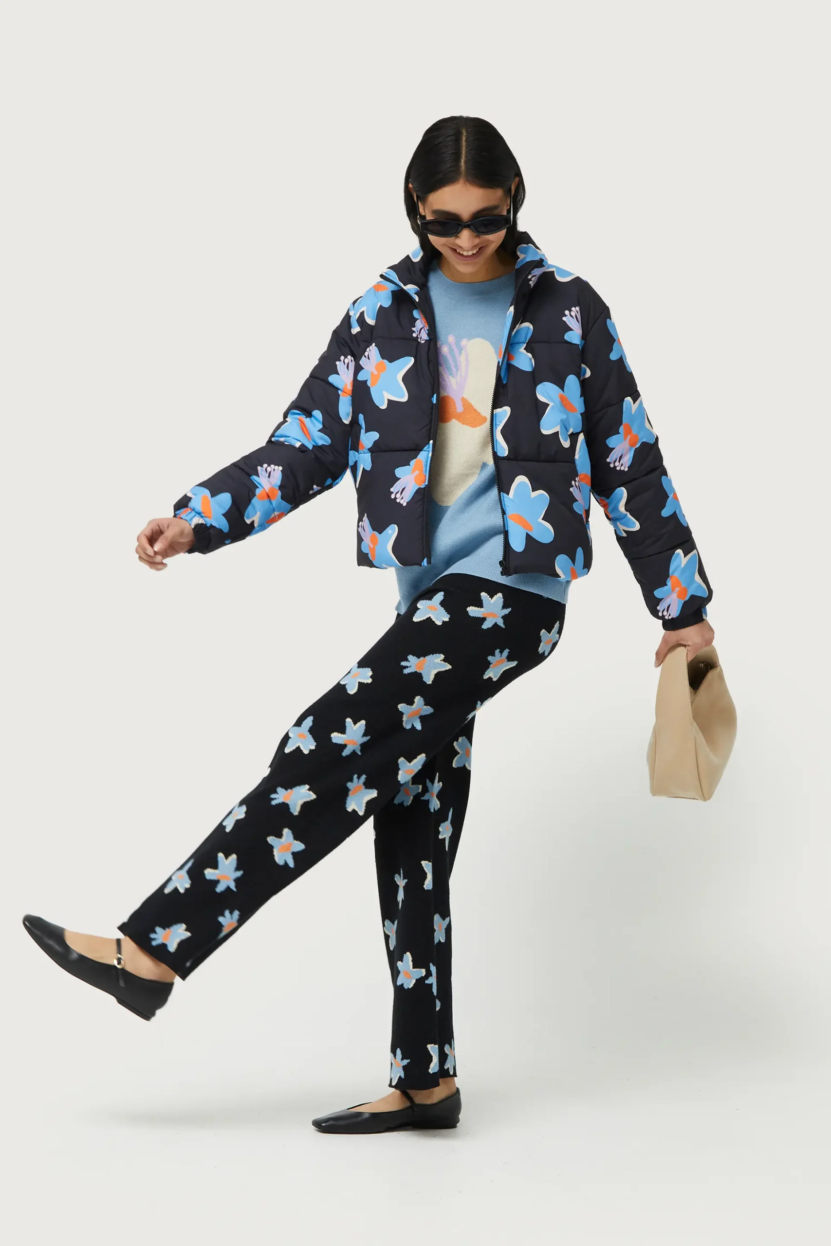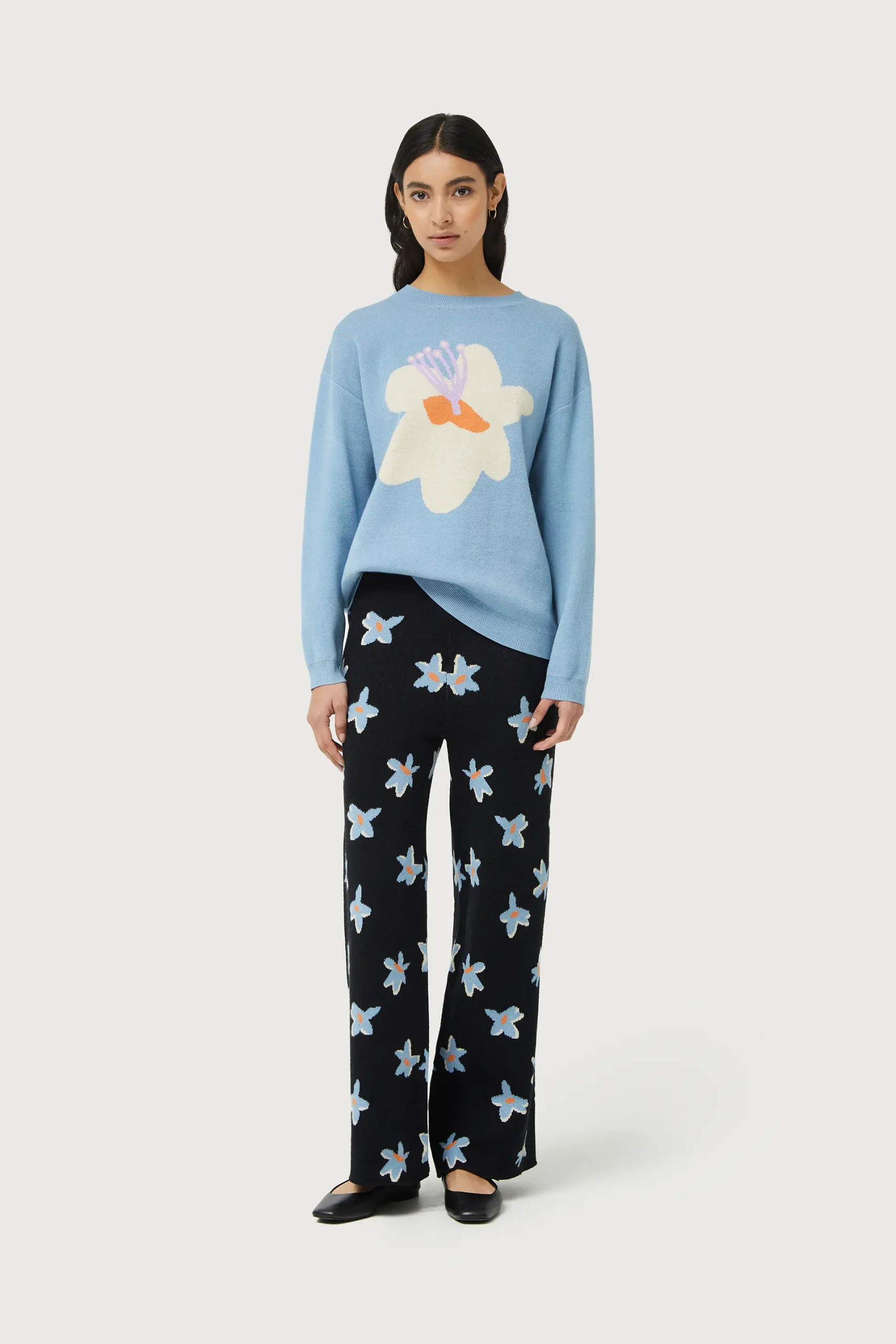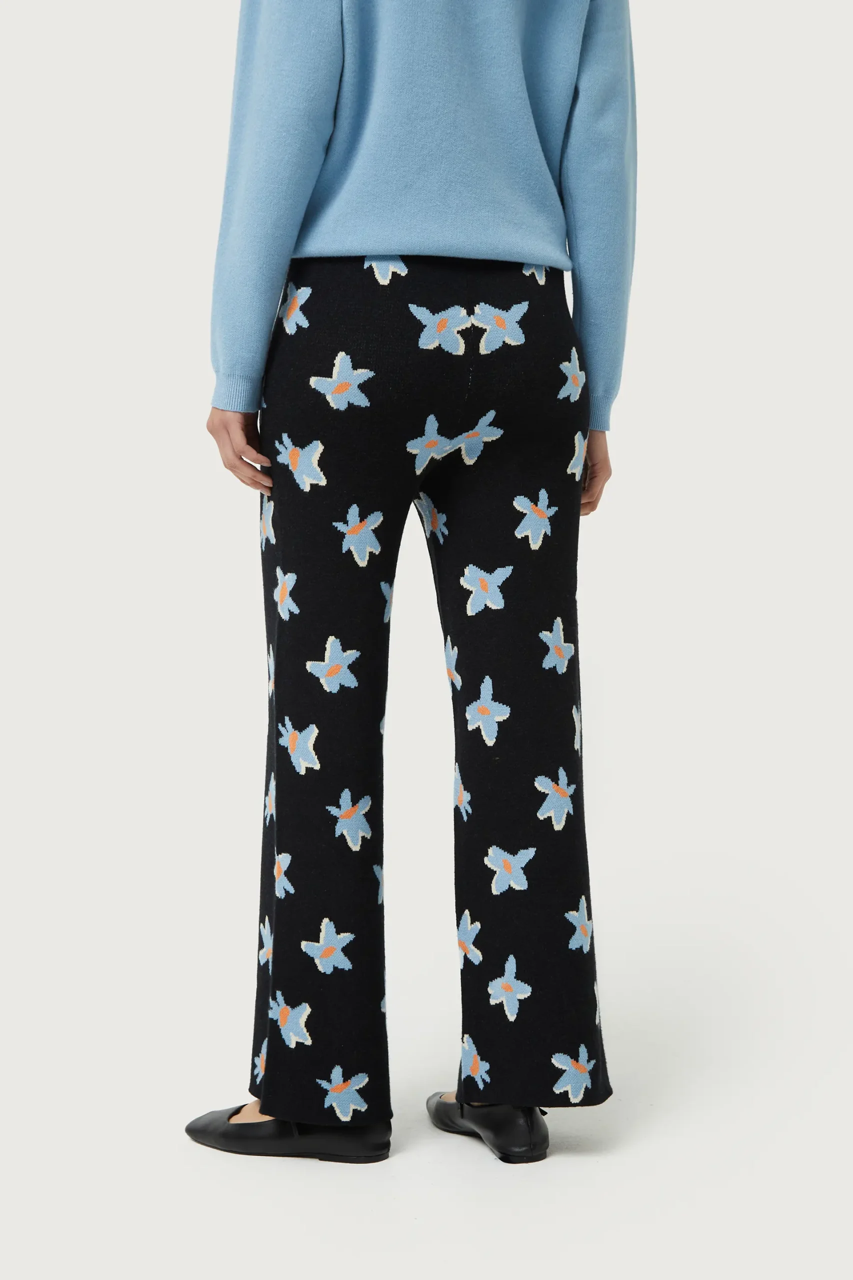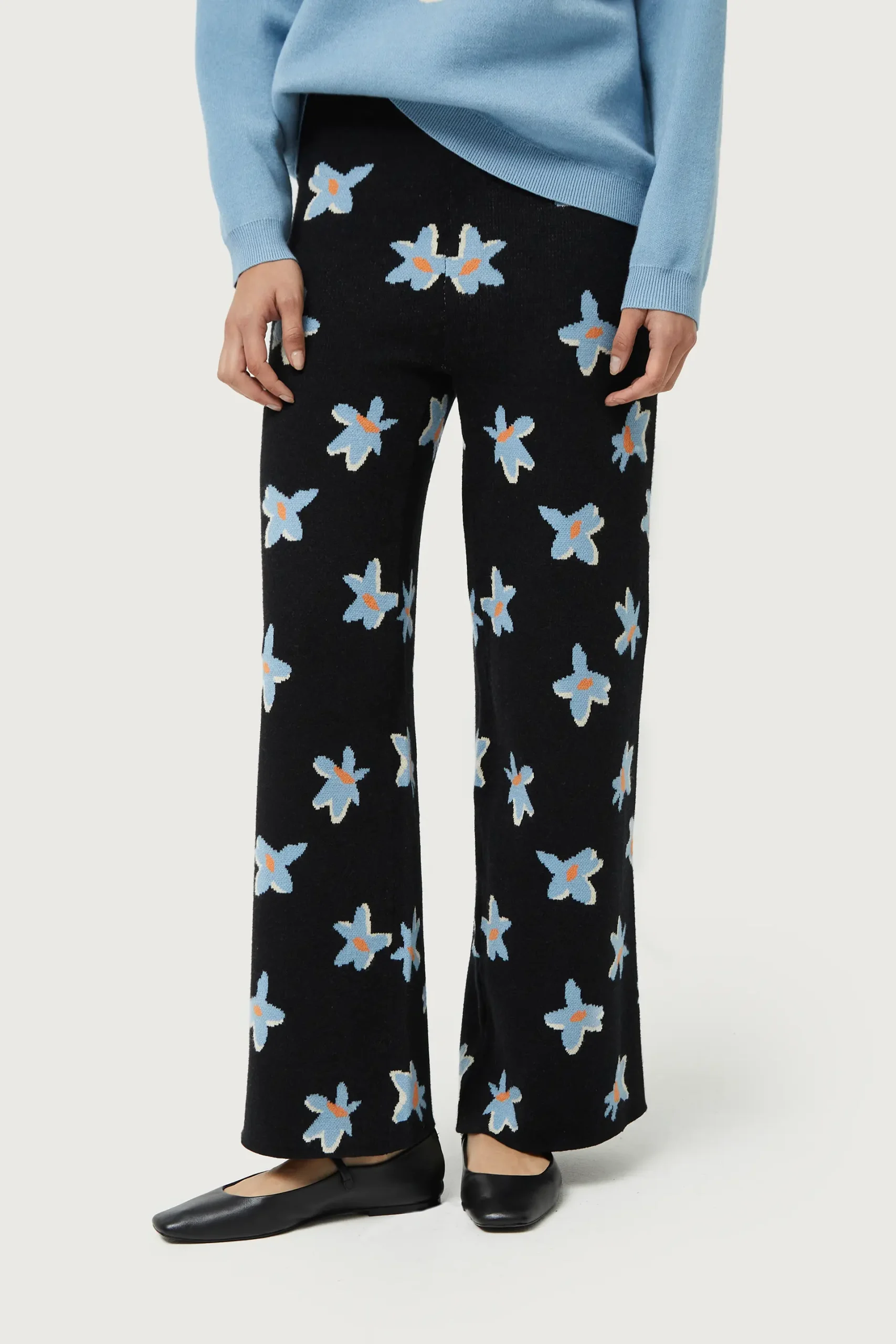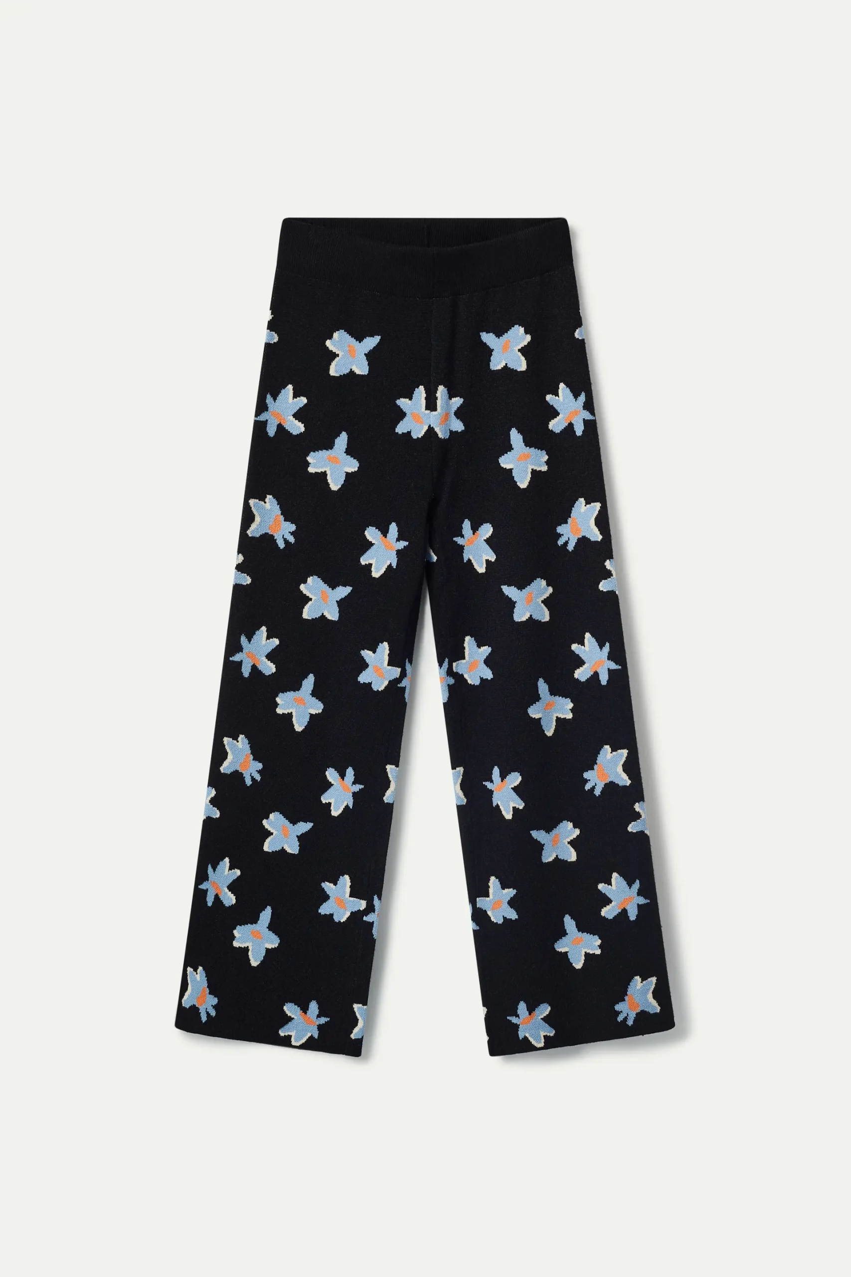 Pantalón largo de punto jacquard de color negro con estampado de flores azules y amarillas. Con cintura elástica de tiro alto y pernera recta. La modelo mide 176 cm y lleva la talla S.