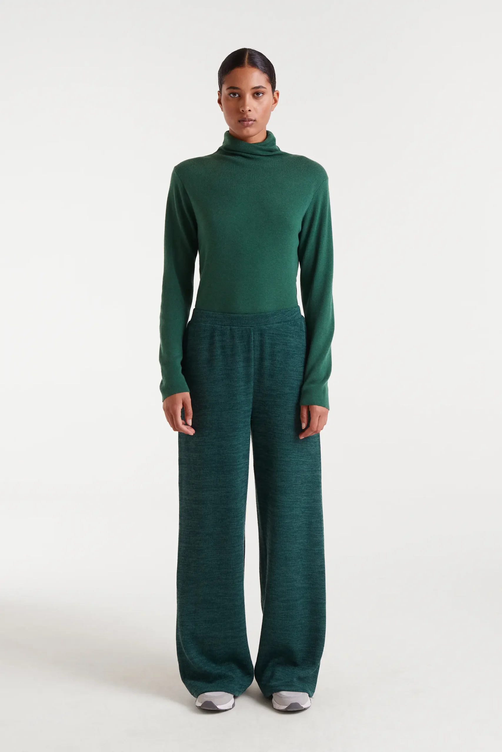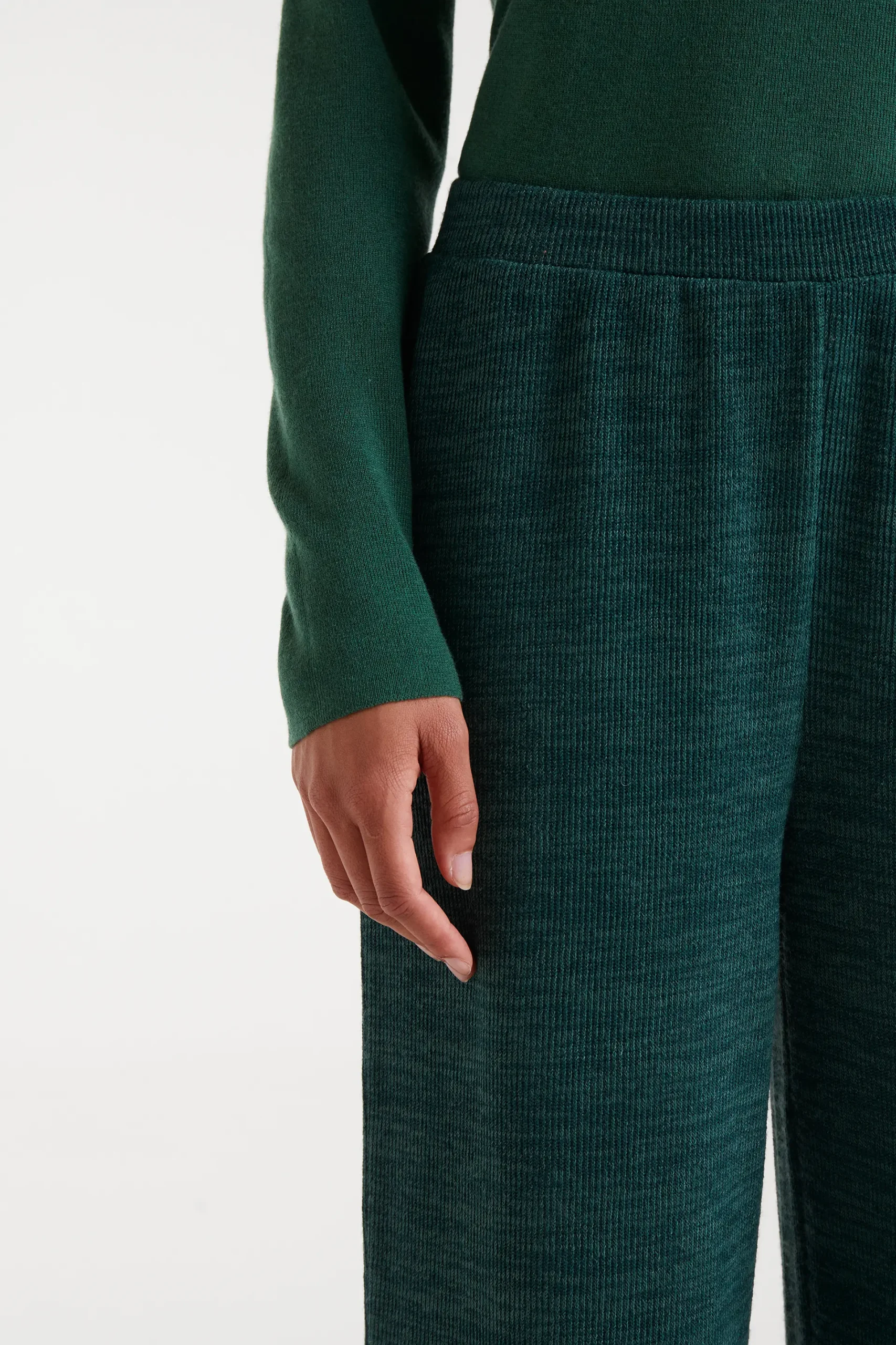 Pantalón con tejido punto canalé de color verde. Cintura con goma elástica de tiro alto y pernera de corte recto. La modelo mide 175 cm y lleva la talla S.