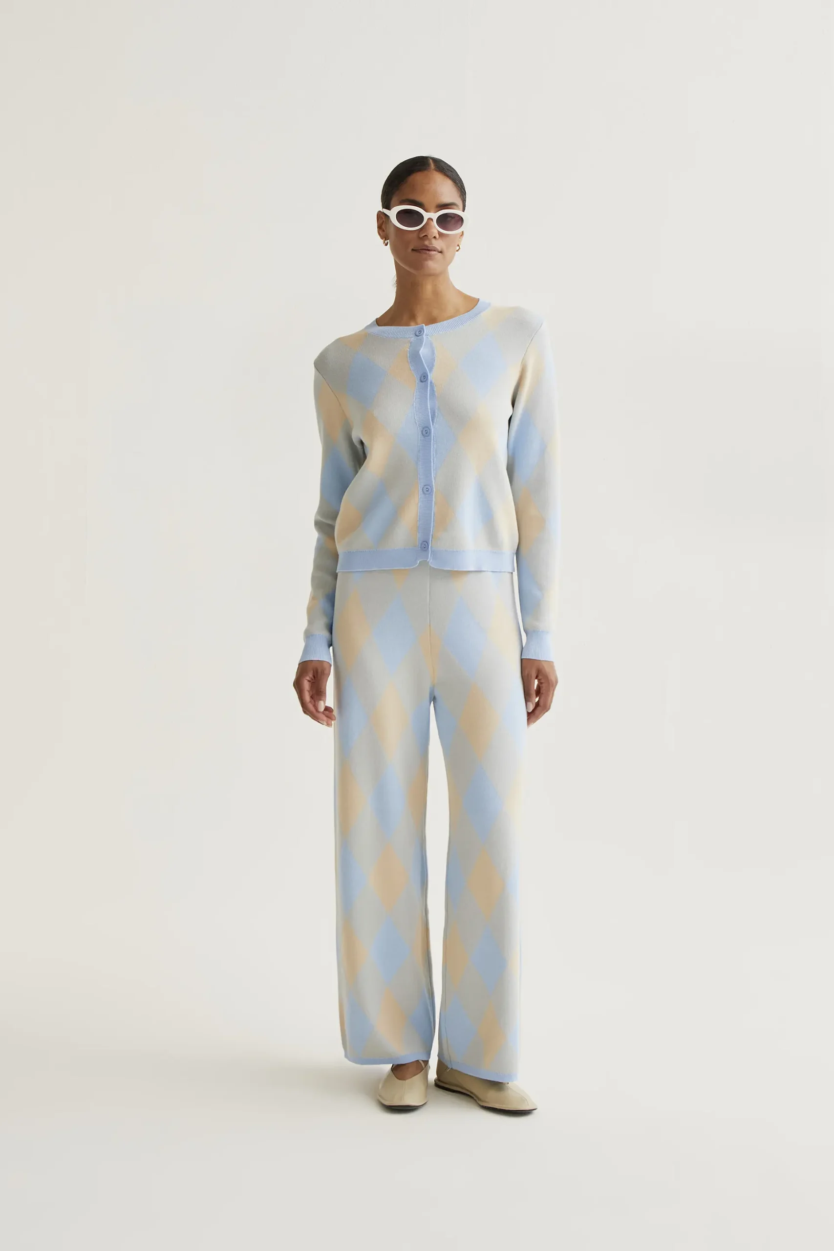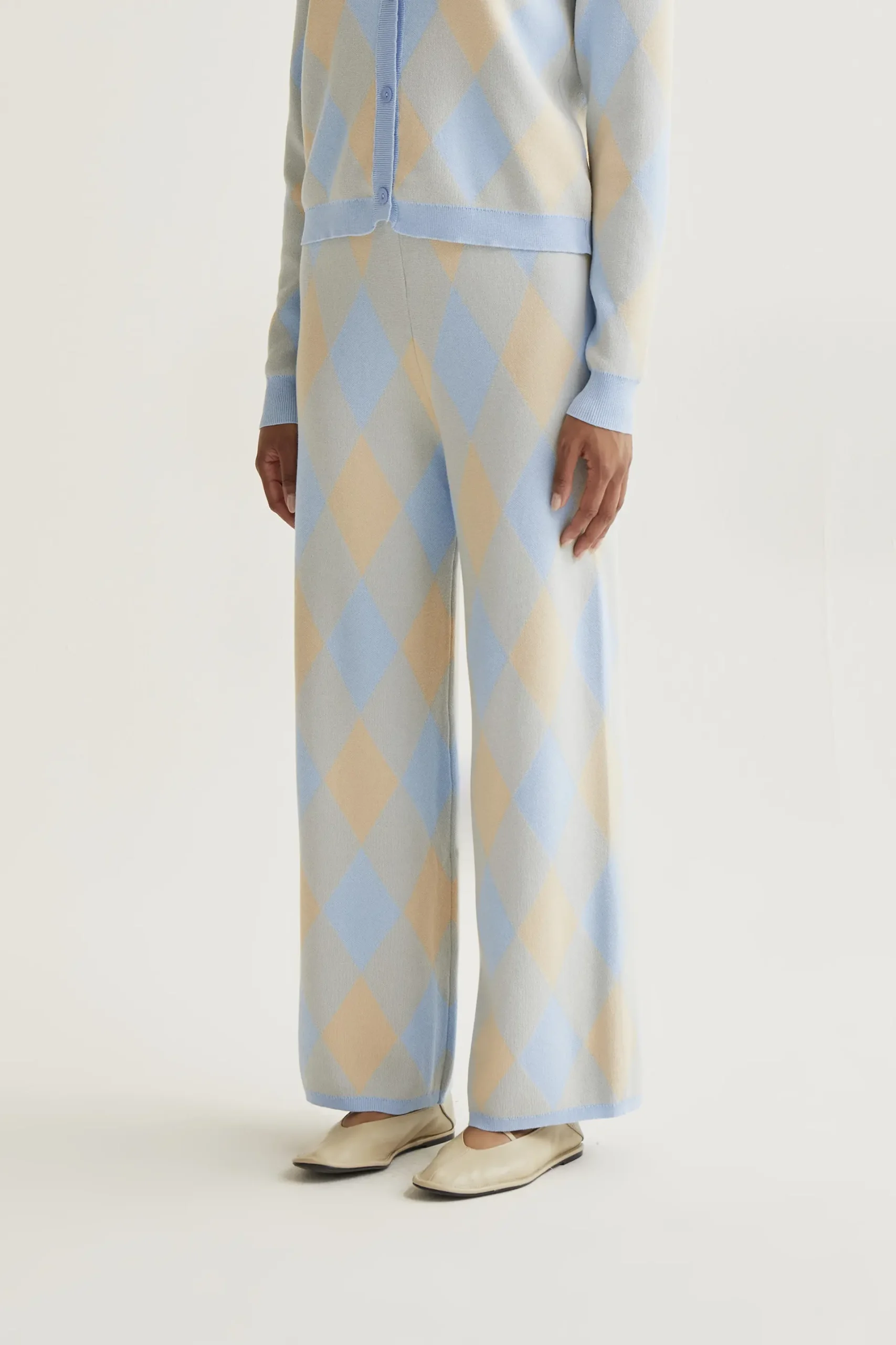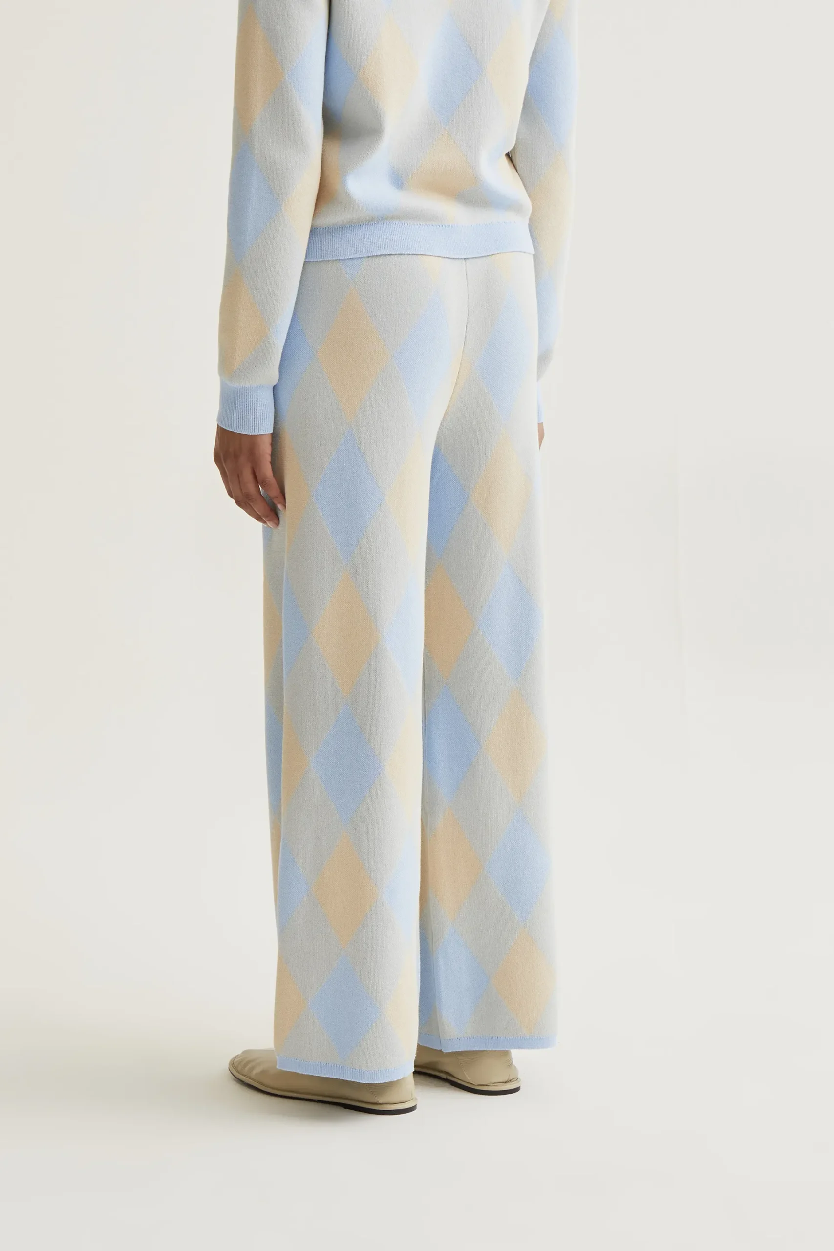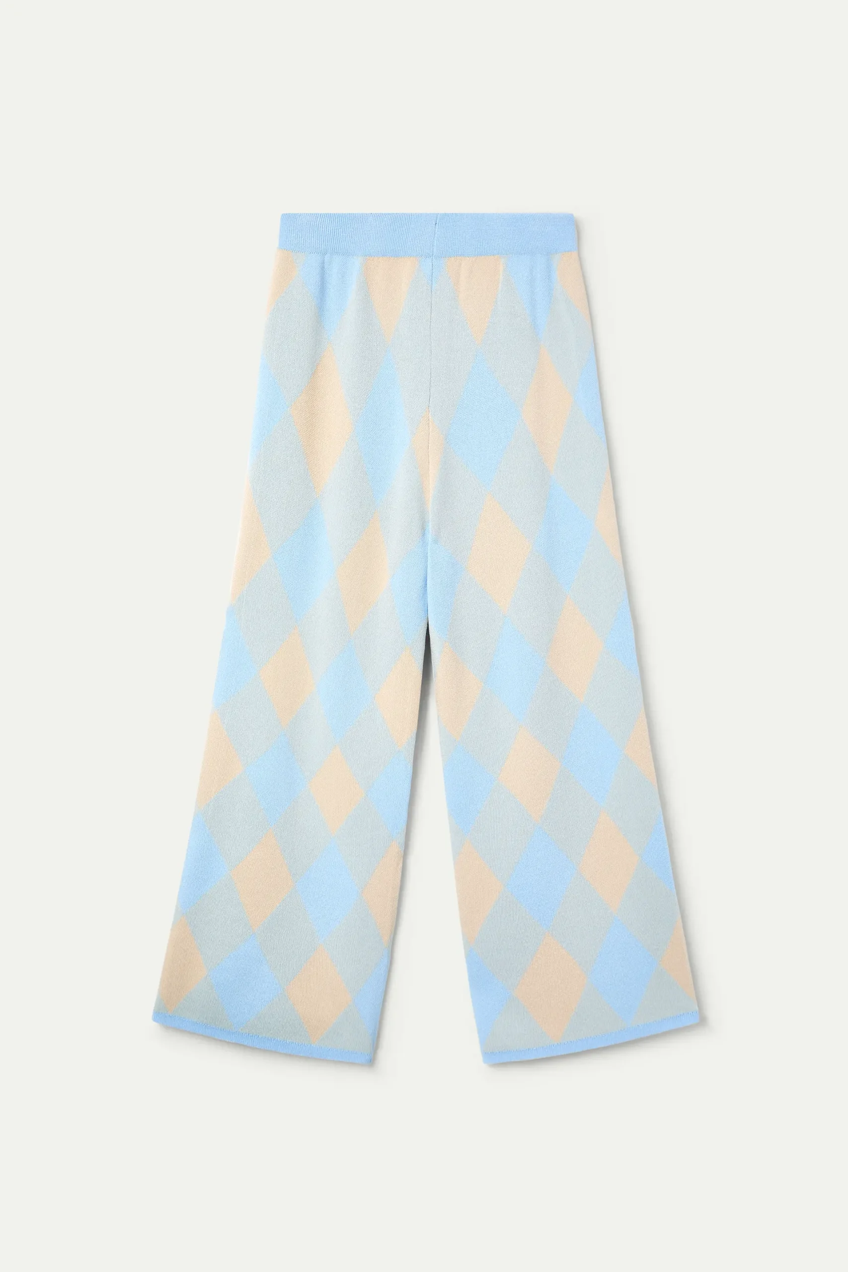 Pantalón con tejido punto de jacquard con estampado rombos color azul Cintura elástica alta de tiro fijo y pernera recta. Detalles acabados en rib.La modelo mide 173 cm y lleva la talla S.