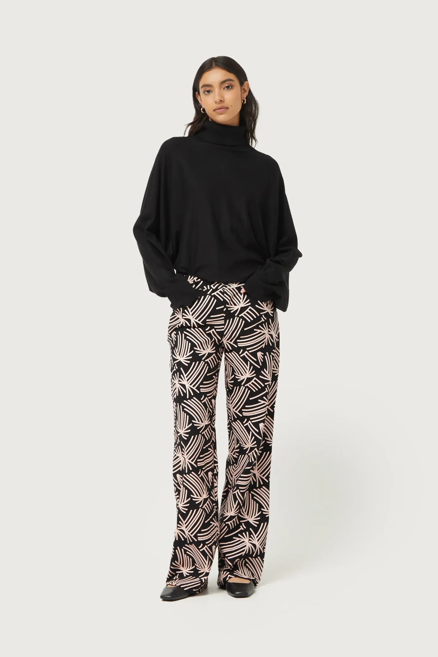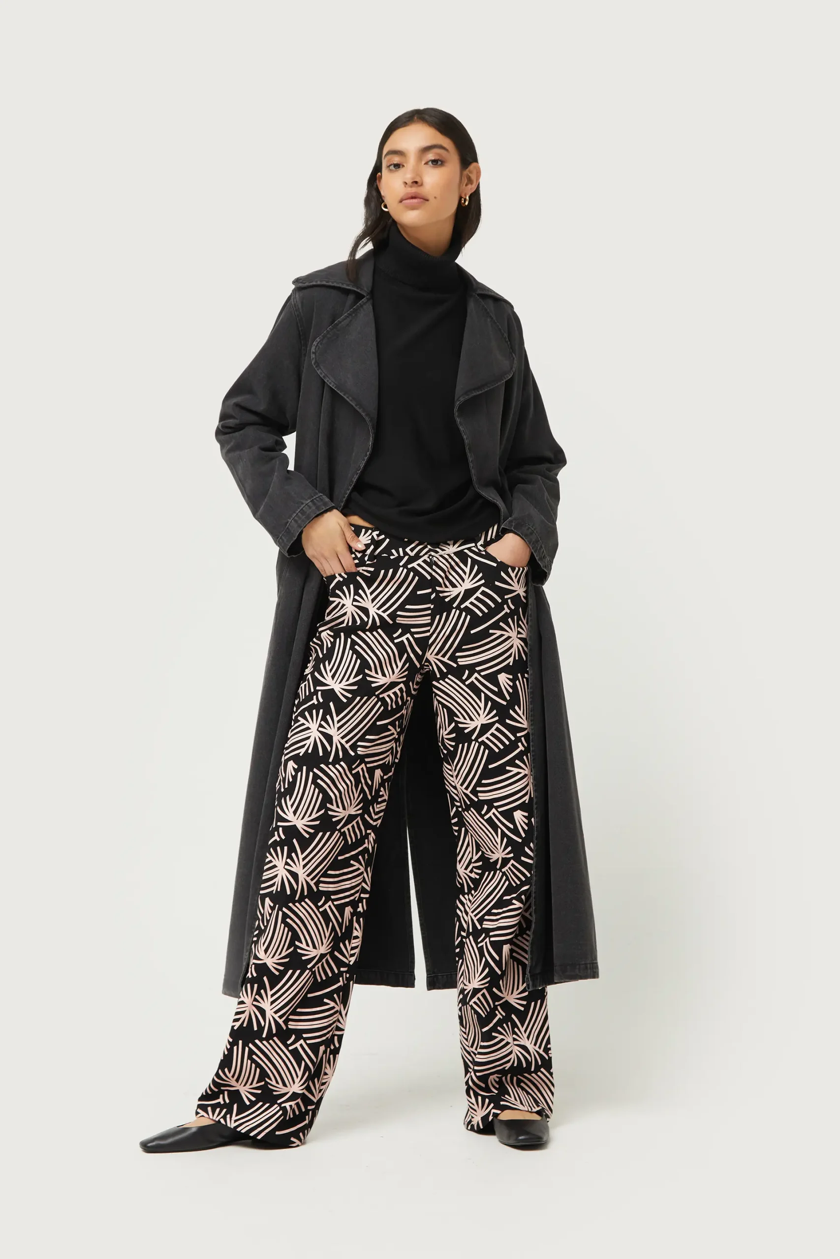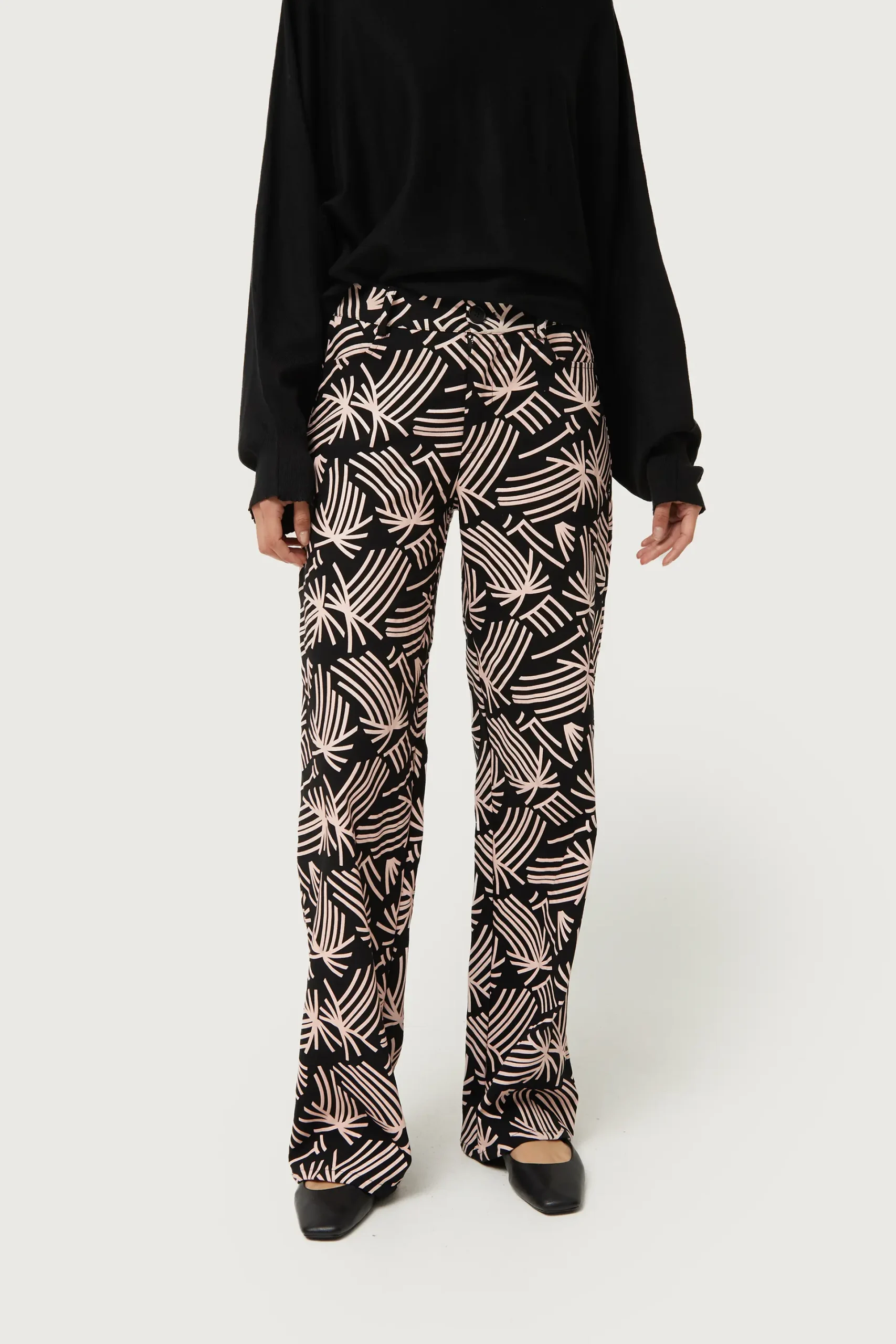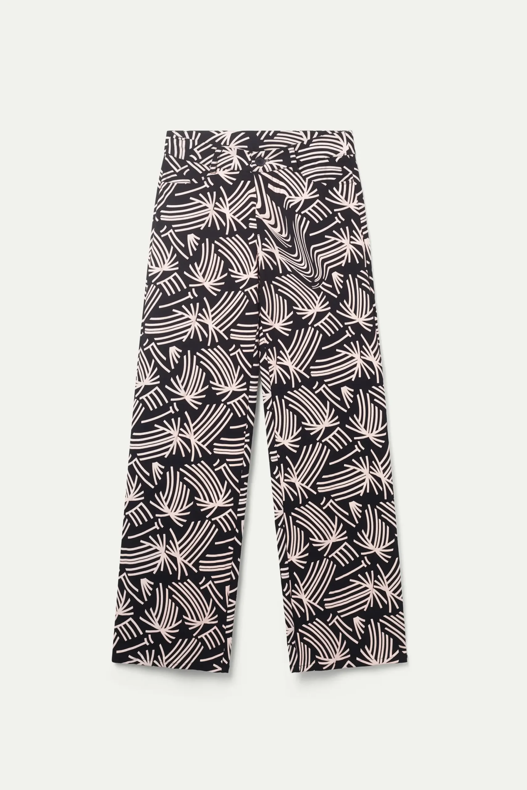 Pantalón largo de twill elástico con estampado abstracto de color negro y rosa. Con cintura de tiro medio y pernera recta. Cierre con botón y cremallera. Detalle de bolsillos frontales y trabillas para el cinturón. La modelo mide 176 cm y lleva la talla S.