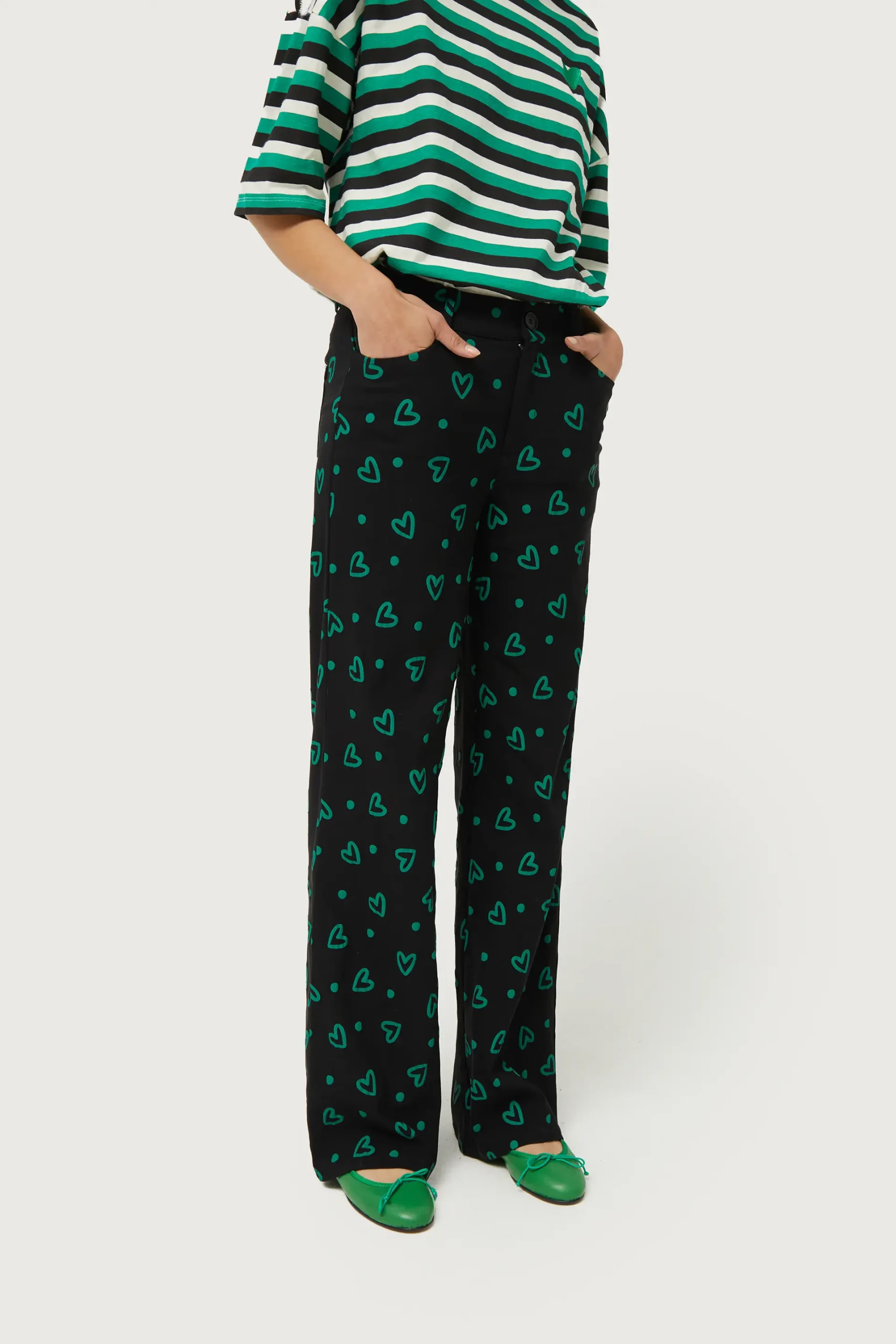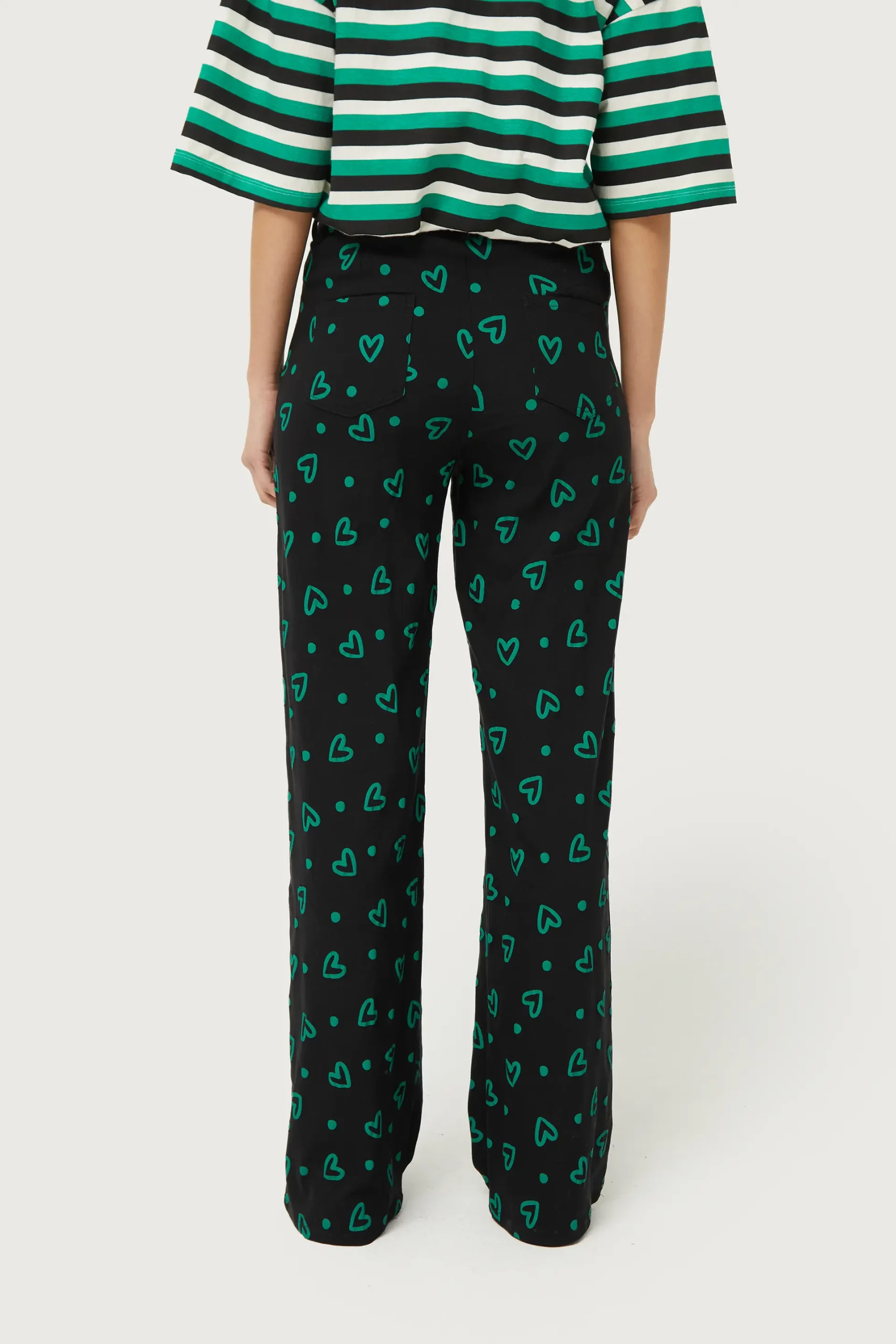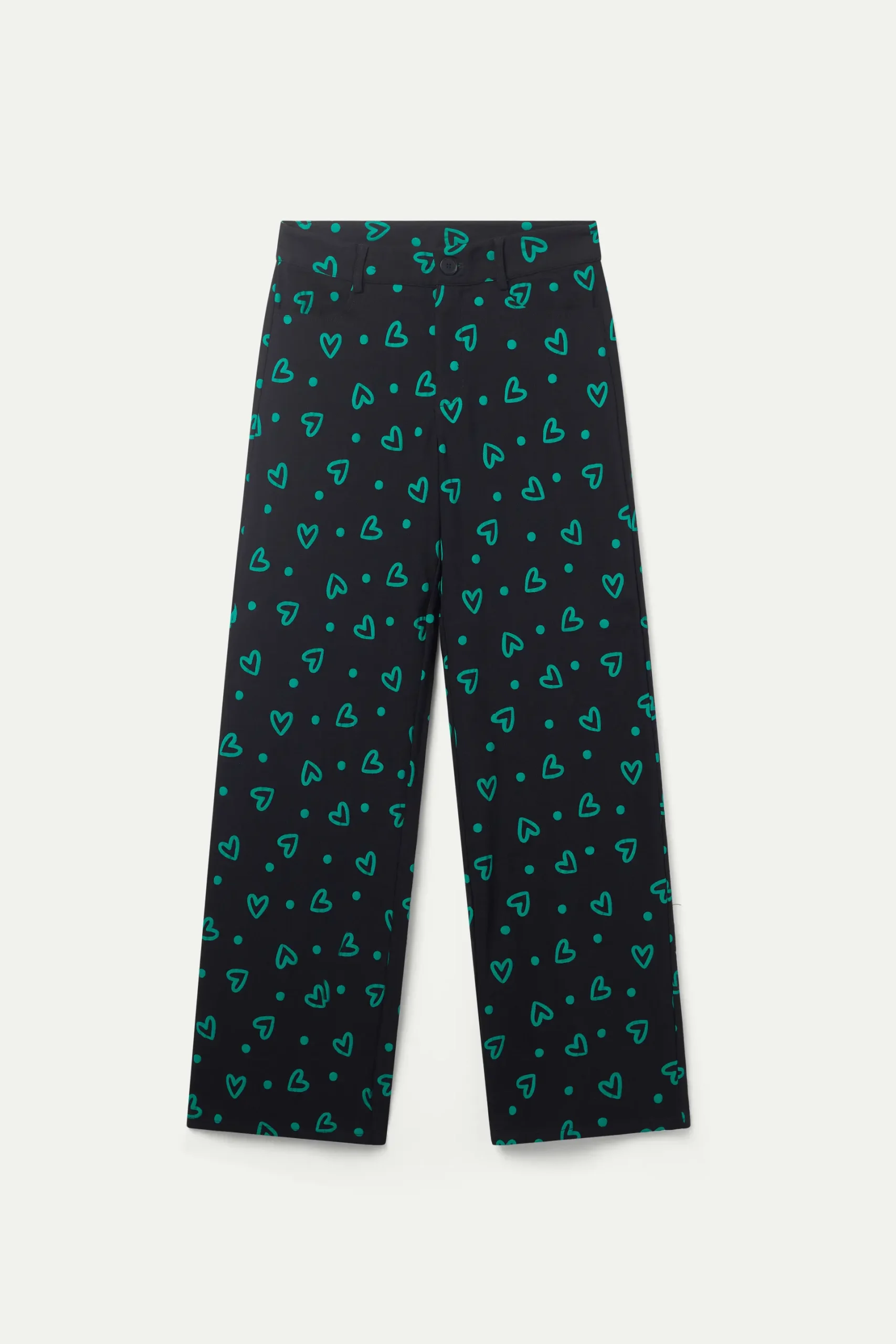 Pantalón largo en twill elástico de color negro con estampado de corazones verdes. Con cintura de tiro medio y pernera recta. Cierre con botón y cremallera. Bolsillos laterales y traseros y trabillas para el cinturón. La modelo mide 176 cm y lleva la talla S.