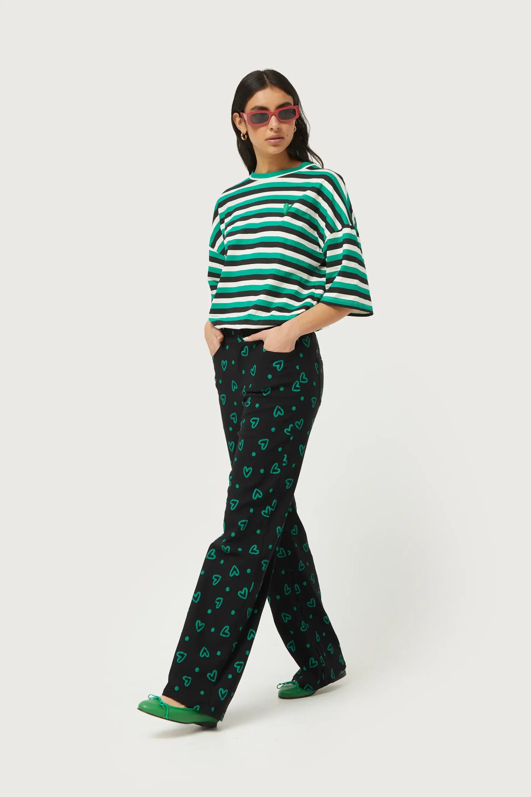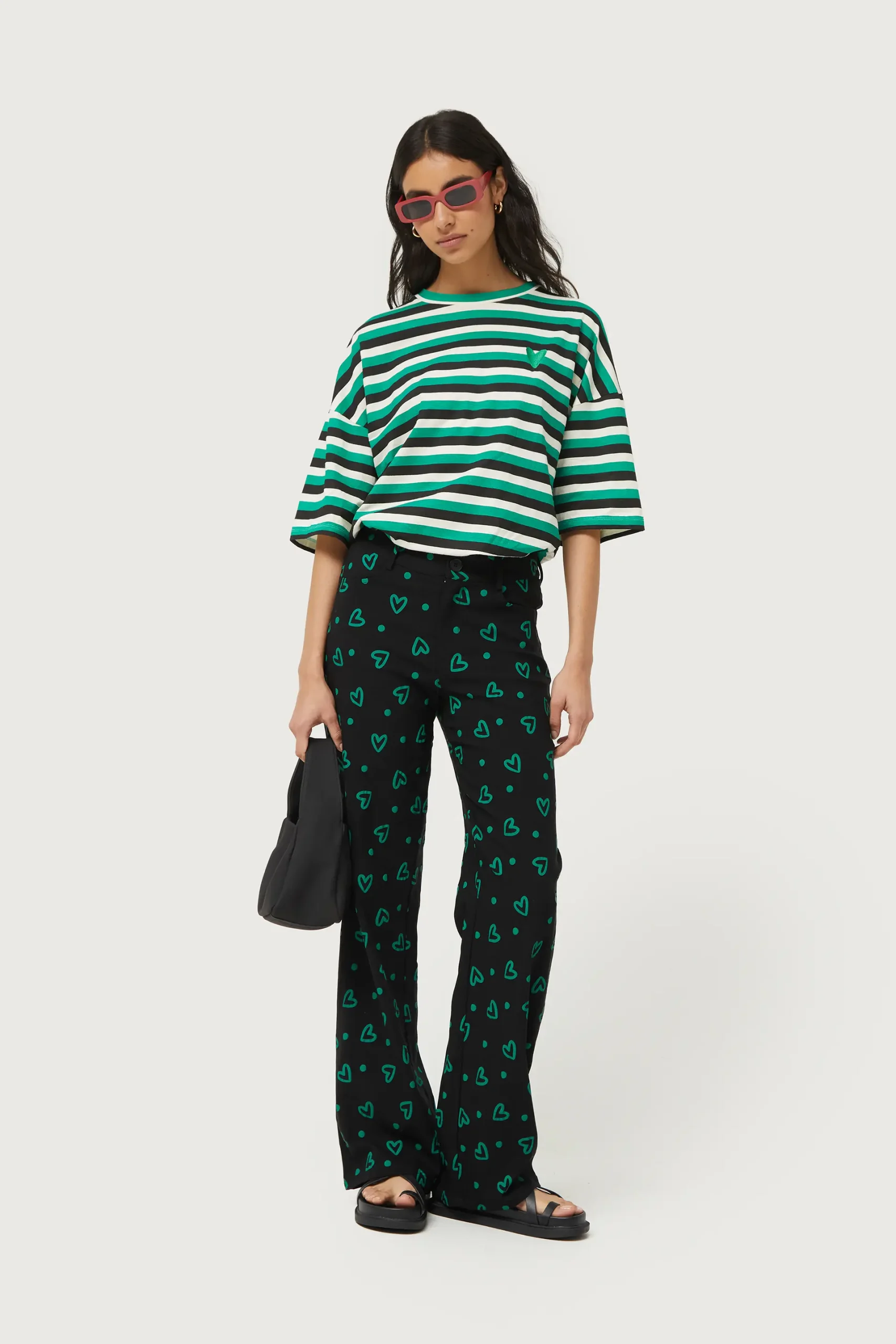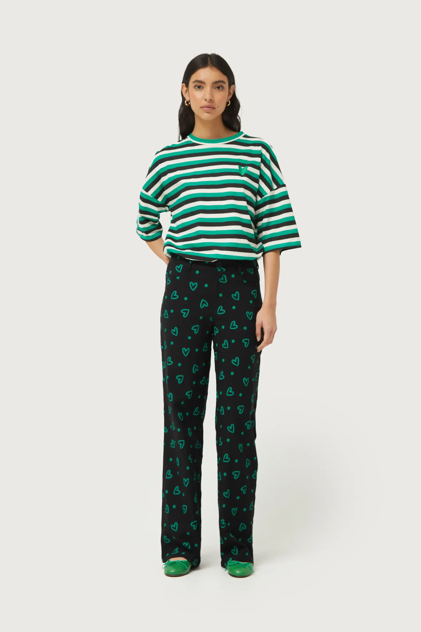 Pantalón largo en twill elástico de color negro con estampado de corazones verdes. Con cintura de tiro medio y pernera recta. Cierre con botón y cremallera. Bolsillos laterales y traseros y trabillas para el cinturón. La modelo mide 176 cm y lleva la talla S.