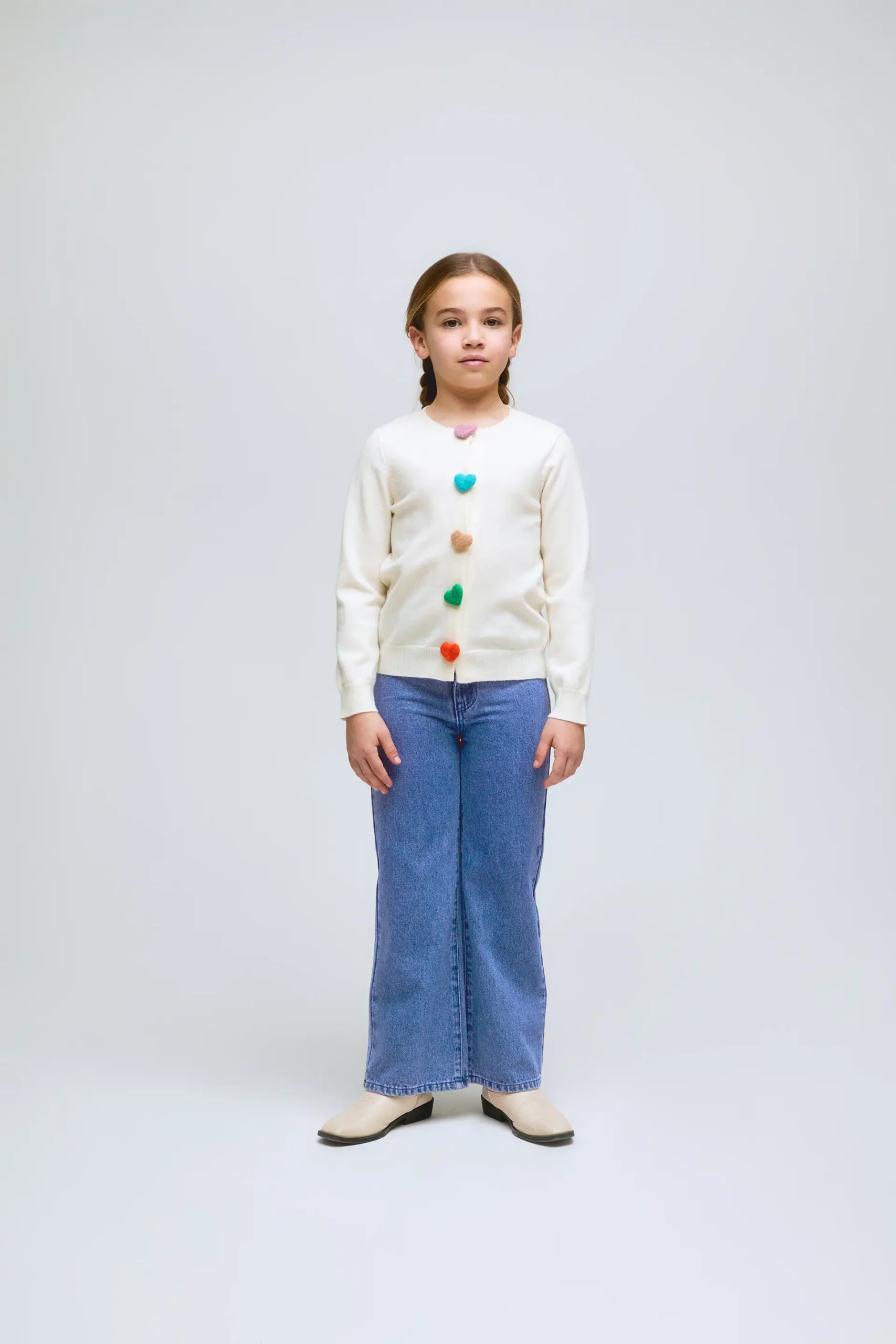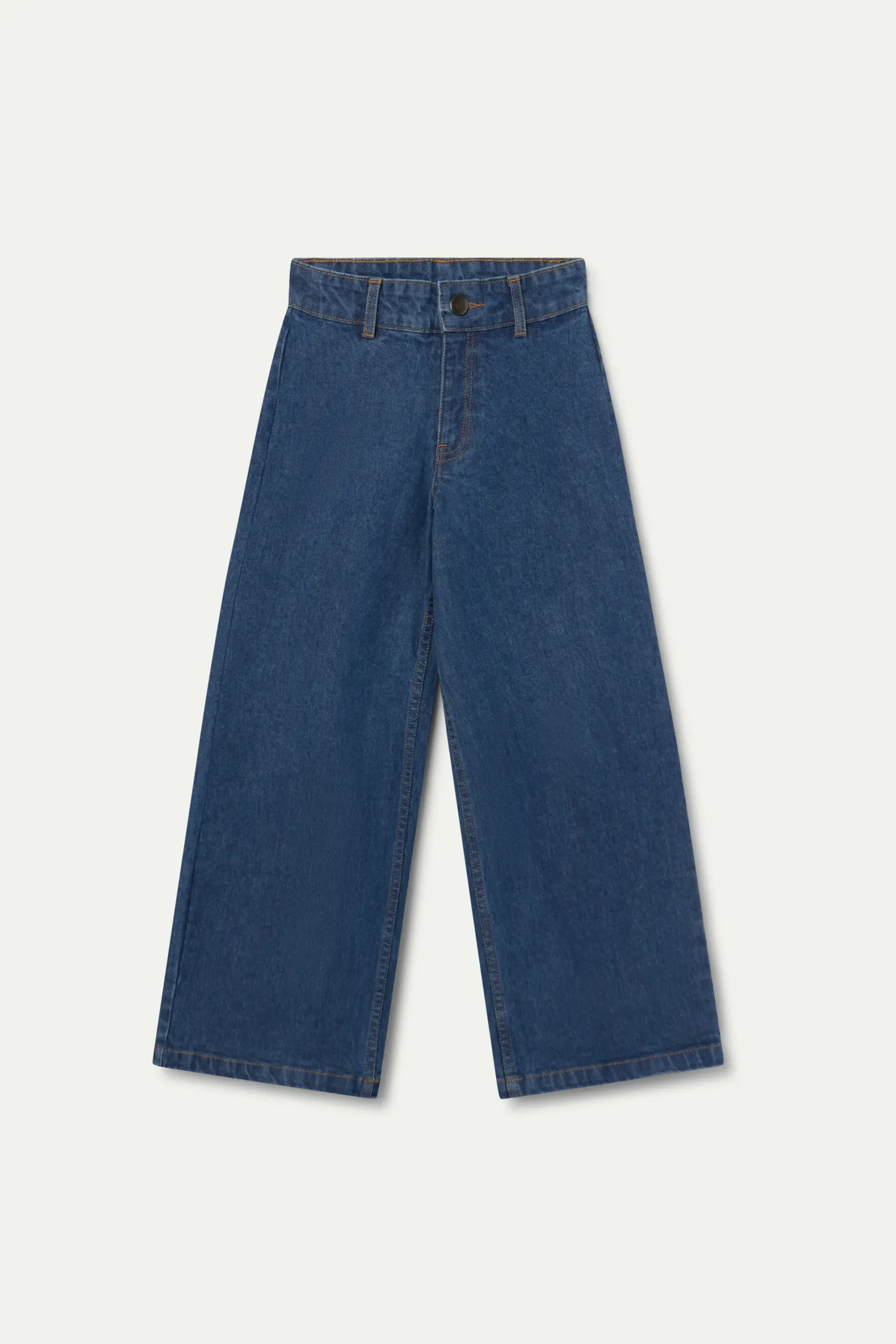 Pantalón vaquero azul para niña de pierna ancha y cintura alta. Cuenta con bolsillos funcionales, cierre con cremallera y botón metálico. Detalle gráfico de corazones verdes en los bolsillos.