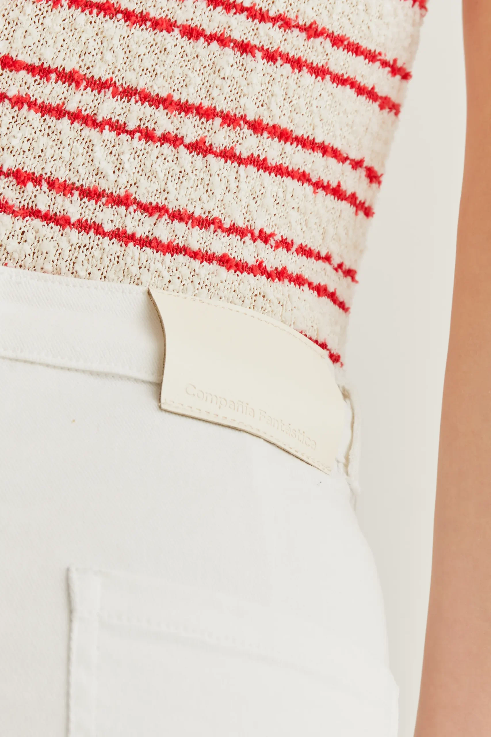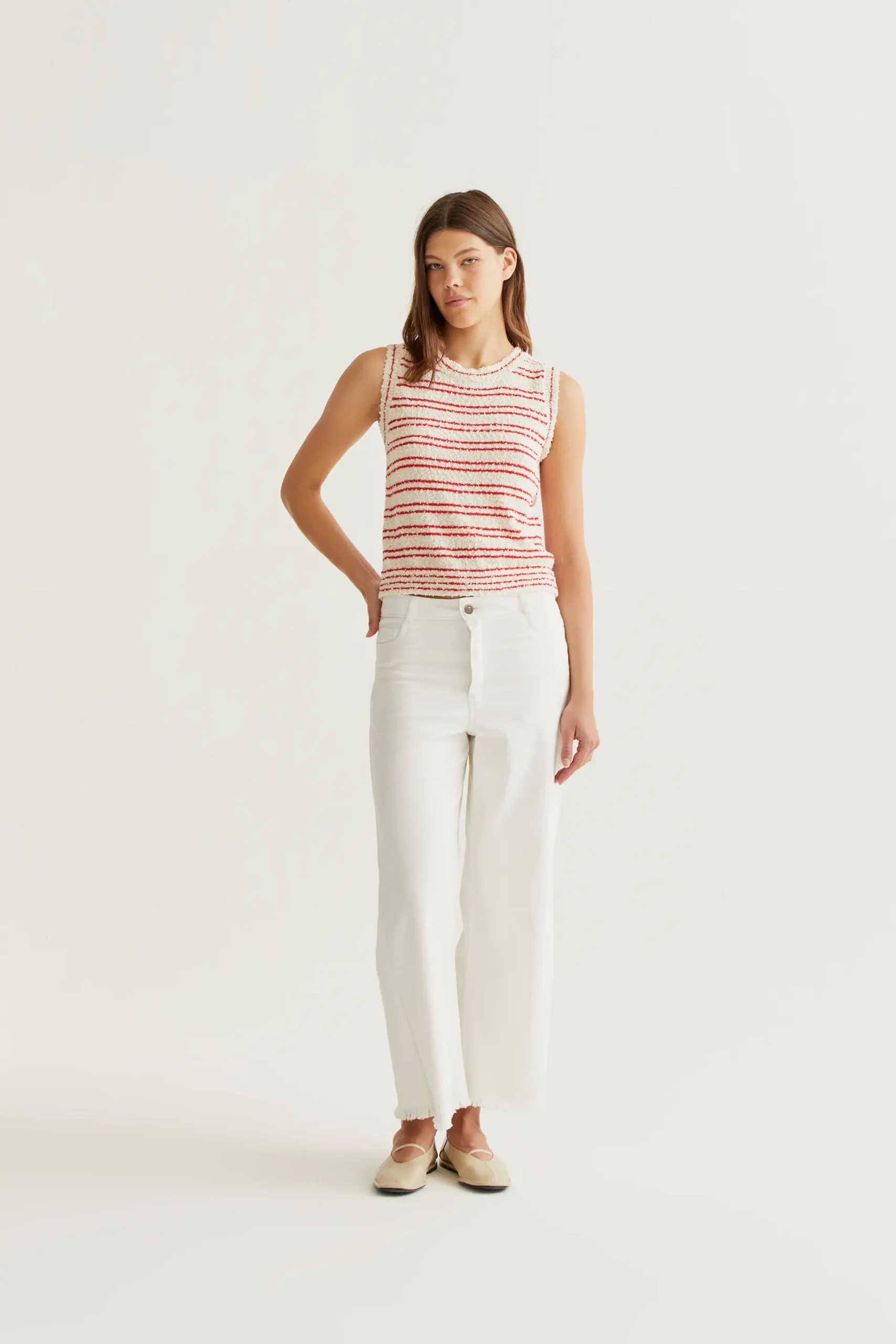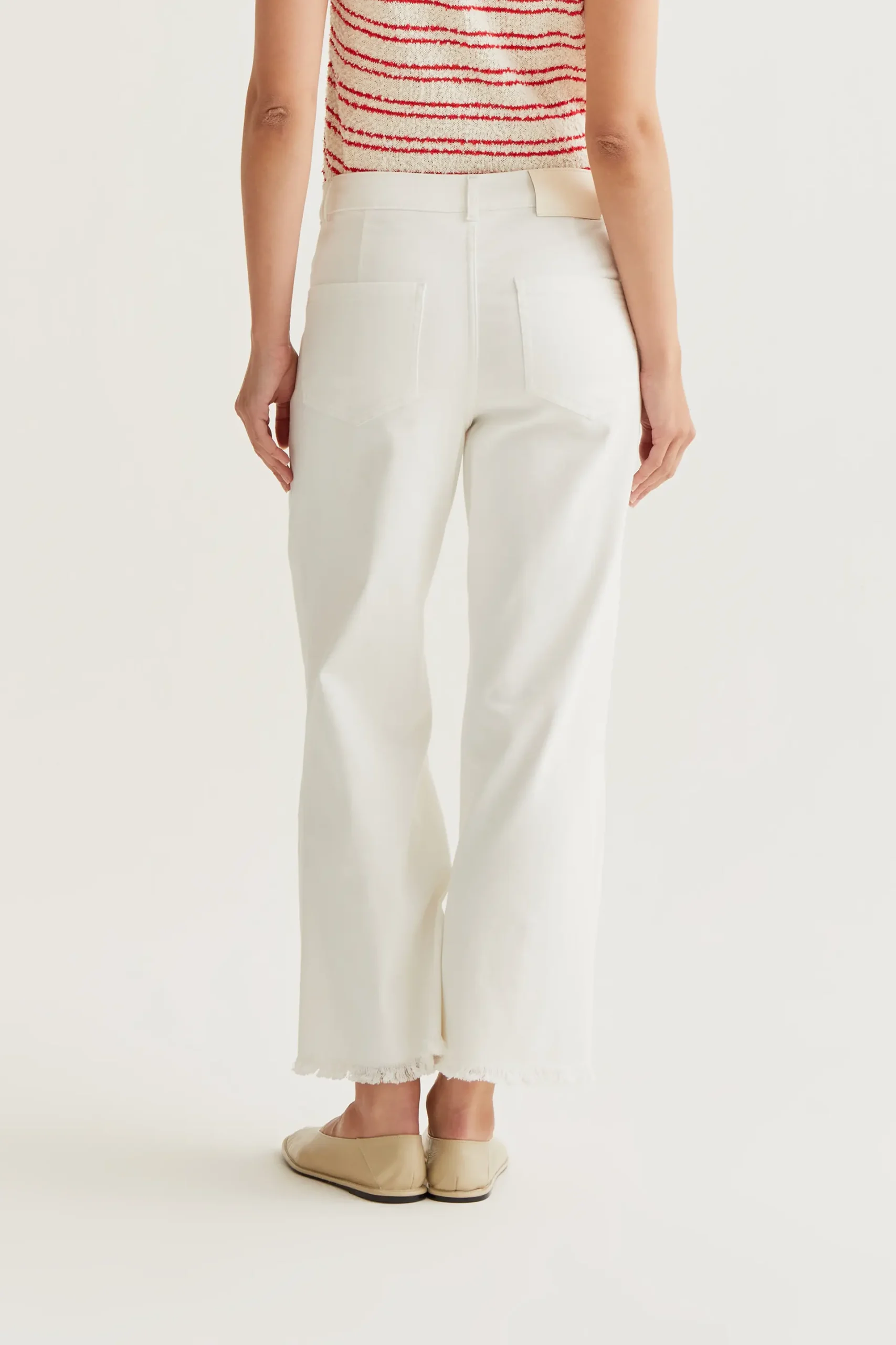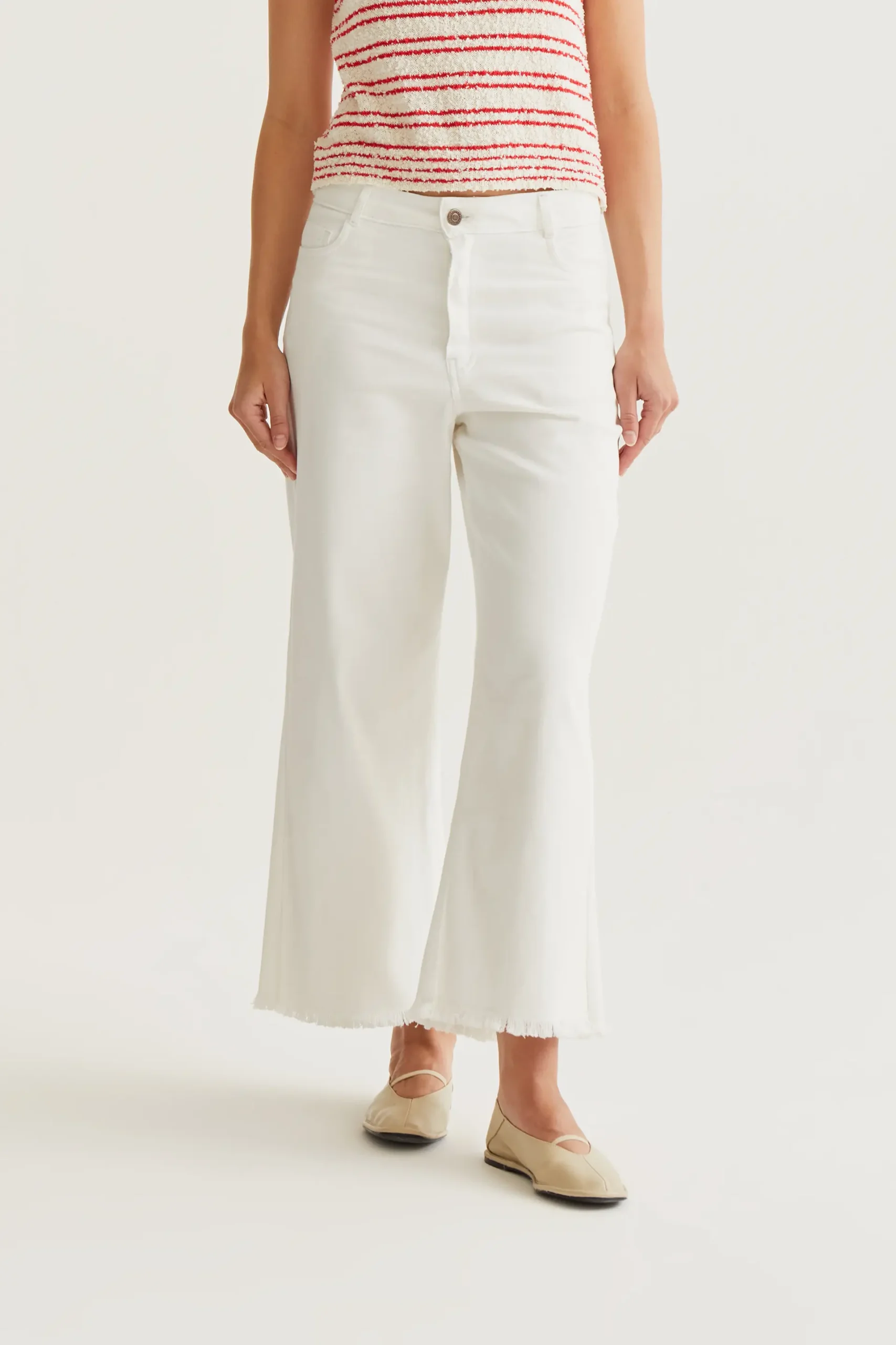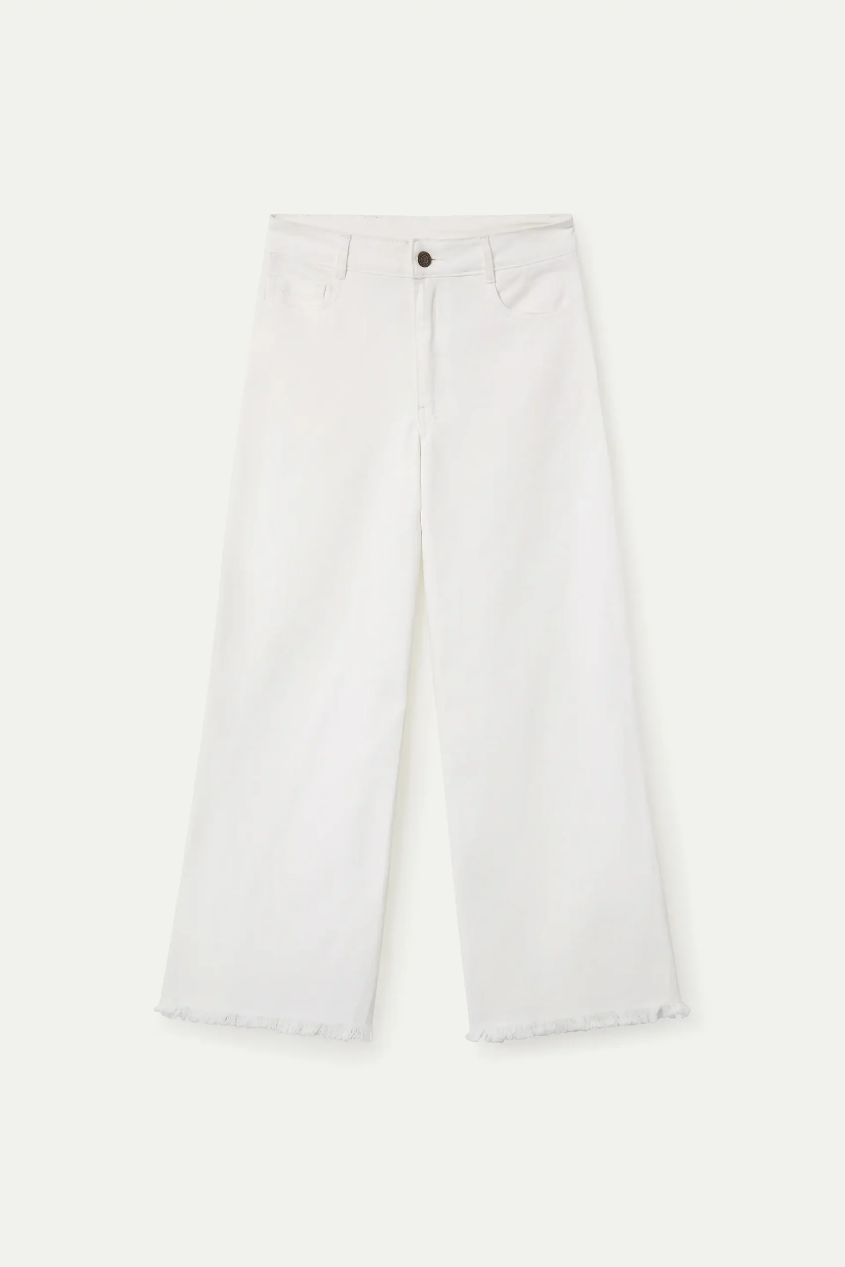 Pantalón vaquero de tejido denim de color blanco. Cintura fija de tiro alto y pernera recta con bajo desflecado. Cierre frontal con cremallera y botón. Bolsillos laterales y posteriores. La modelo mide 177 cm y lleva la talla S.