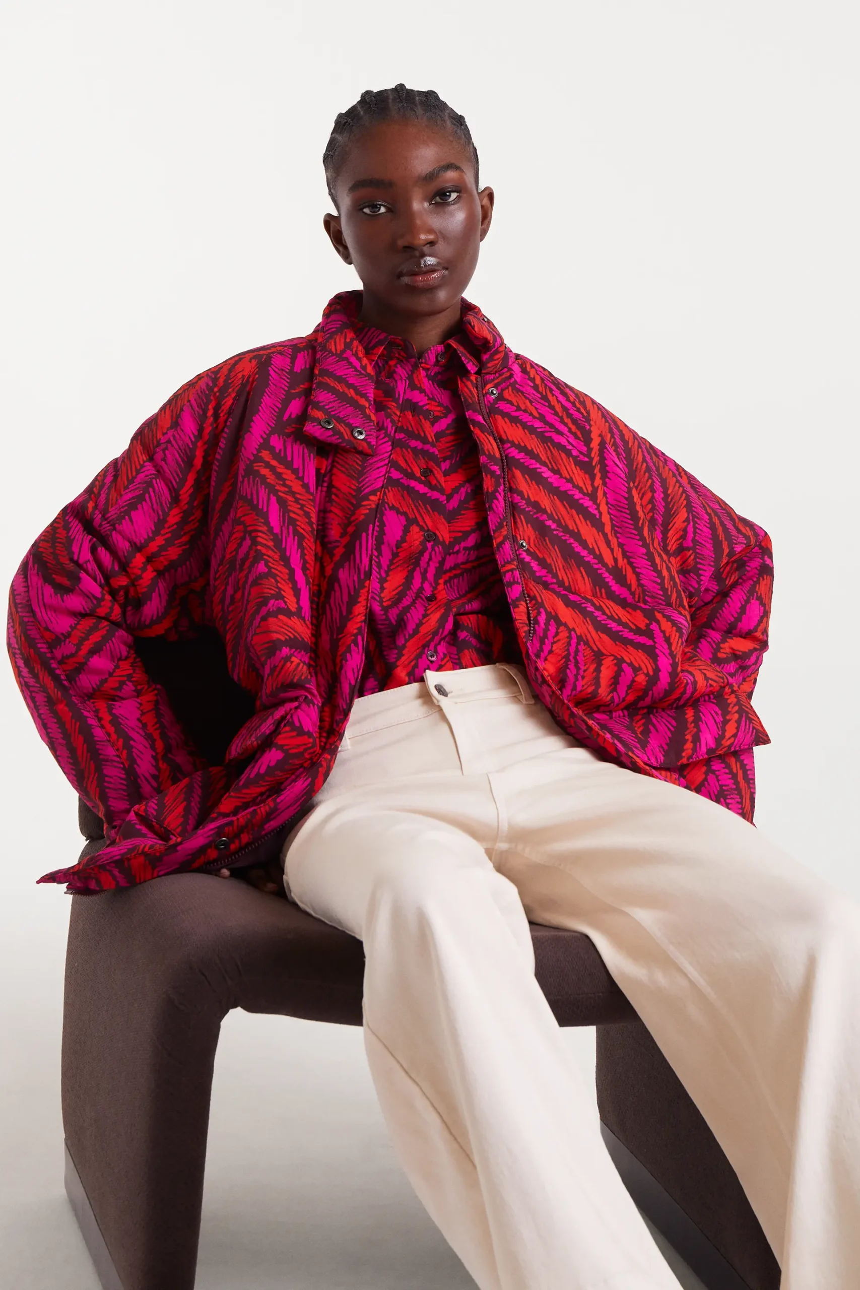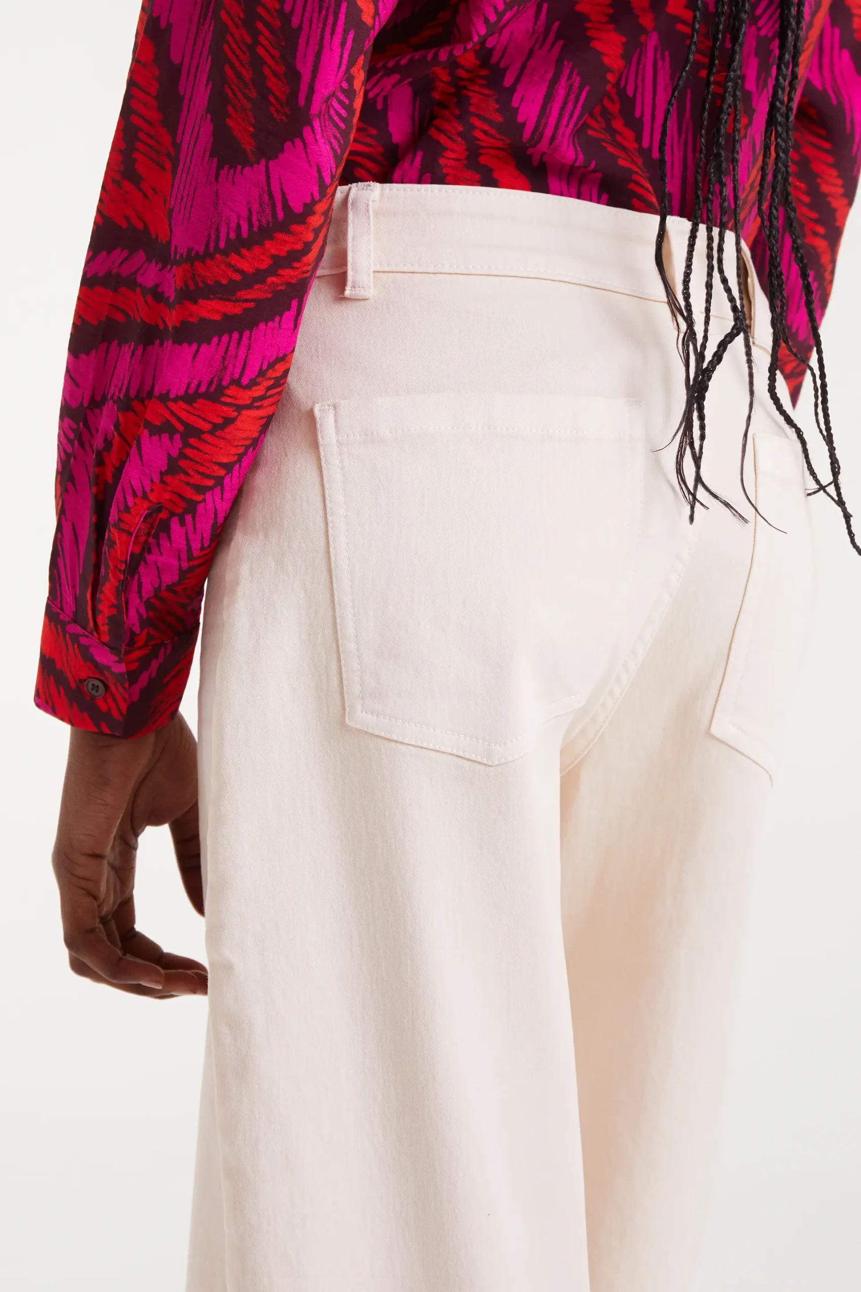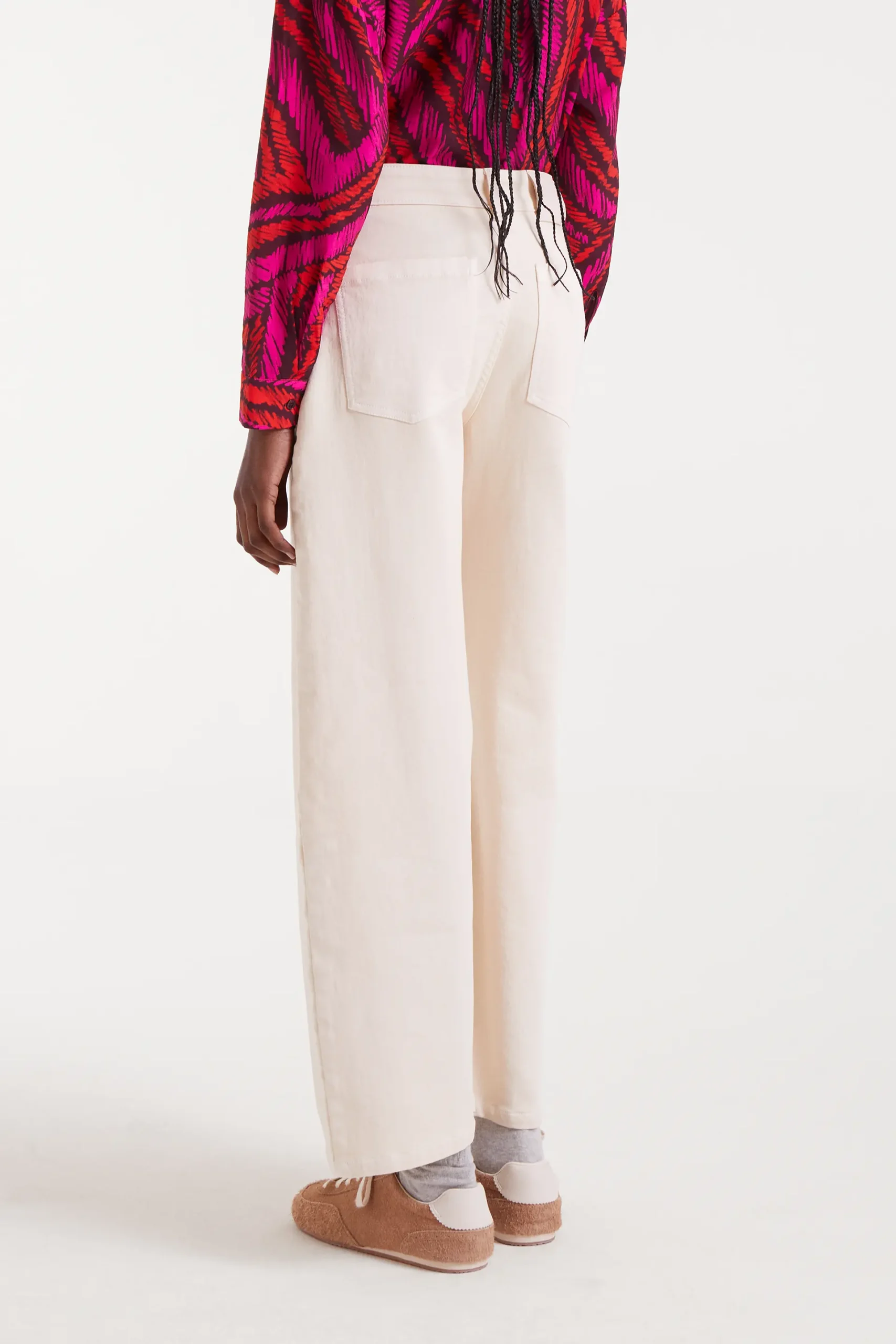Pantalón vaquero de color blanco con tejido de denim elástico. Tiro alto y pernera recta. Cierre frontal con cremallera y botón. Bolsillos laterales y traseros. La modelo mide 178 cm y lleva la talla S.