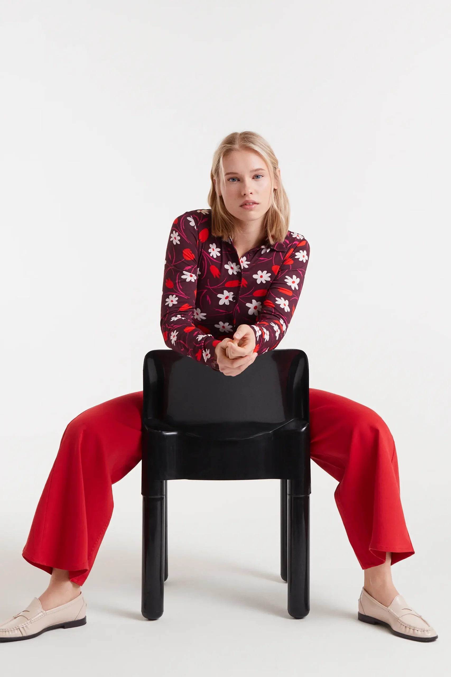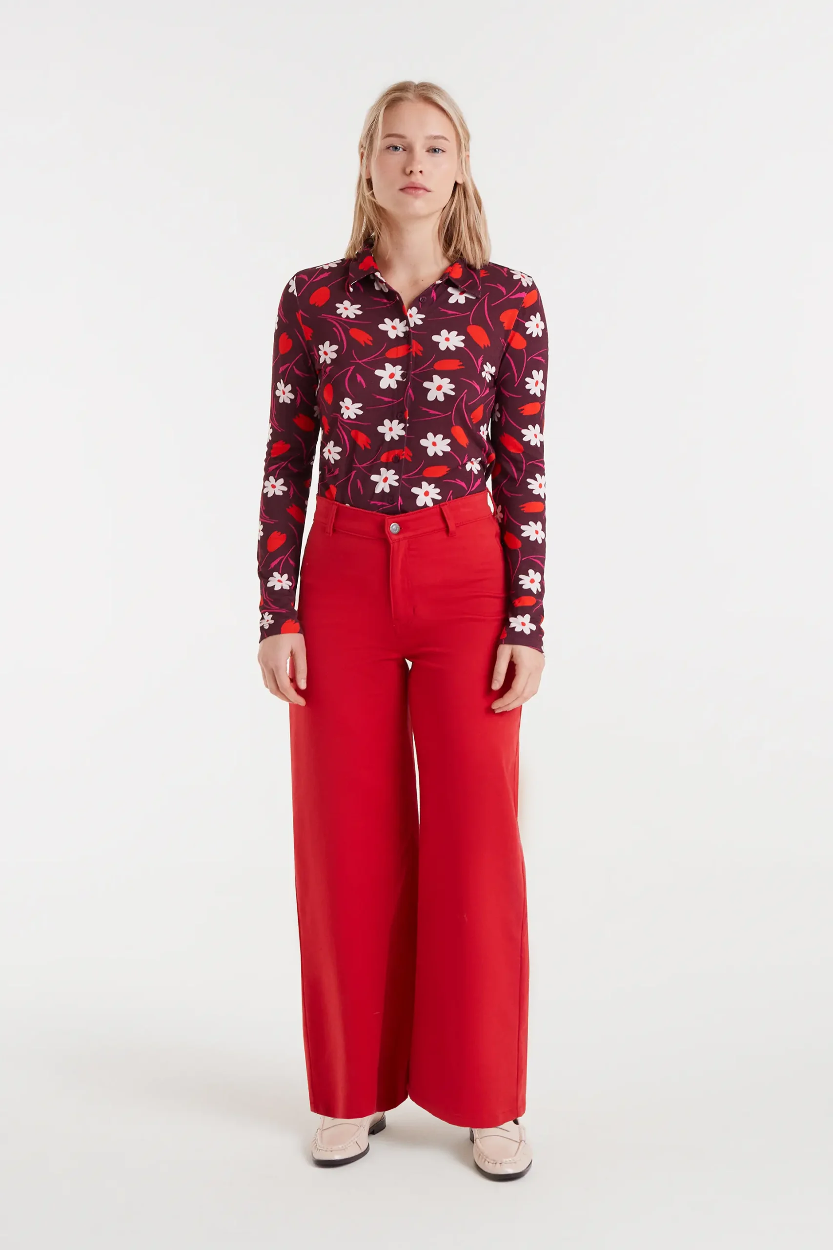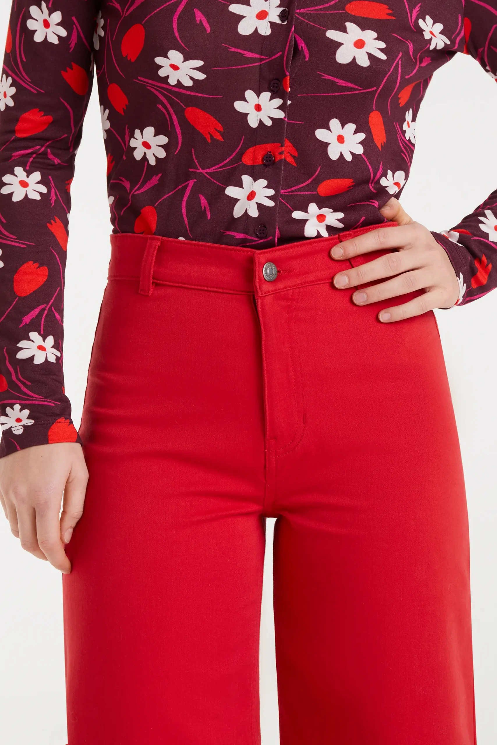 Pantalón vaquero de color rojo con tejido de denim elástico. Tiro alto y pernera recta. Cierre frontal con cremallera y botón. Bolsillos laterales y traseros. La modelo mide 174 cm y lleva la talla S.