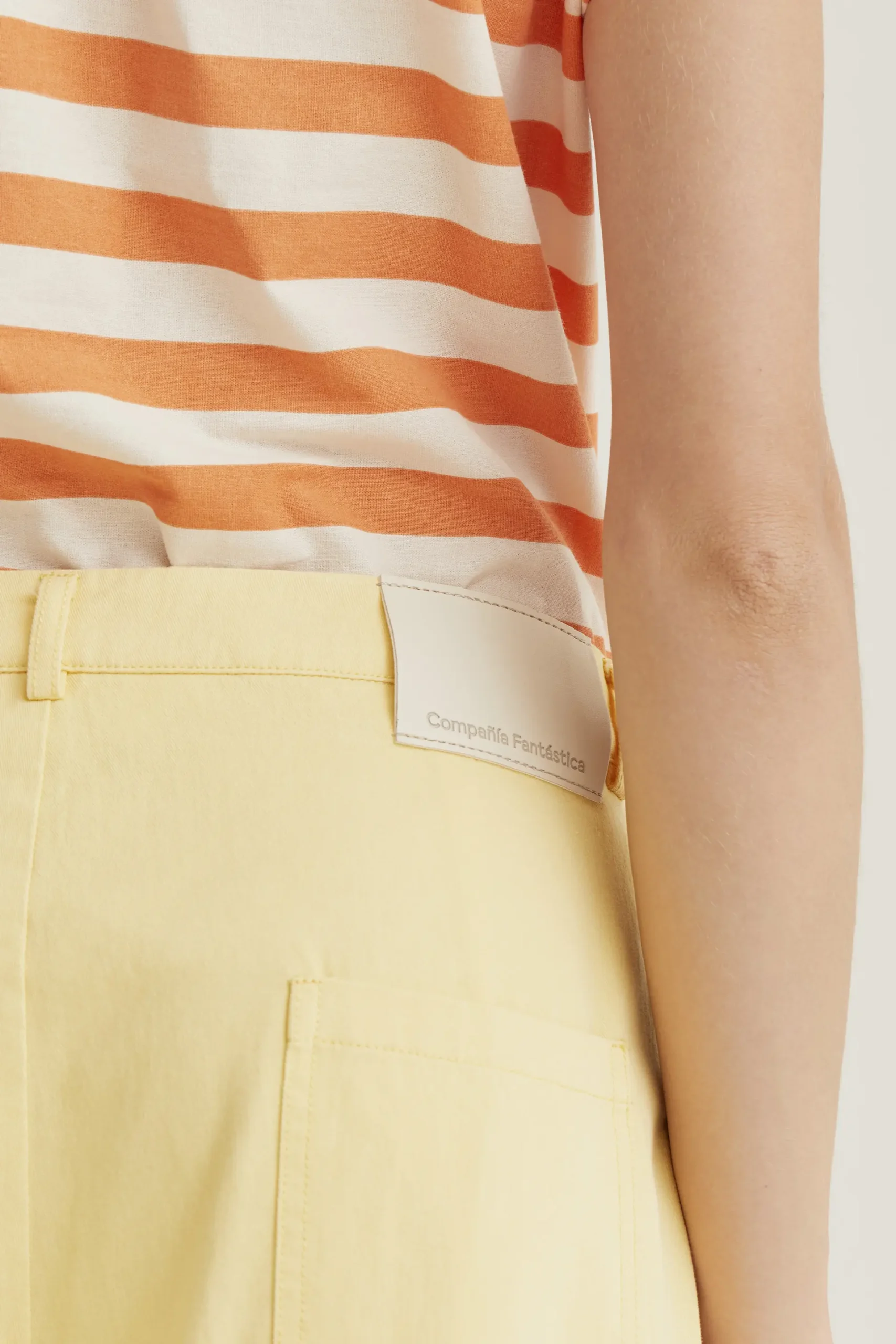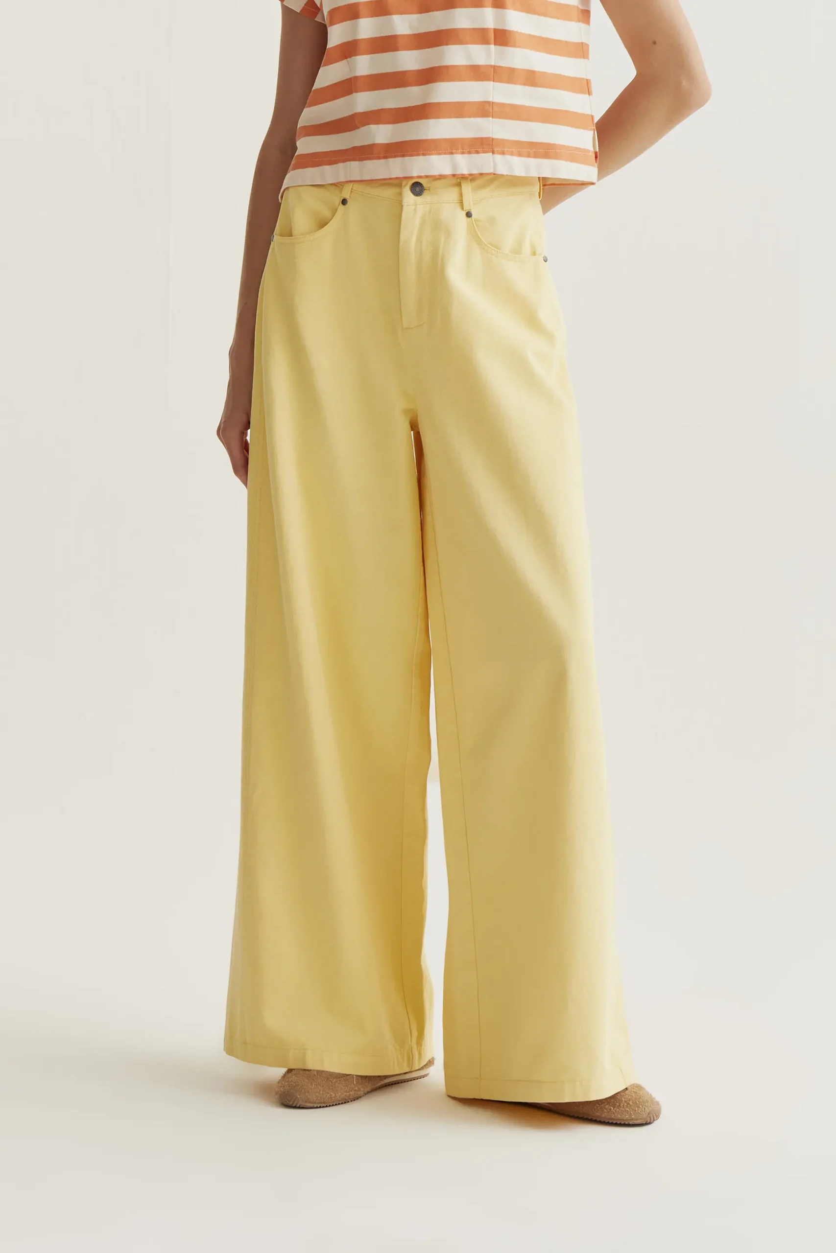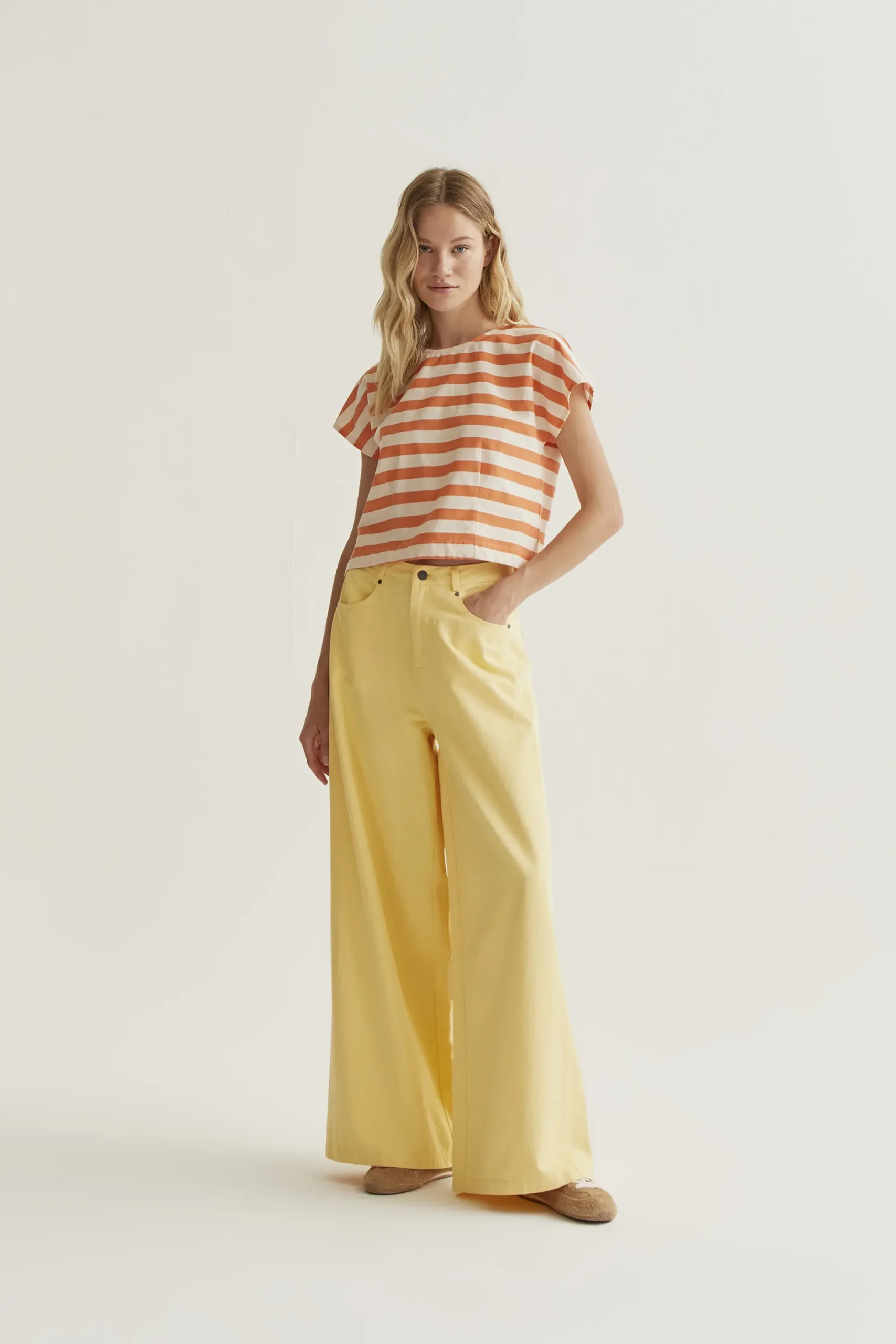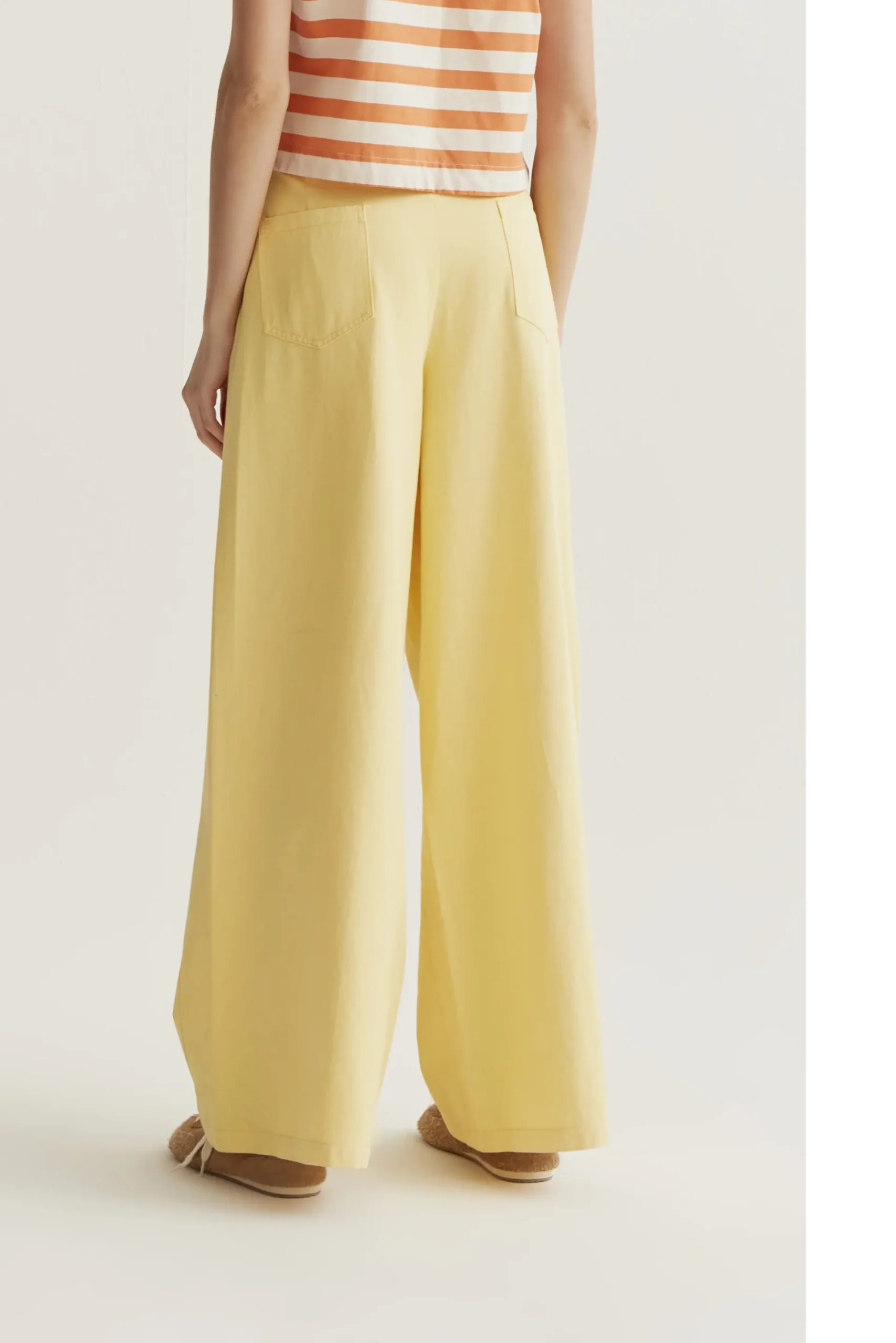 Pantalón con tejido 100% algodón de color amarillo. Cintura fija de tiro alto y pernera amplia. Cierre frontal con cremallera y botón. Bolsillos laterales y posterior. La modelo mide 177 cm y lleva la talla S.