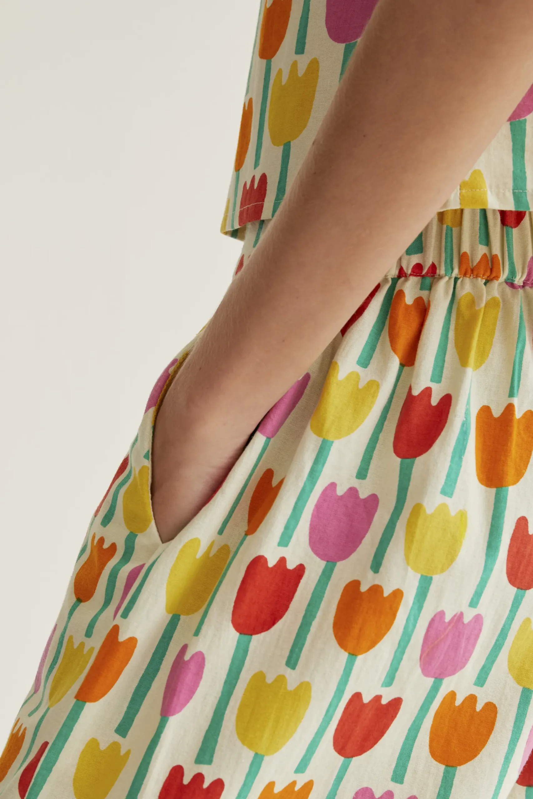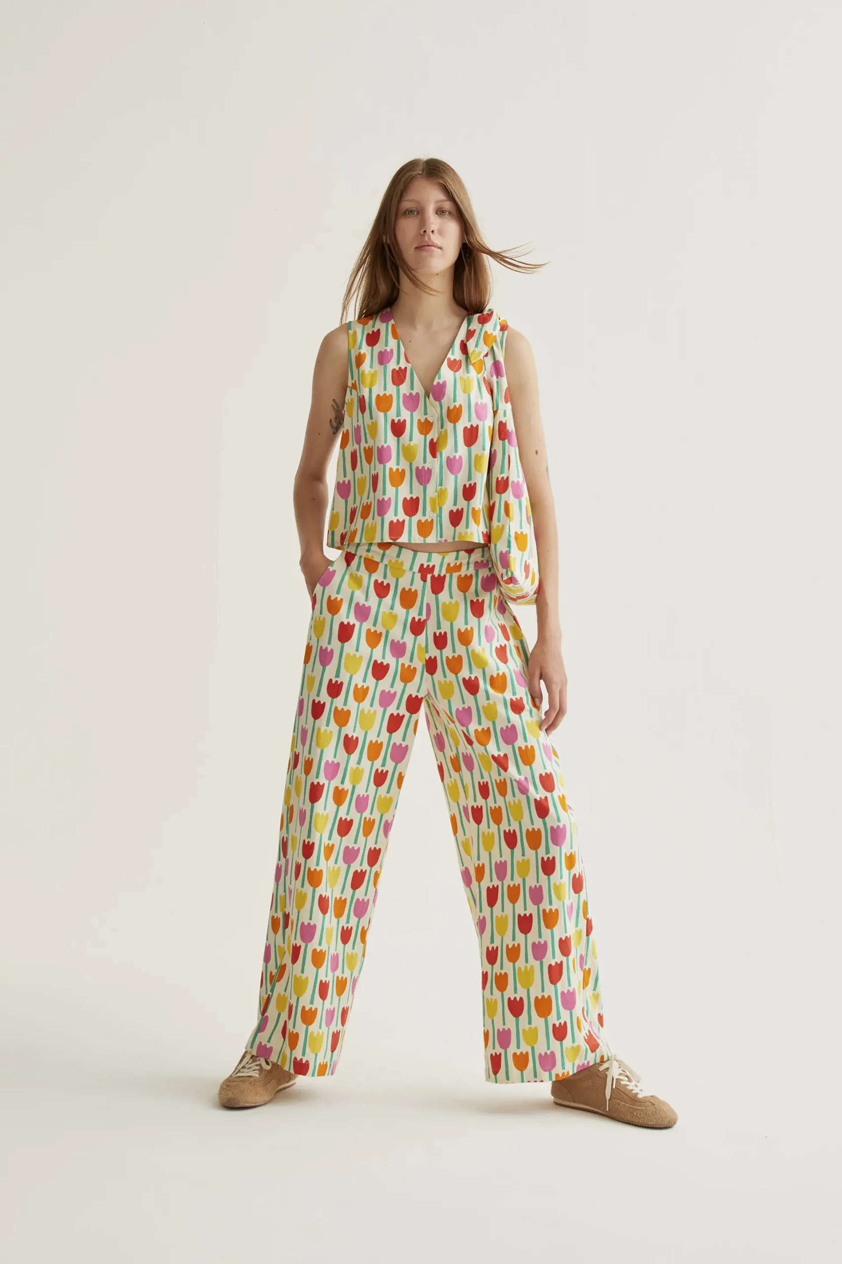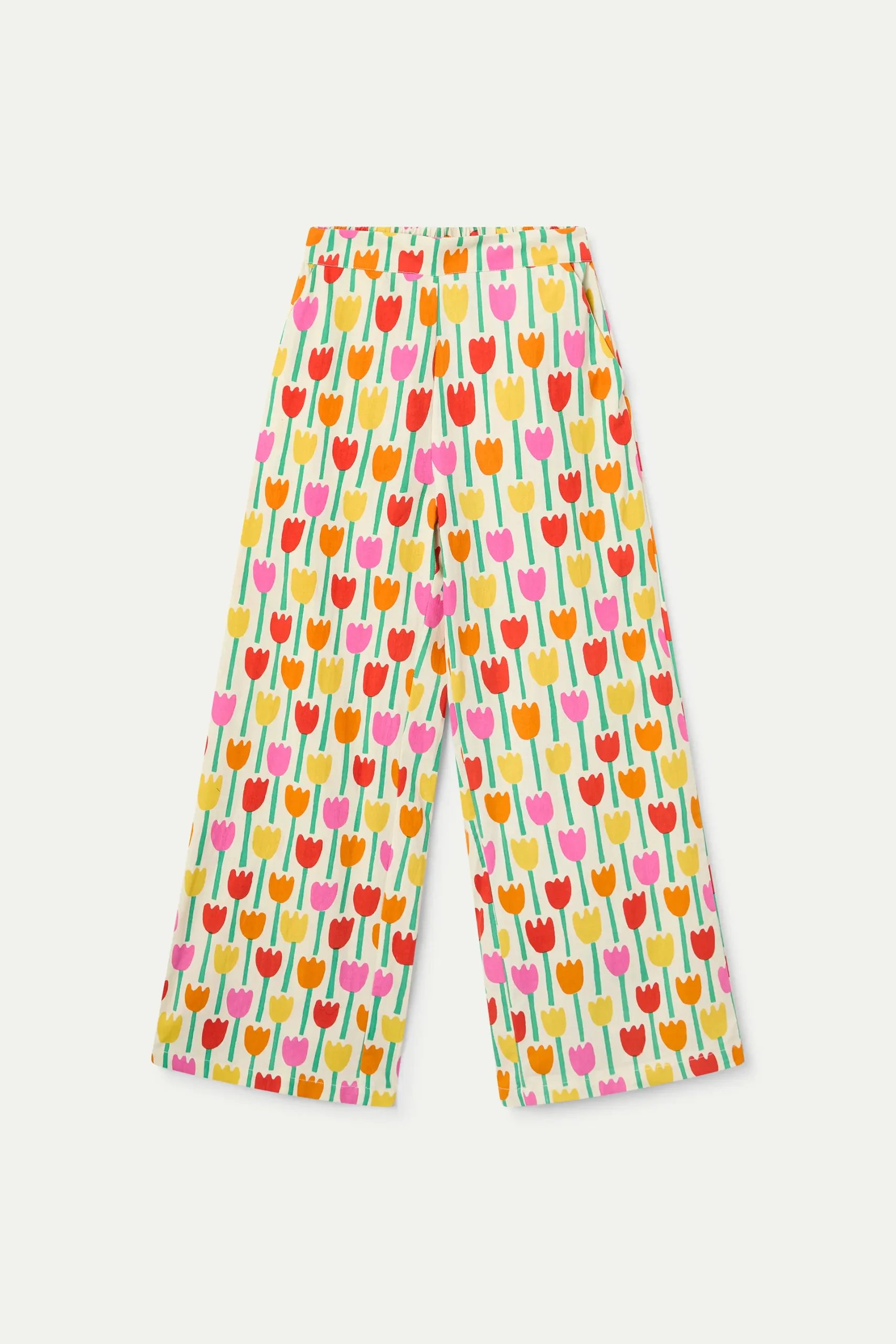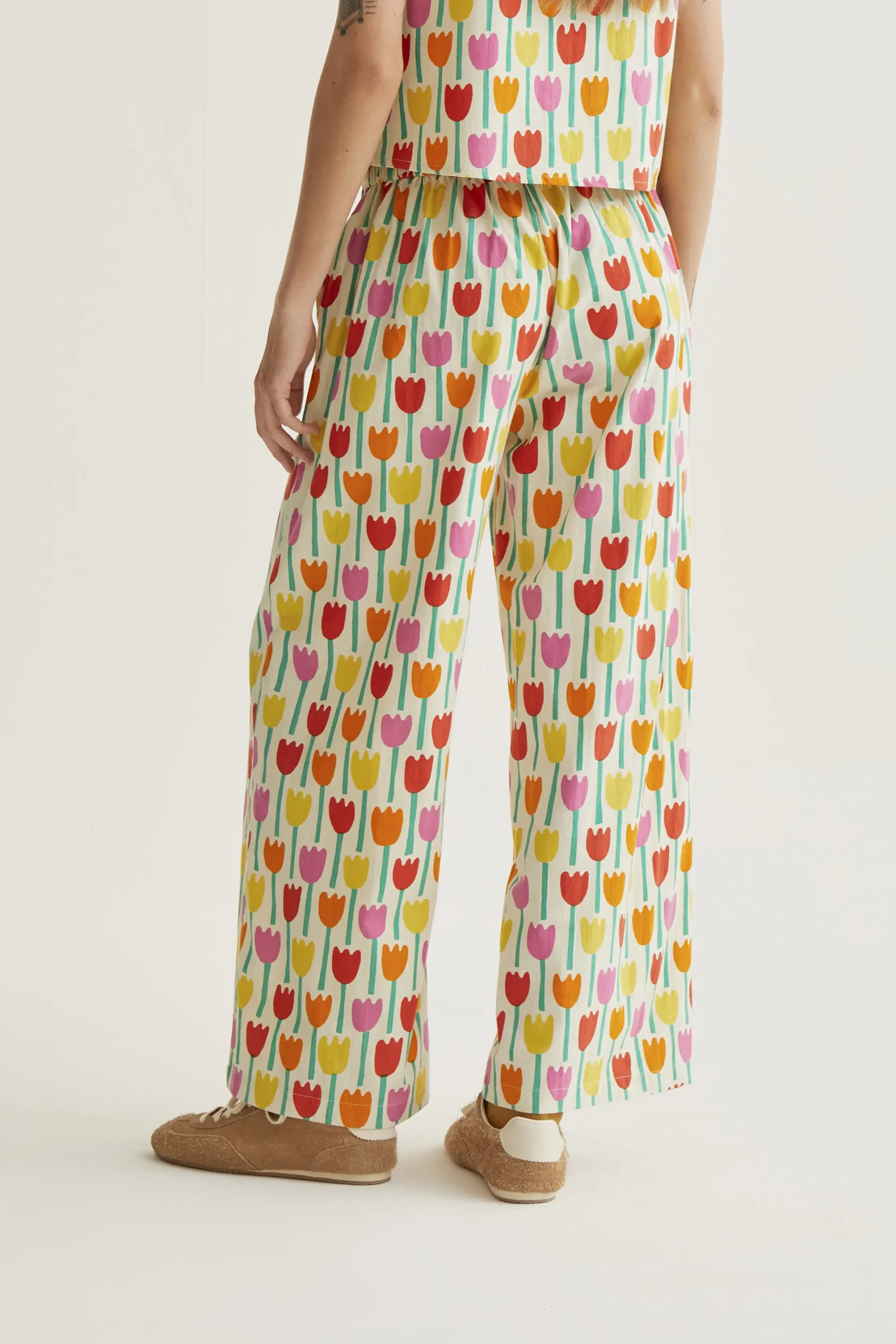 Pantalones de tejido 100% algodón con estampado tulipa. Cintura elástica de tiro medio. Pernera recta. Bolsillos laterales. La modelo mide 177 cm y lleva la talla S.