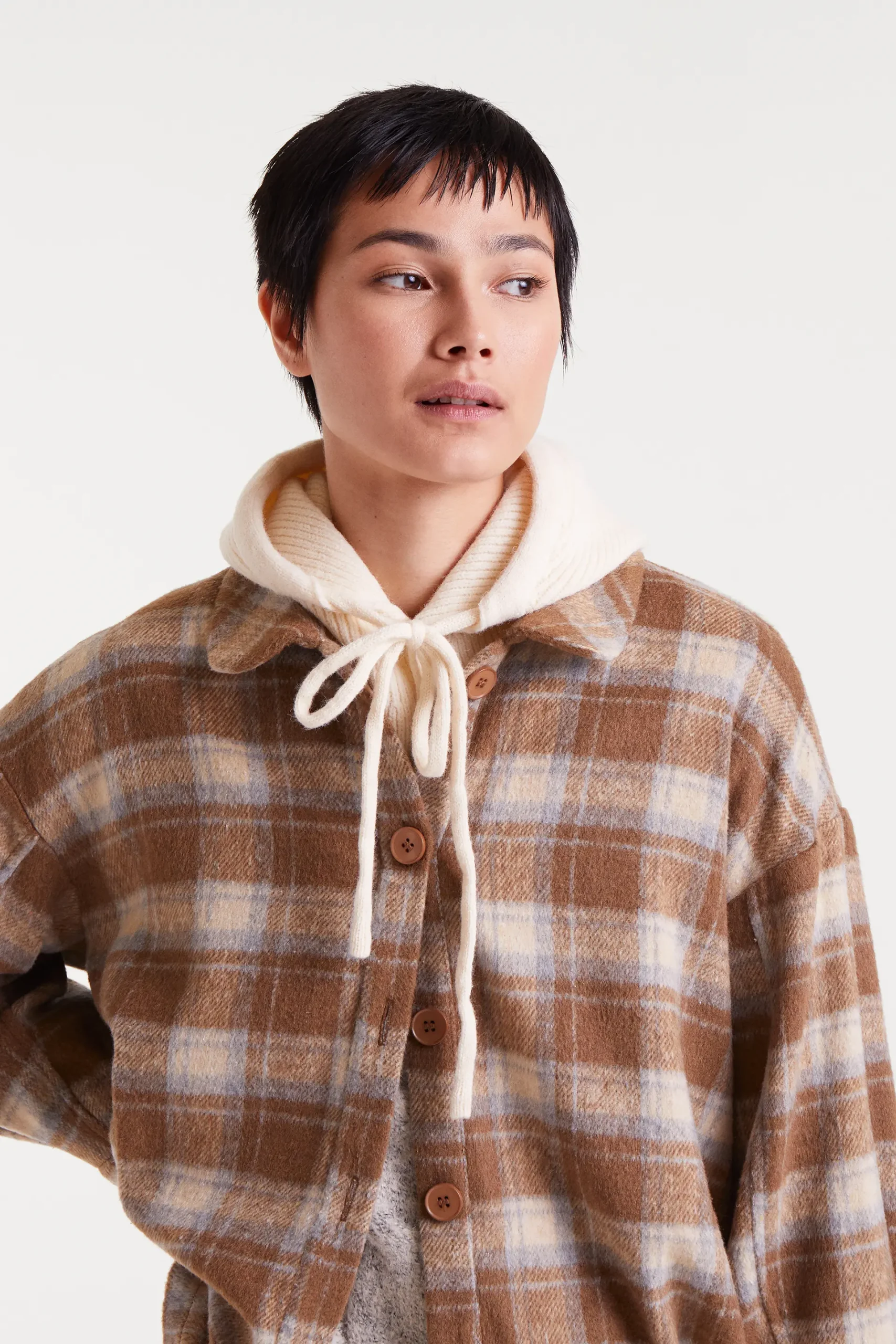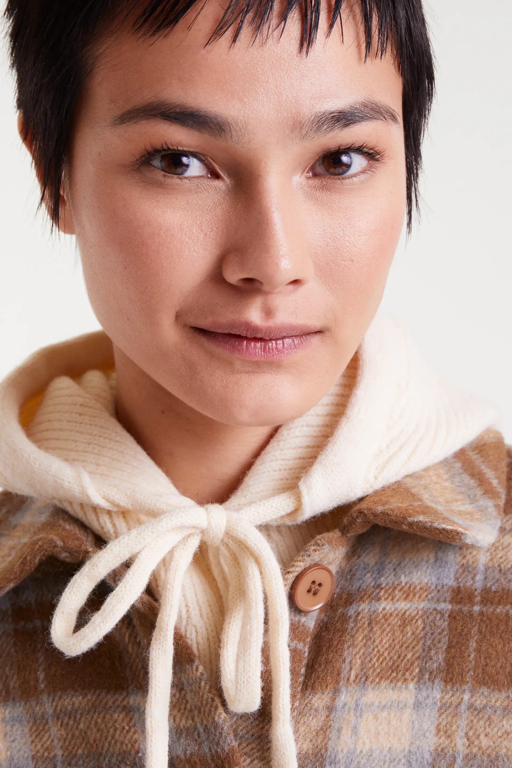 Pasamontañas con tejido punto fino de color blanco. Con lazada ajustable y detalles en botones. Talla única.