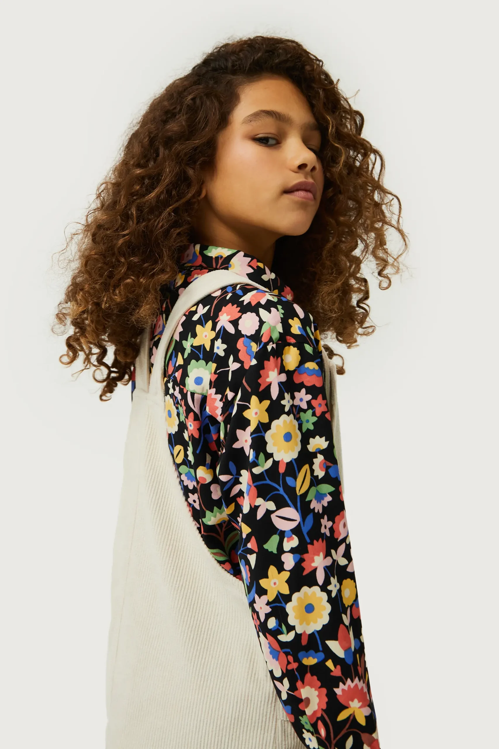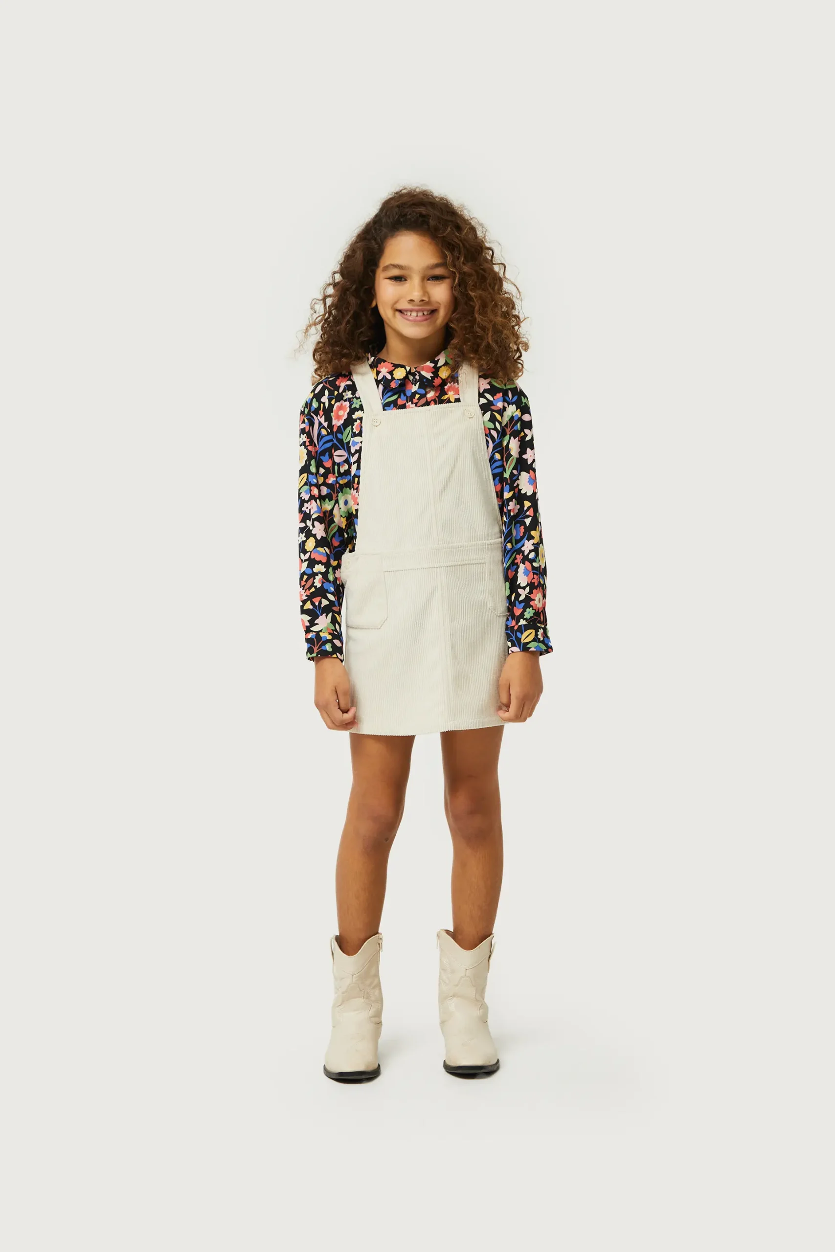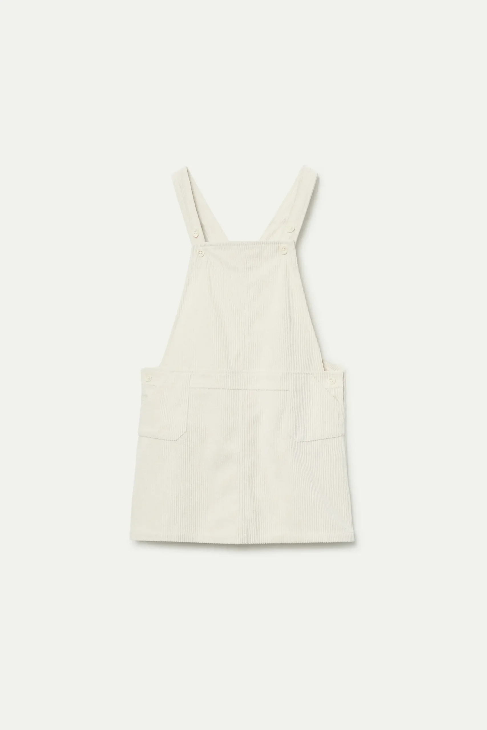 Vestido corto estilo pichi de niña de pana de color blanco roto. Con tirantes ajustables con botones. La modelo mide 134 cm y lleva la talla 8.