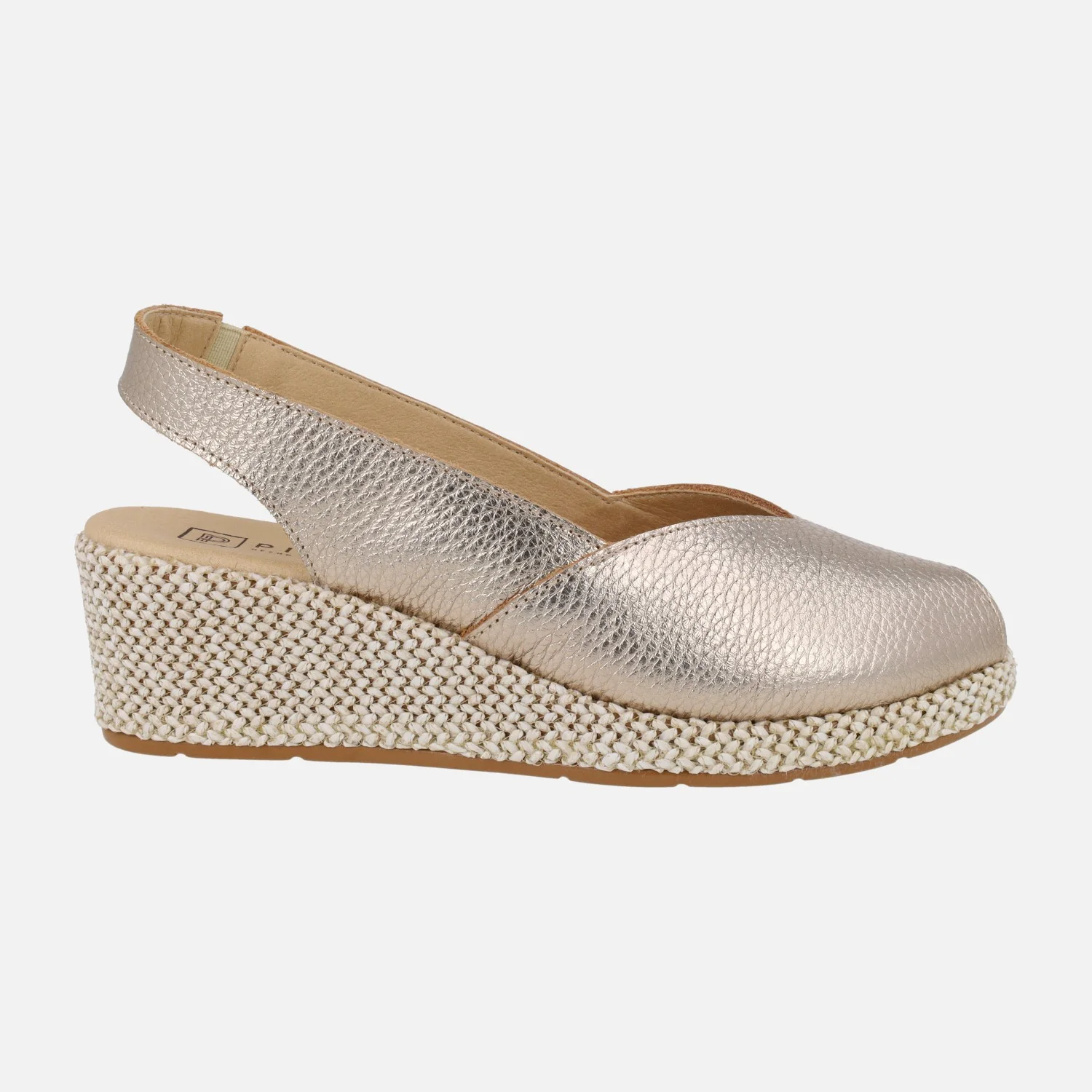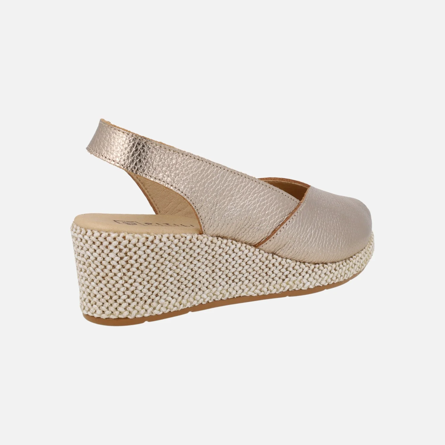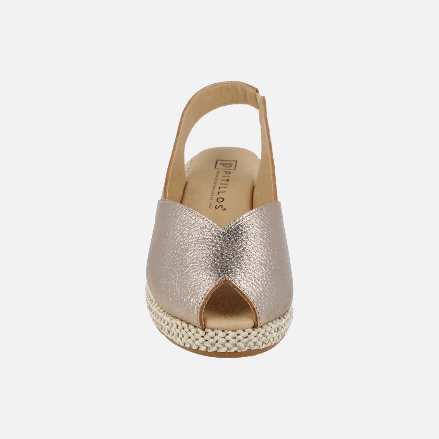 Preciosas zapatillas elaboradas en piel modelo 11300 de la marca Pitillos. Zapatillas de piel destalonadas, con puntera abierta y cuña imitando rafia. Disponibles en metalizado oro y en piel blanca lisa. Interior textil. Pieza elástica al talón para mejor calce y sujeción. Cuña de 5 cm de altura trasera con casi 2 cm de plataforma delantera.