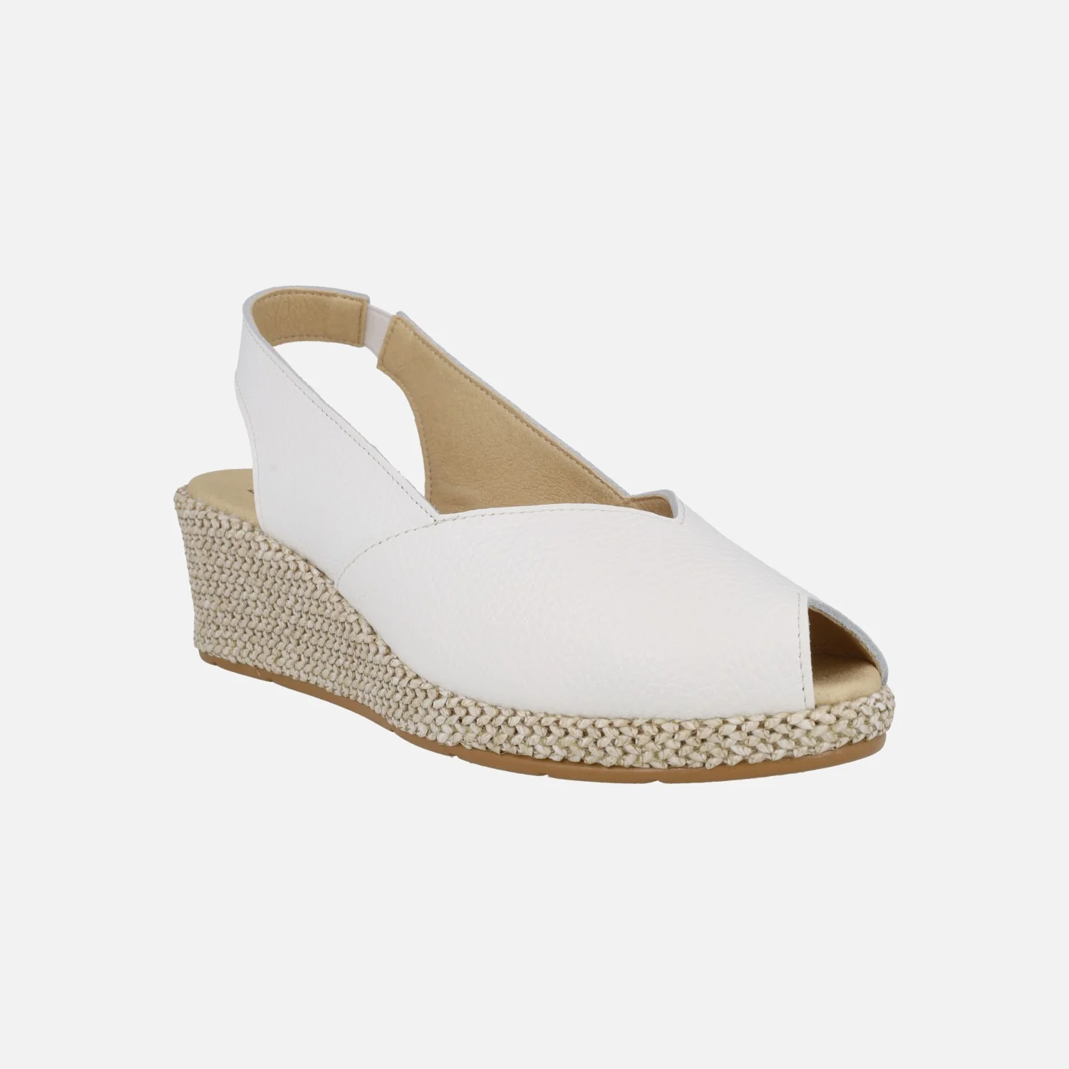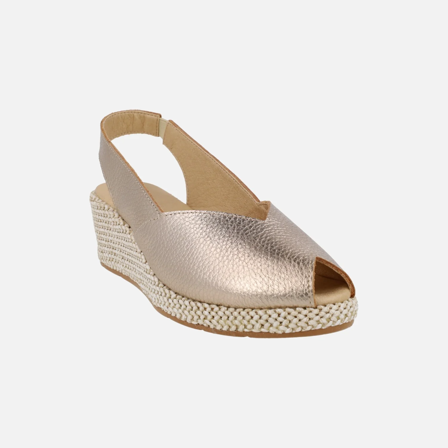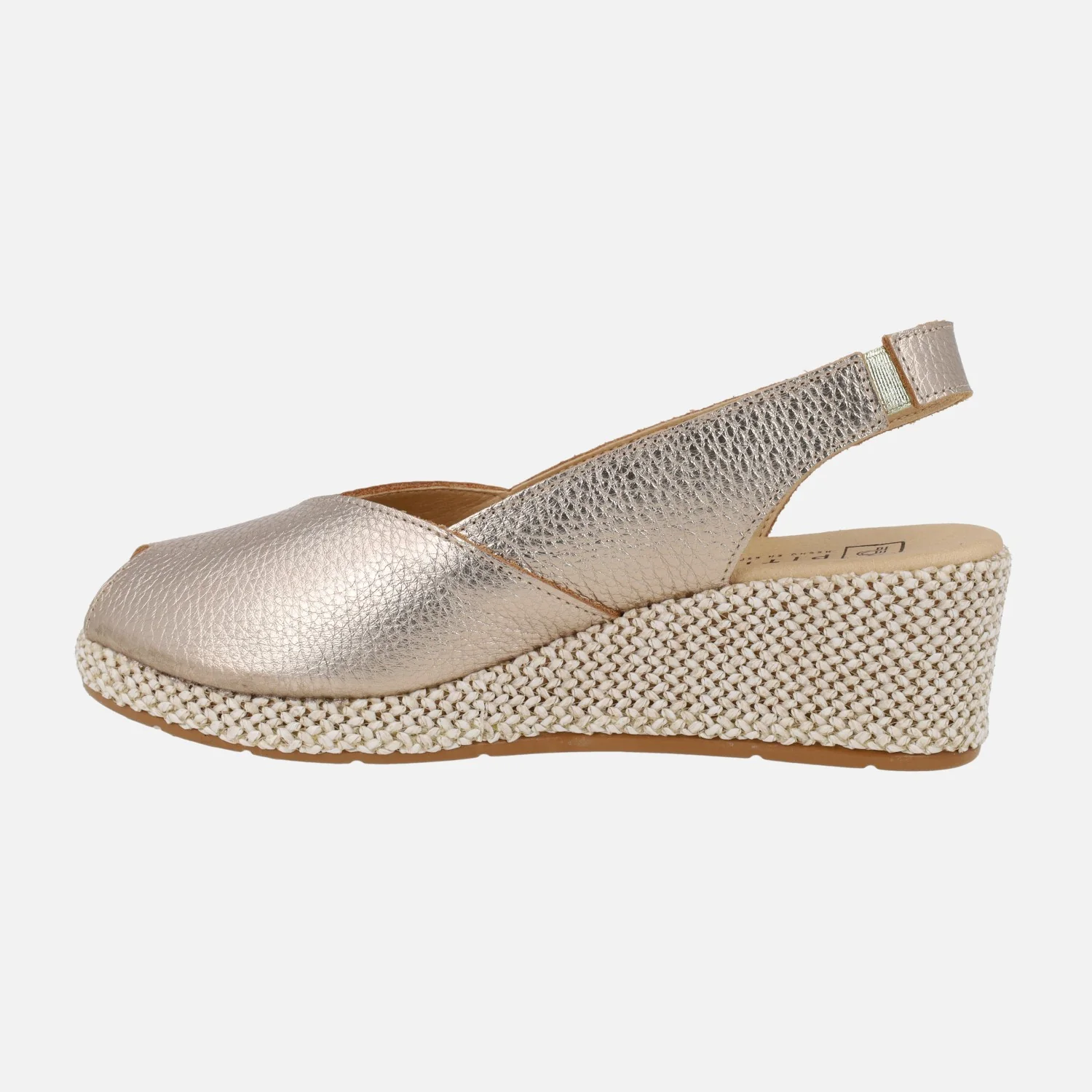 Preciosas zapatillas elaboradas en piel modelo 11300 de la marca Pitillos. Zapatillas de piel destalonadas, con puntera abierta y cuña imitando rafia. Disponibles en metalizado oro y en piel blanca lisa. Interior textil. Pieza elástica al talón para mejor calce y sujeción. Cuña de 5 cm de altura trasera con casi 2 cm de plataforma delantera.
