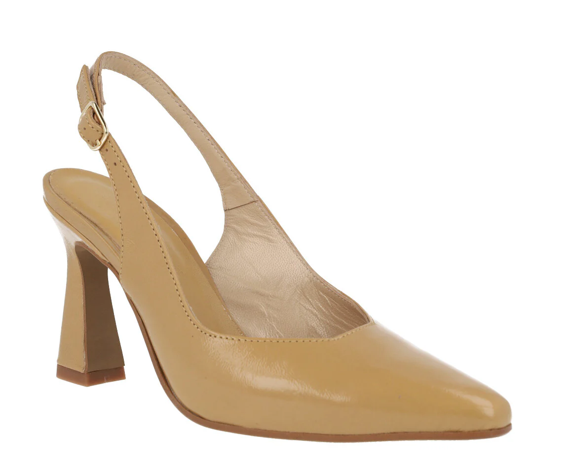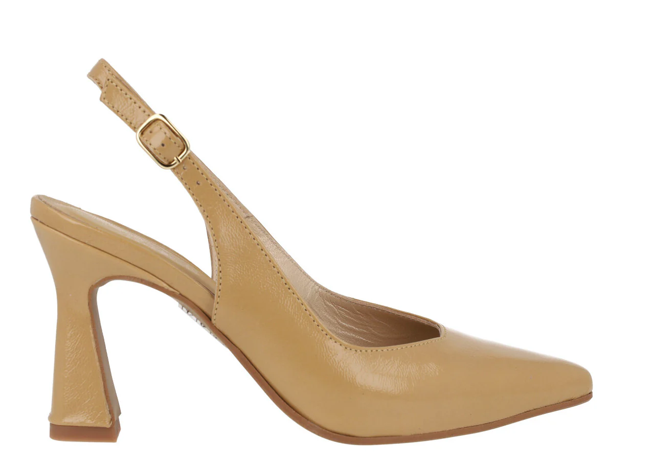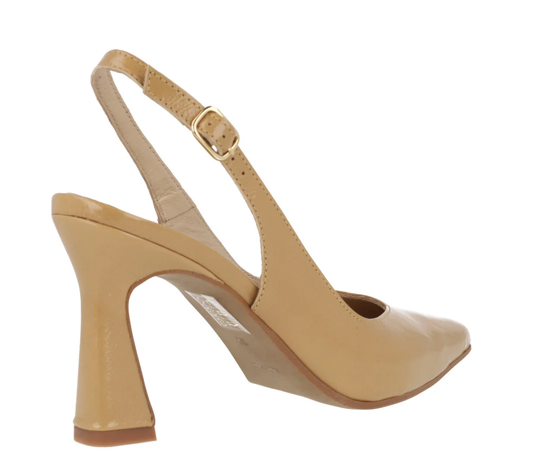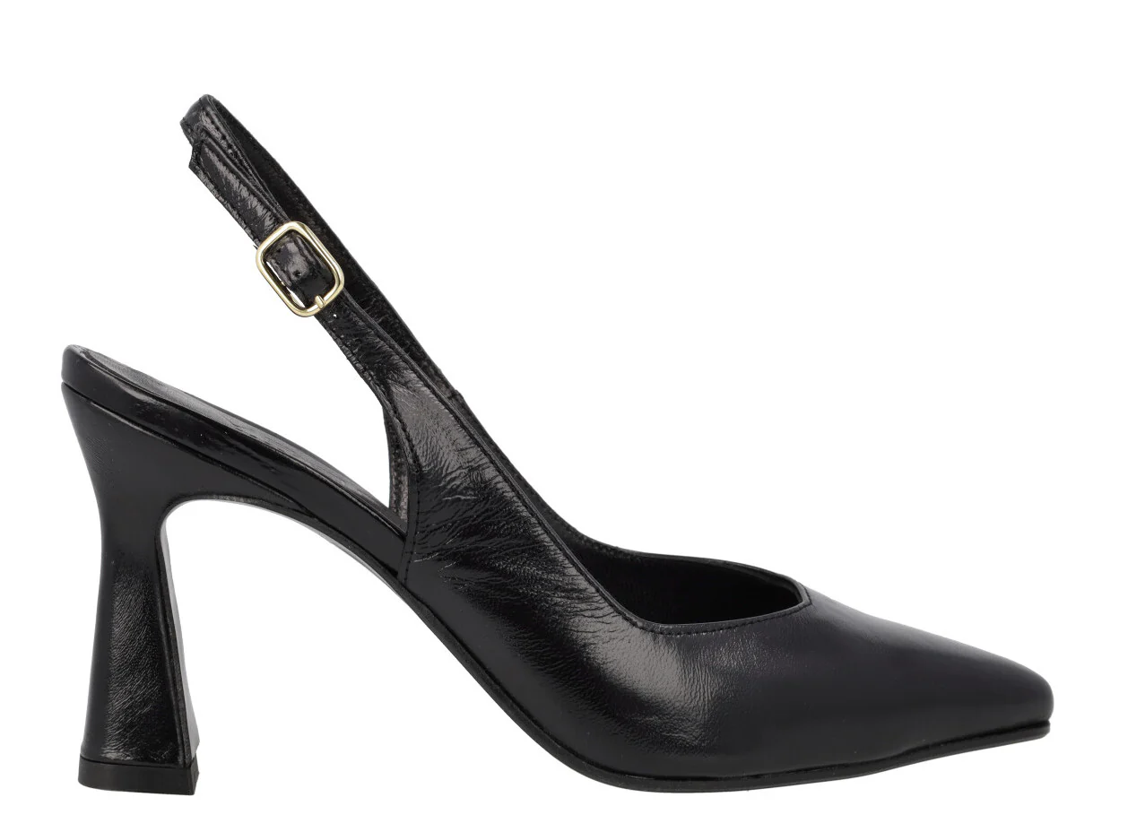 Salones destalonados para mujer de la marca Vexed, modelo Ainhara. Elaborados en piel brillo, acharolada, en color negro o camel. Tira al talón con cierre de hebilla. Forro y planta de piel. Tacones forrados de 10 cms de altura.