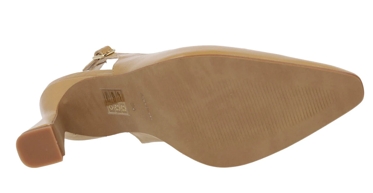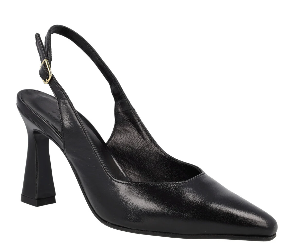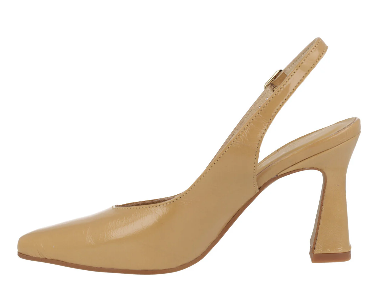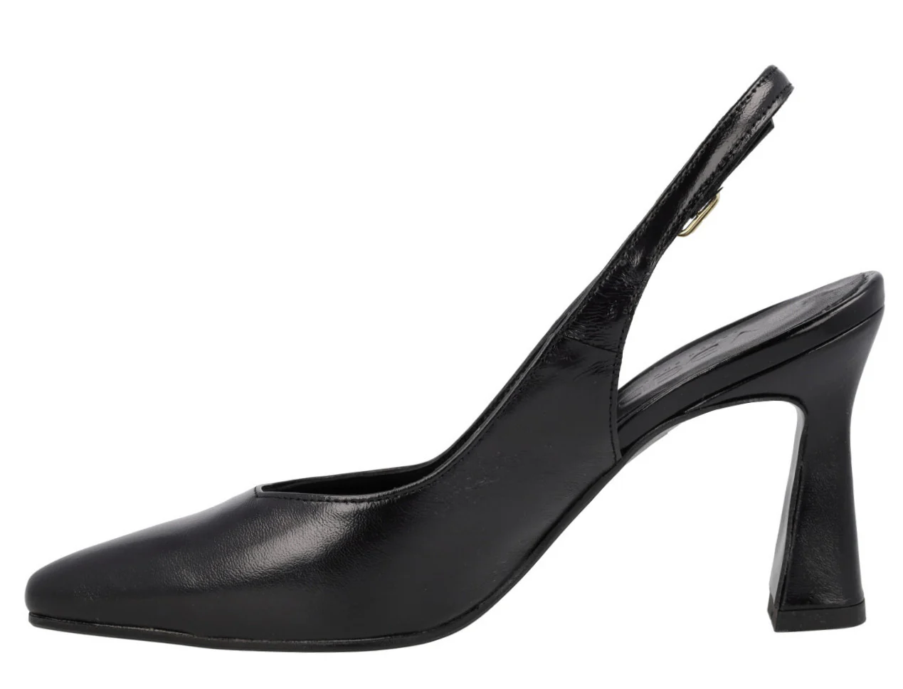 Salones destalonados para mujer de la marca Vexed, modelo Ainhara. Elaborados en piel brillo, acharolada, en color negro o camel. Tira al talón con cierre de hebilla. Forro y planta de piel. Tacones forrados de 10 cms de altura.