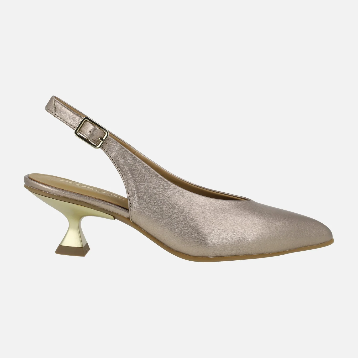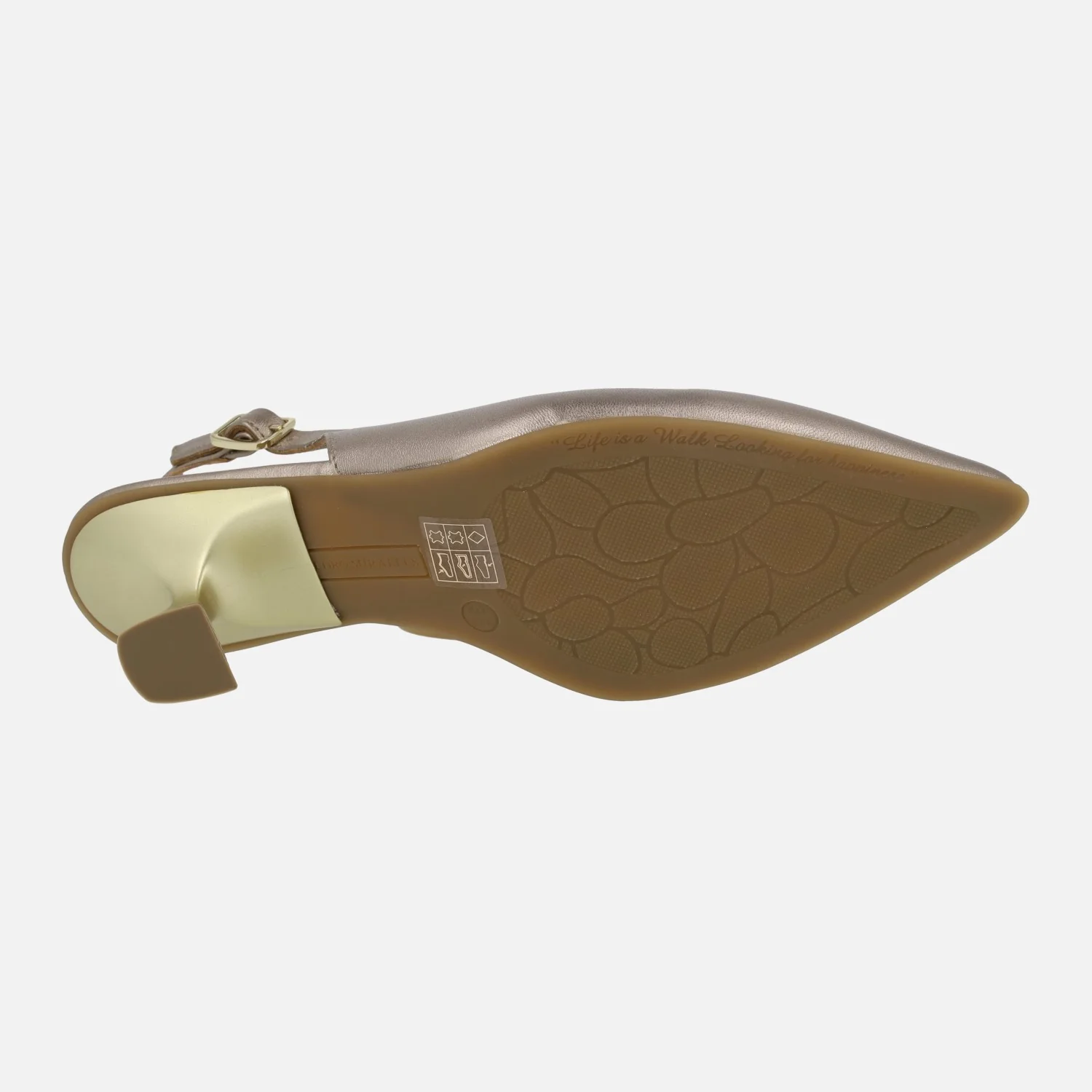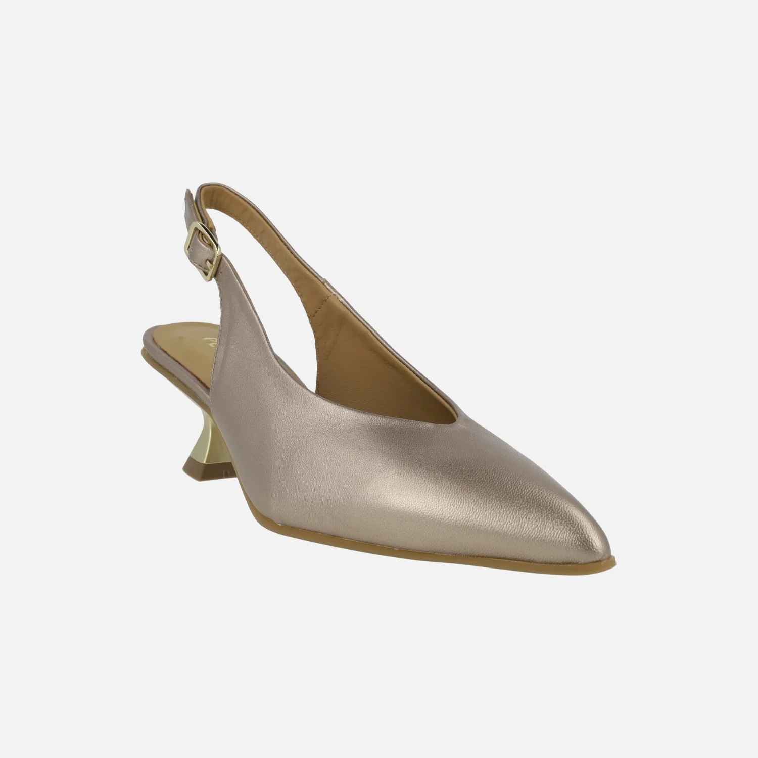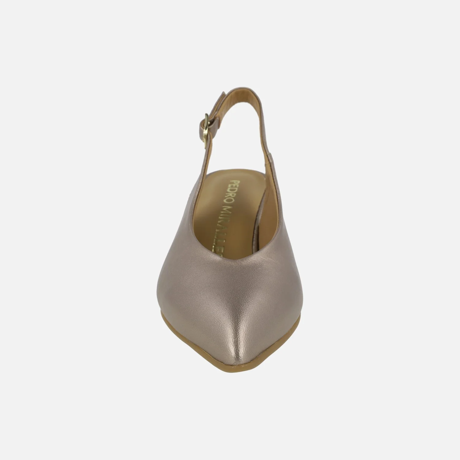 Zapatos destalonados modelo Elba de la marca Pedro Miralles, modelo 18640 Napa metal Humo. Salones con puntera ligeramente afilada, elaborados en piel metalizada humo (similar al bronce claro) con tira al talón ajustable con hebilla, destalonados. Interiores forrados de piel. Tacones bajos, dorados, de 5 cm de altura.