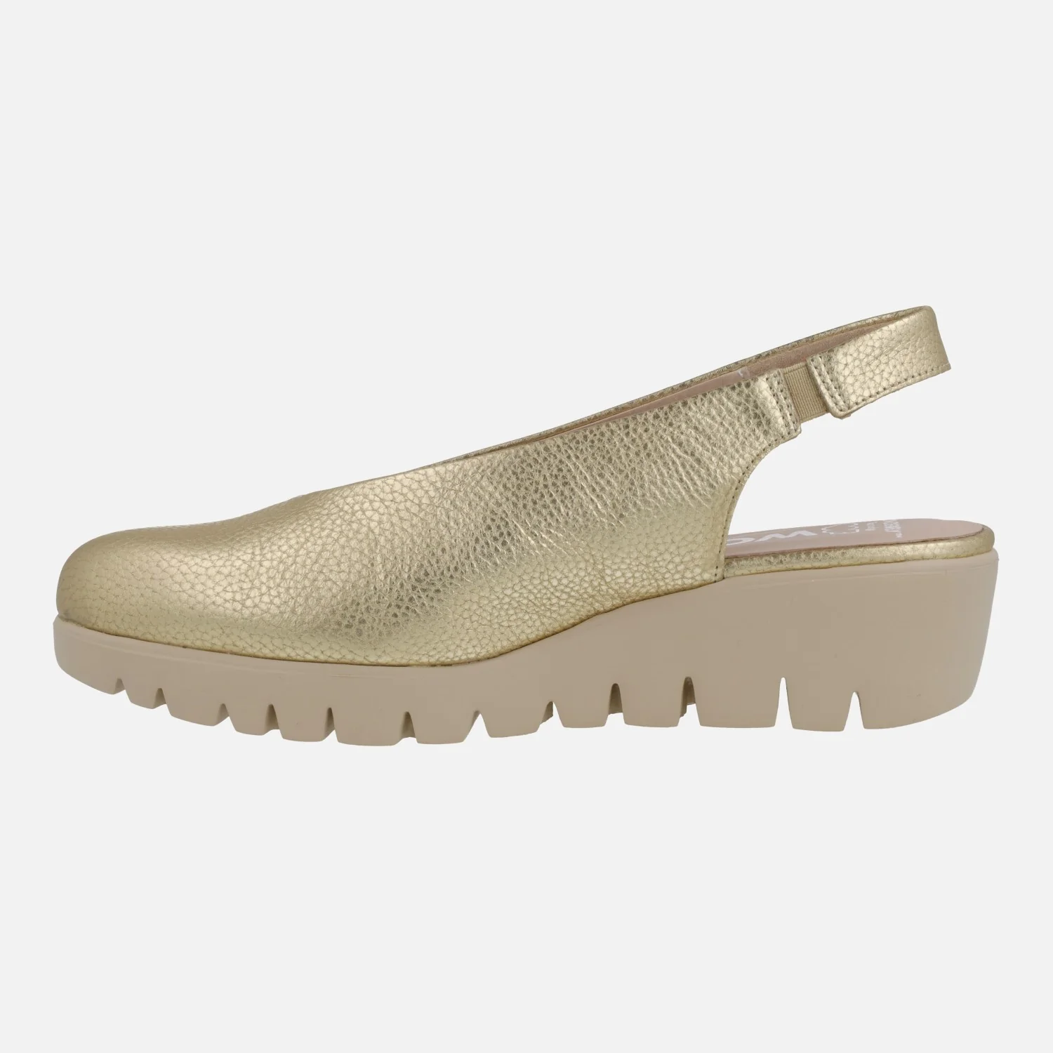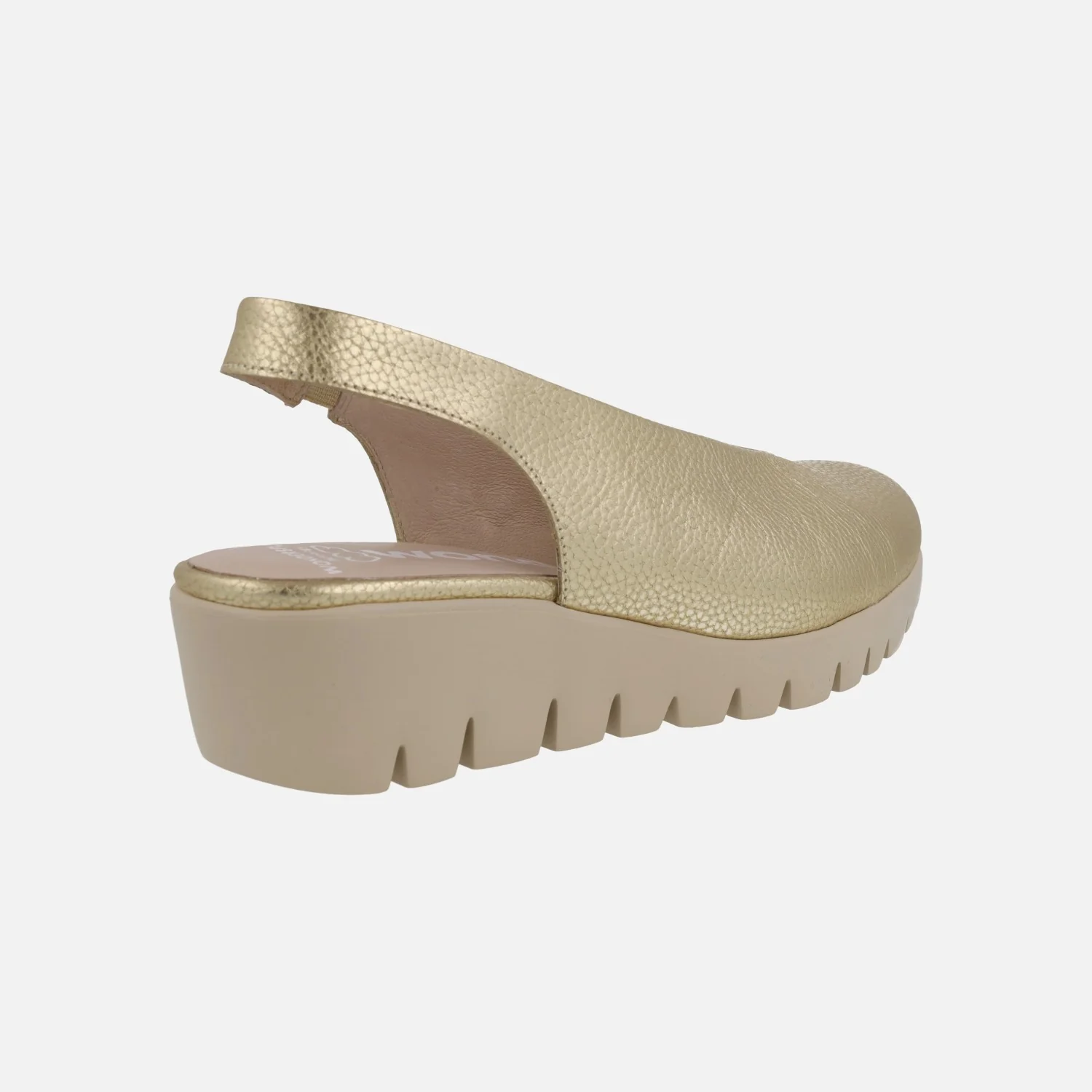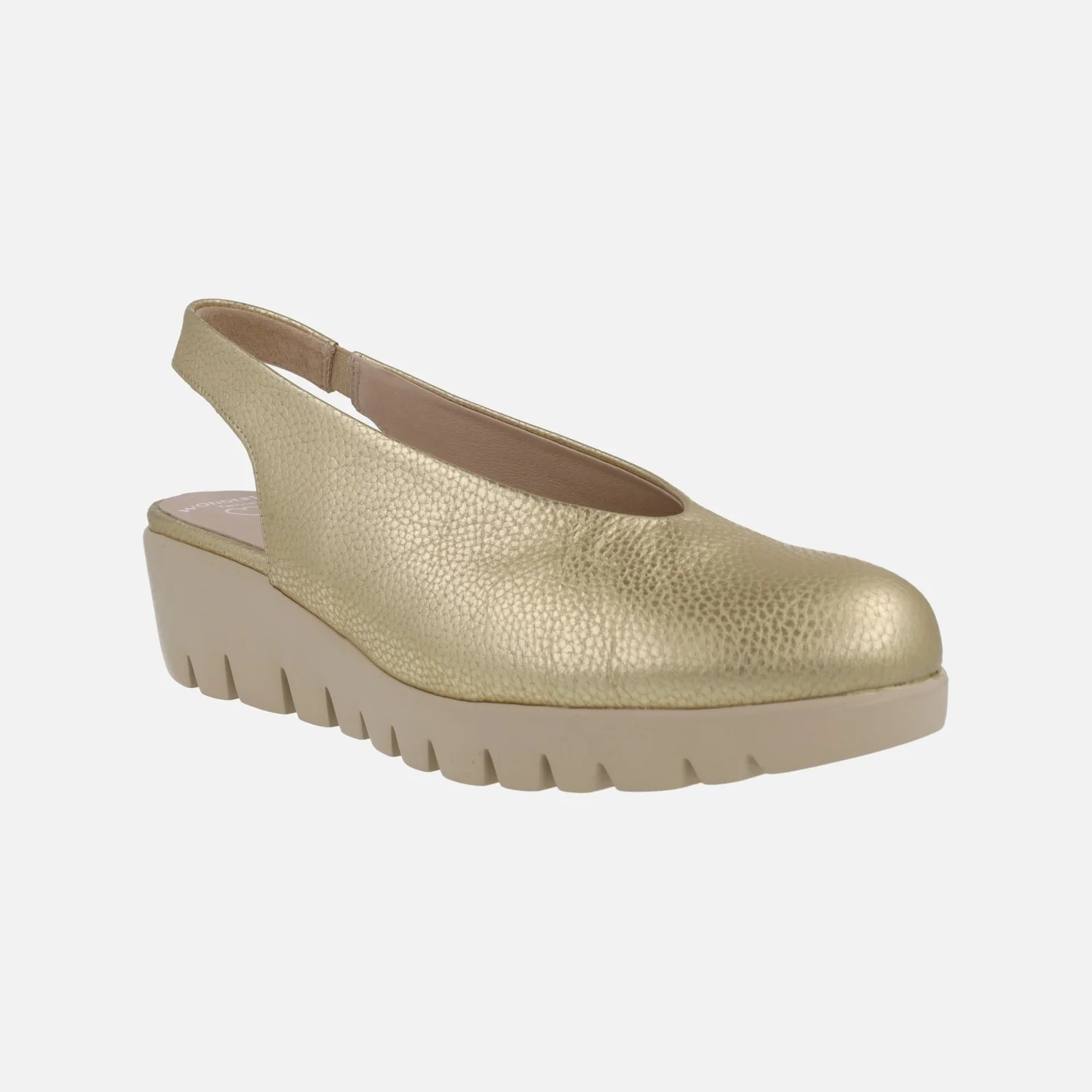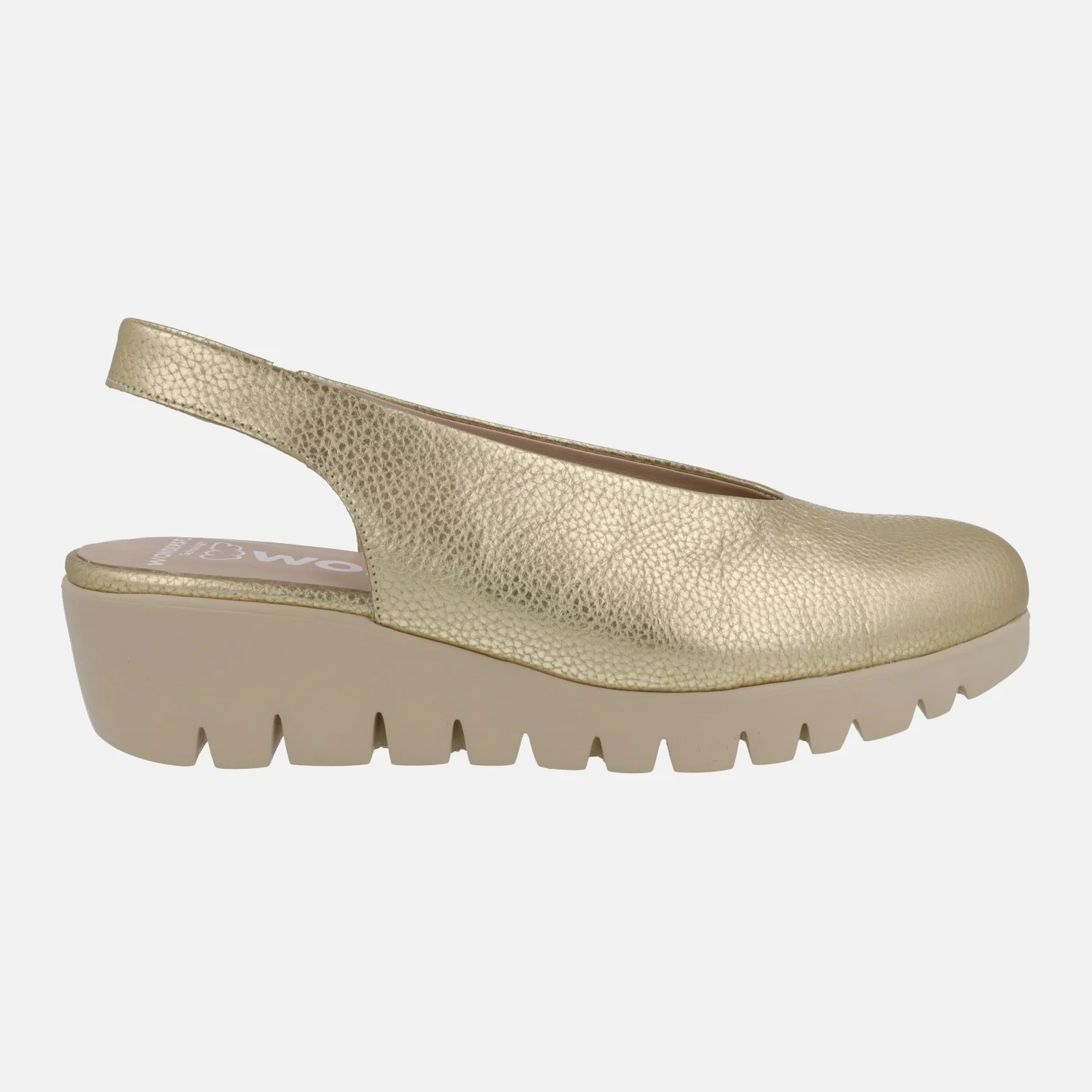 Salones confort destalonados para mujer de la marca Wonders modelo c-33152 Max Platino. Salones de piel en color oro, con planta y forro de piel. Tira al talón con pieza elástica para mejor calce y sujeción. Suela dentada super ligera WONDERSFLY de goma EVA, con una altura de 5 cms en la parte trasera (2 cms parte delantera). Muy ligeros y confortables. Made in Spain.