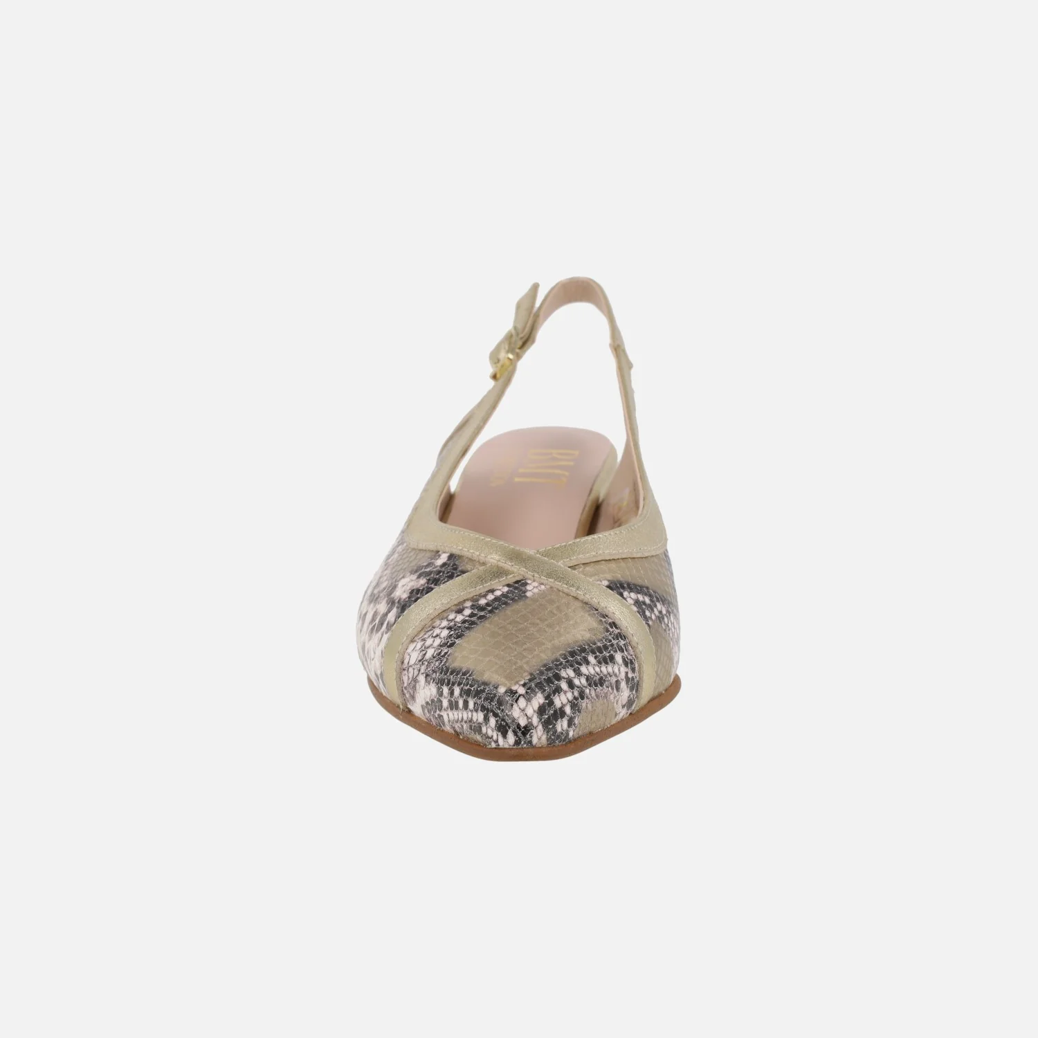 Salones de piel destalonados de la marca Barminton, modelo 14022 Champagne. Salones elaborados en piel print serpiente combinada con metalizado oro. Tira al talón con cierre de hebilla ajustable. Interiores en combinado de piel y tejido. Tacones bajos, de 5 cms de altura. Suela sintética. Made in Spain.
